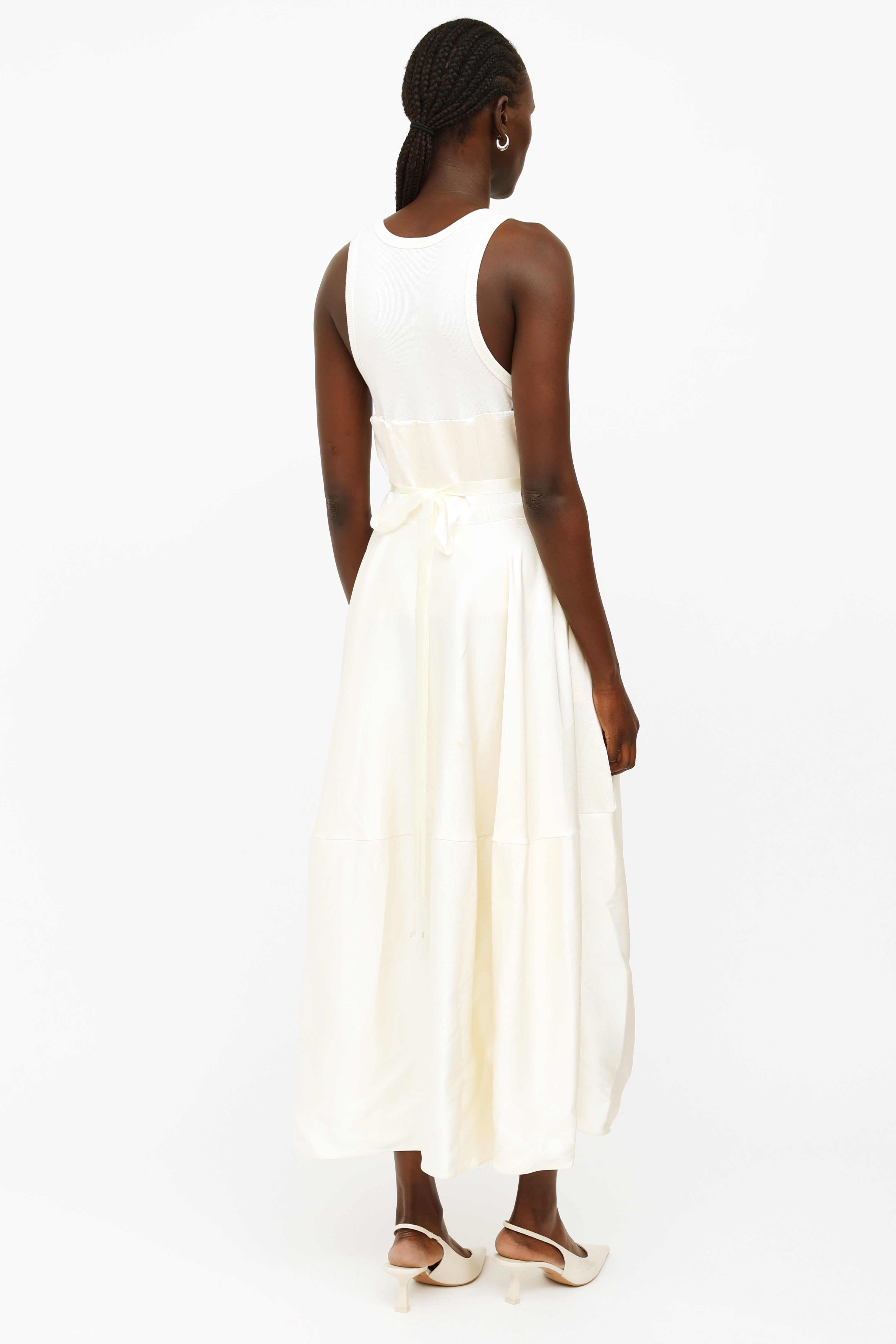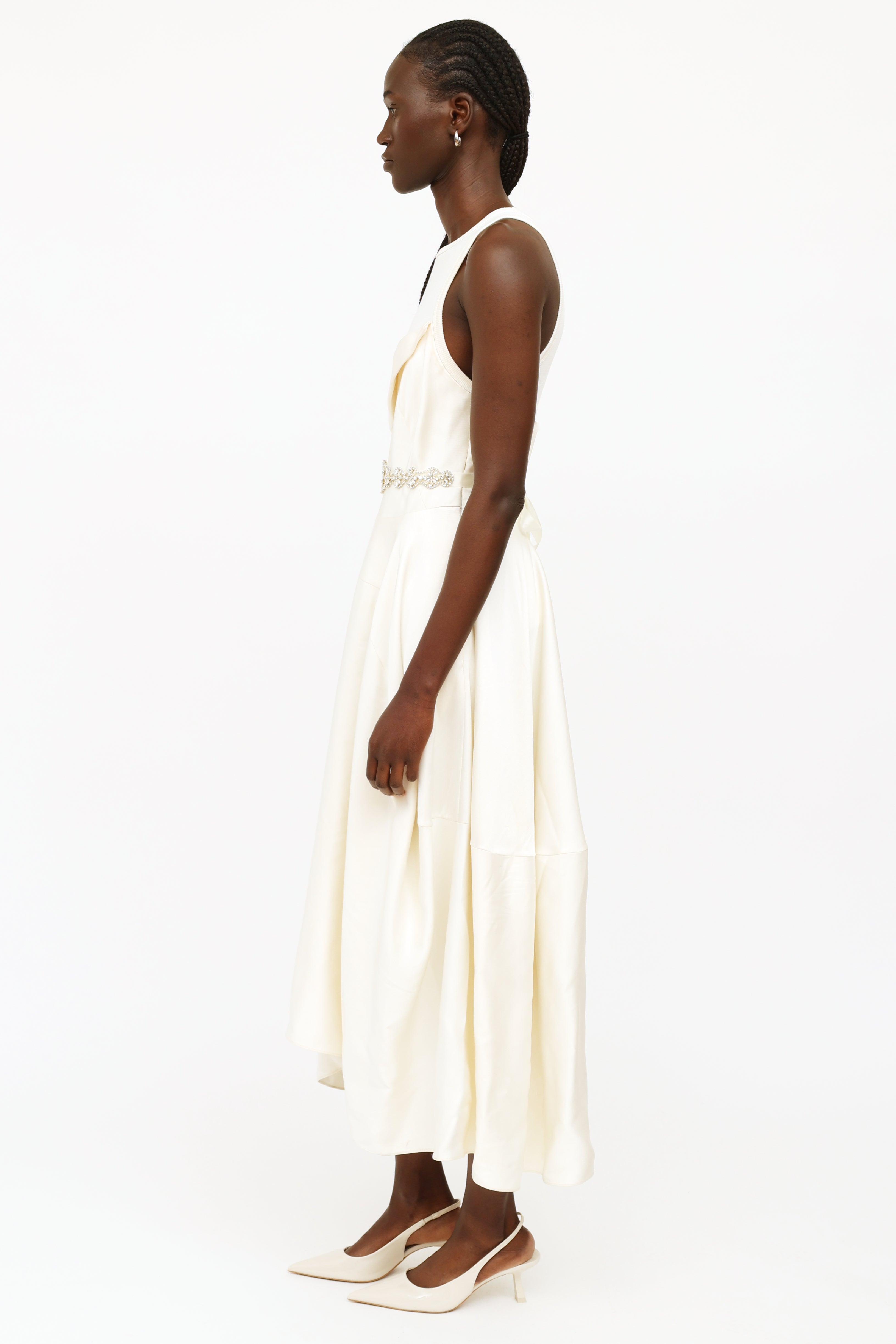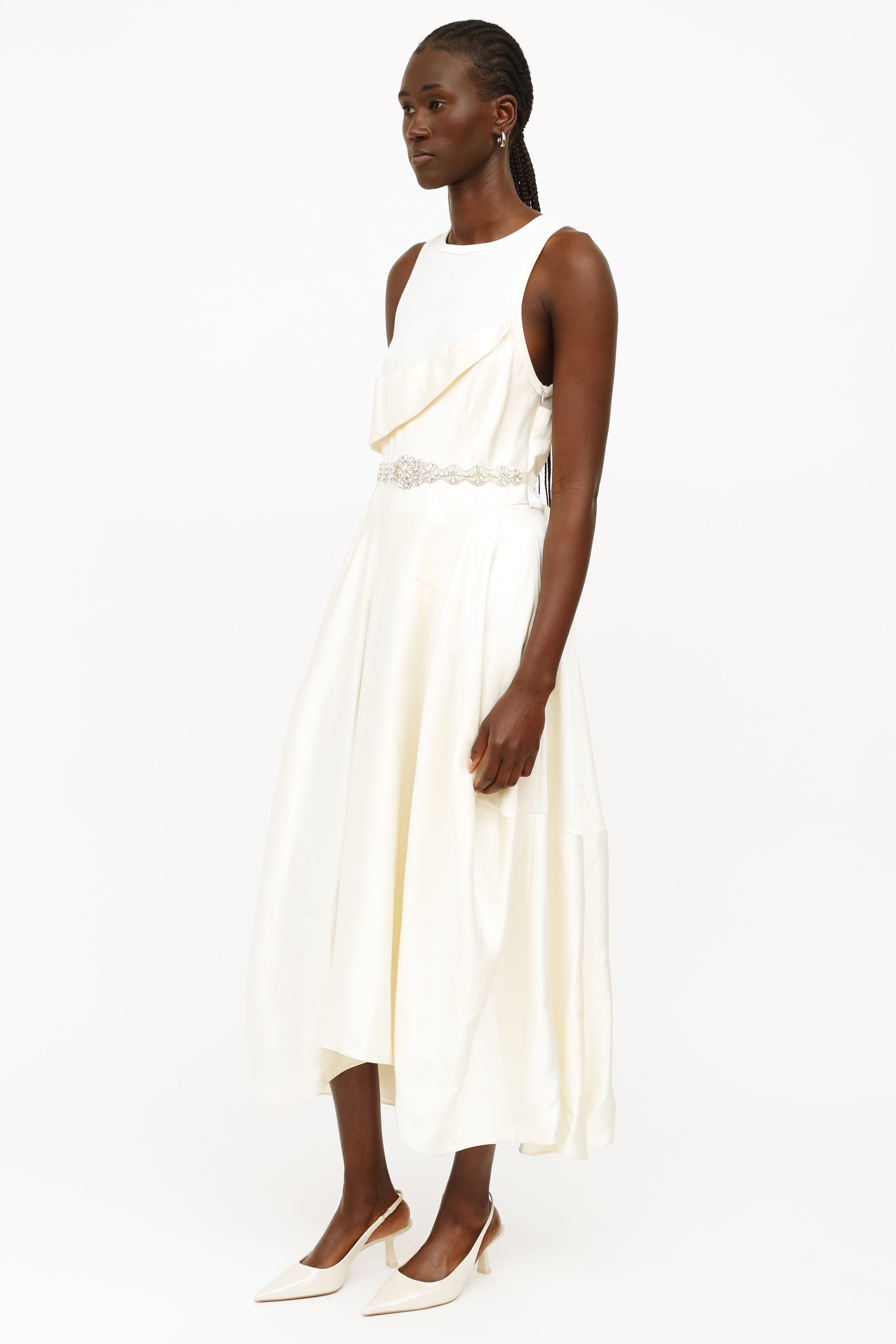 Pre-owned Alexander McQueen cream ribbed tiered dress featuring a round neckline, front tiered ruching at chest, concealed side zip closure, dual slip pockets at waistline, and detachable ribbon belt with embroidered silver toned hardware.