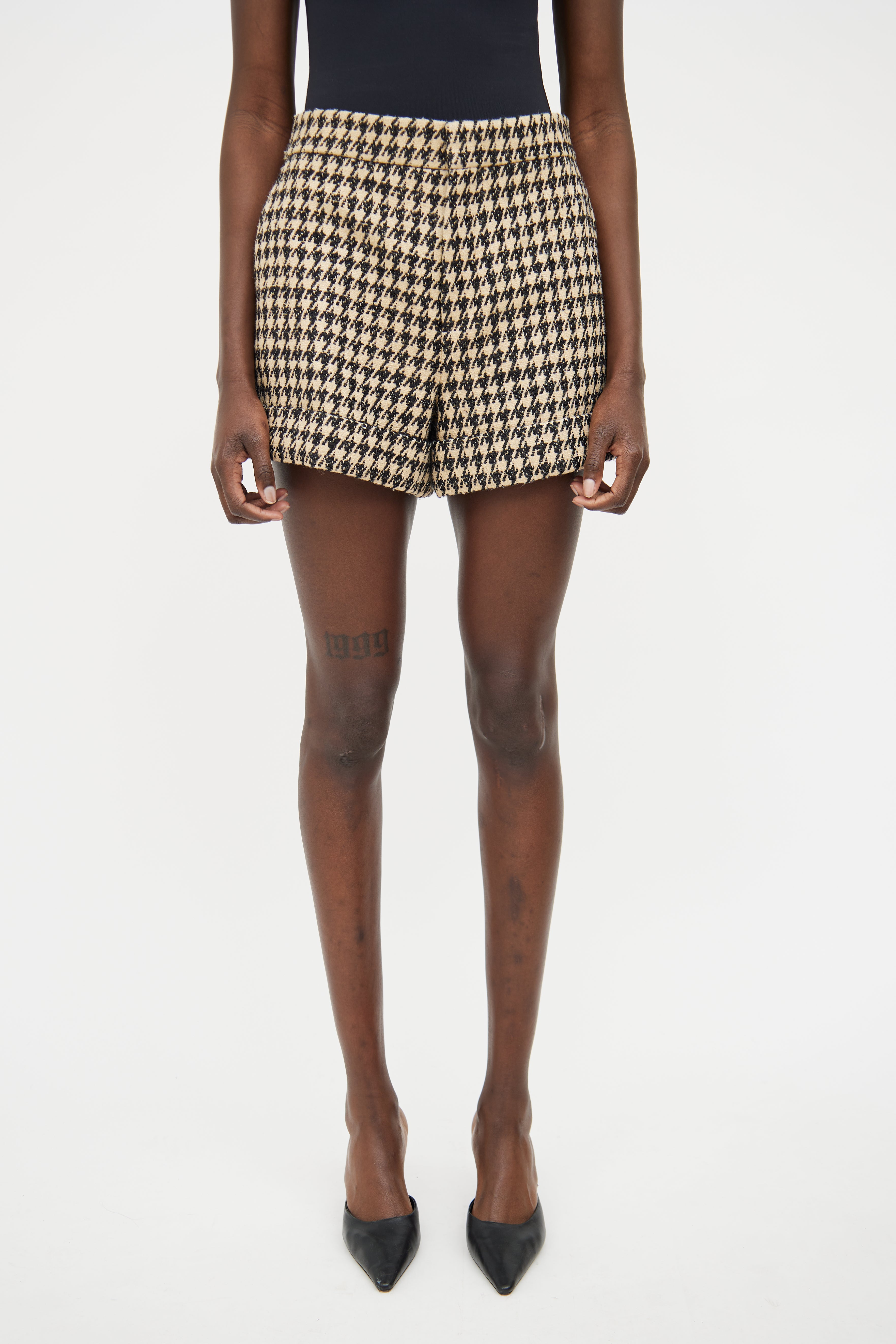Pre-owned Christian Dior beige and black houndstooth tweed shorts featuring concealed zip and hook closure, two slip pockets at front, two decorative pocket slits at back and cuffed hem. Fully lined. Shorts clipped to fit model.
