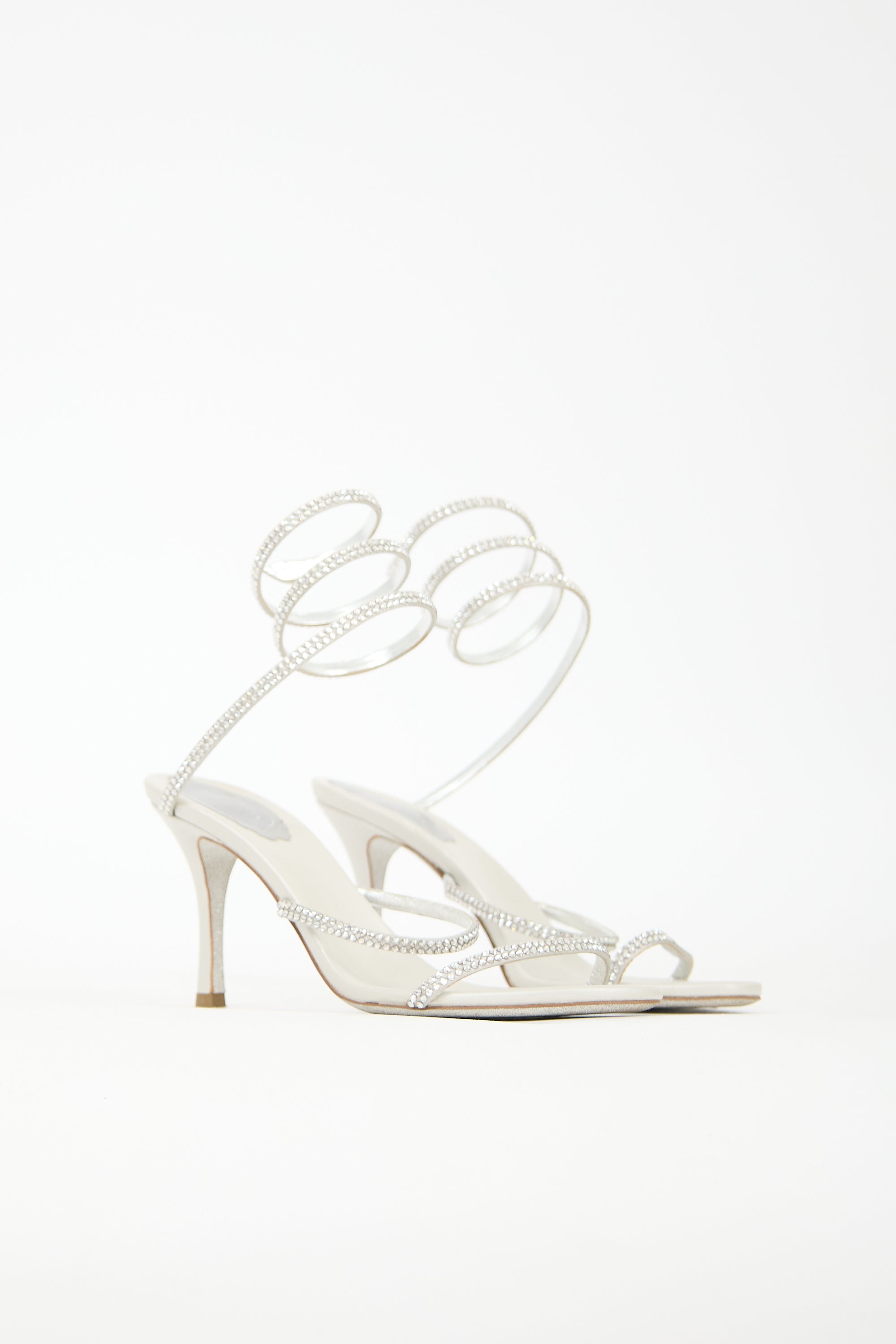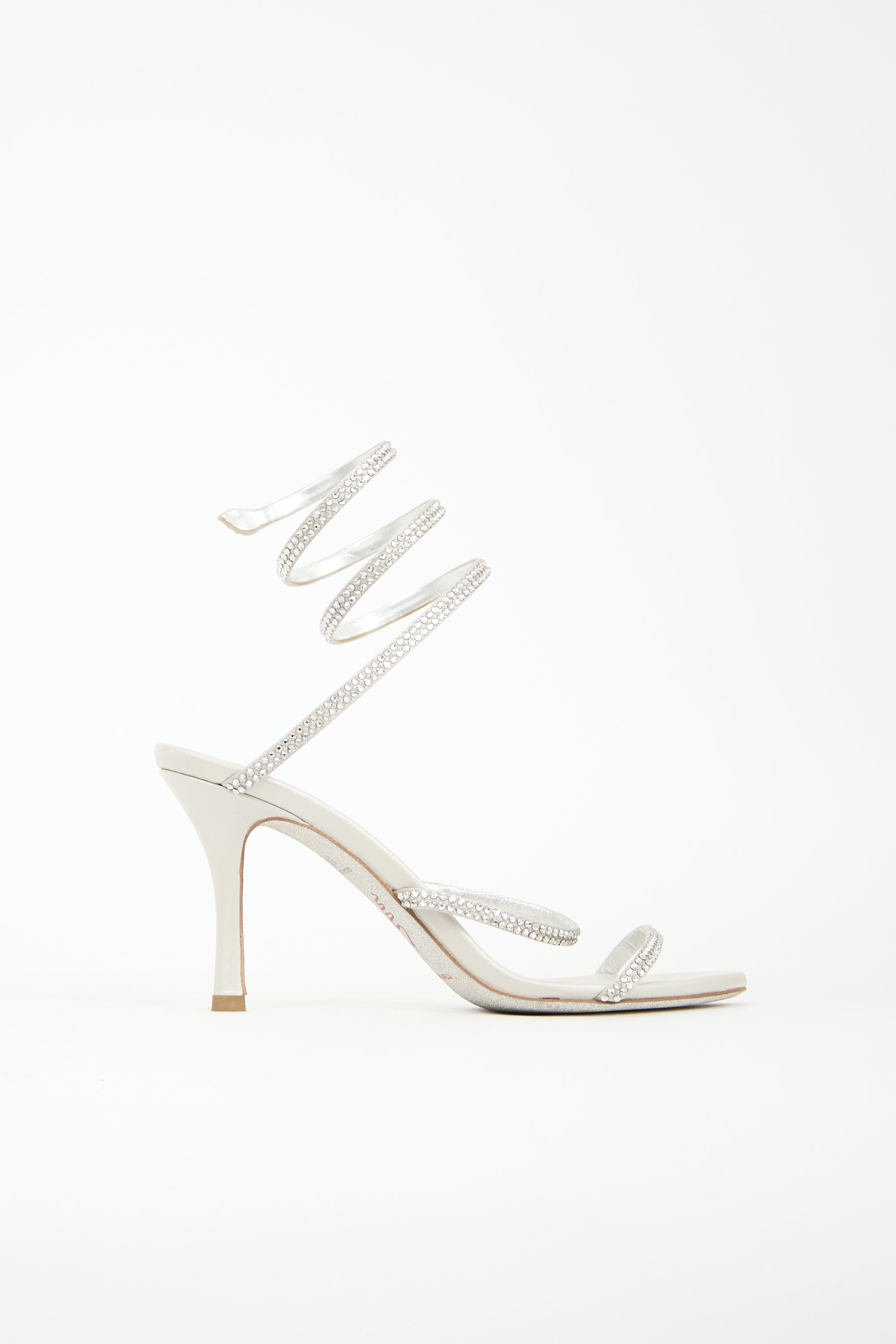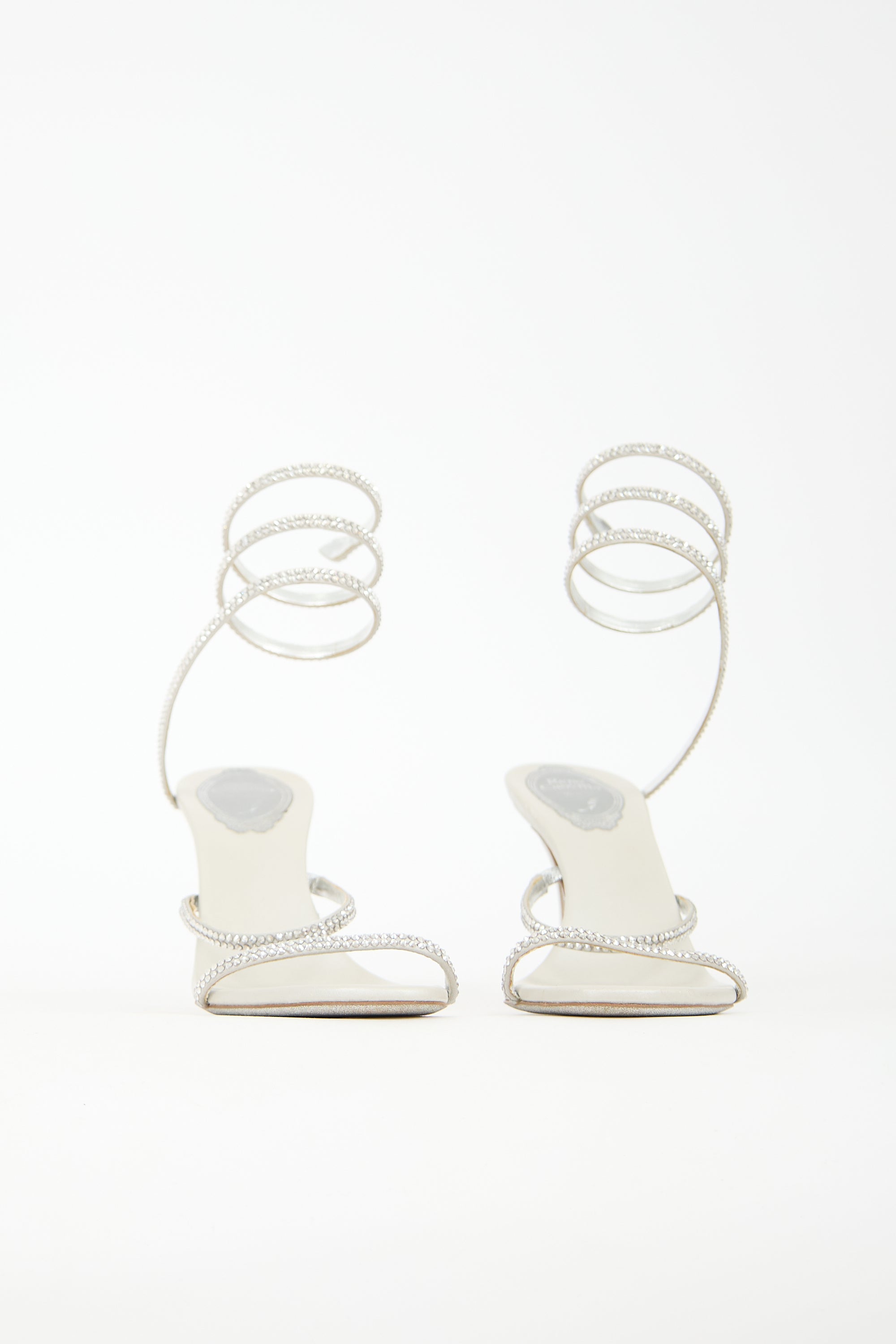 Pre-owned Rene Caovilla silver tone Cleo sandals featuring rounded toe, rhinestone embellished upper, wraparound ankle, and covered continental heel.