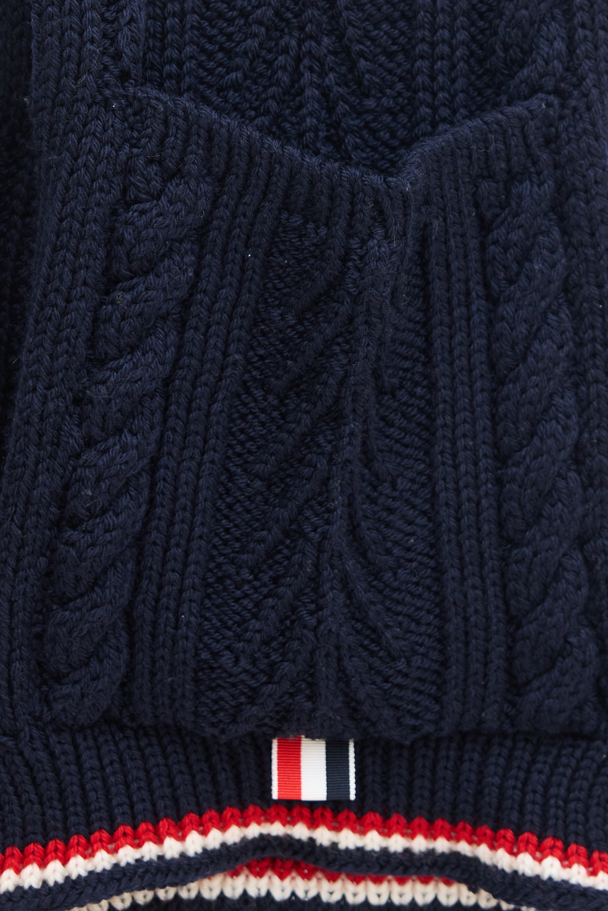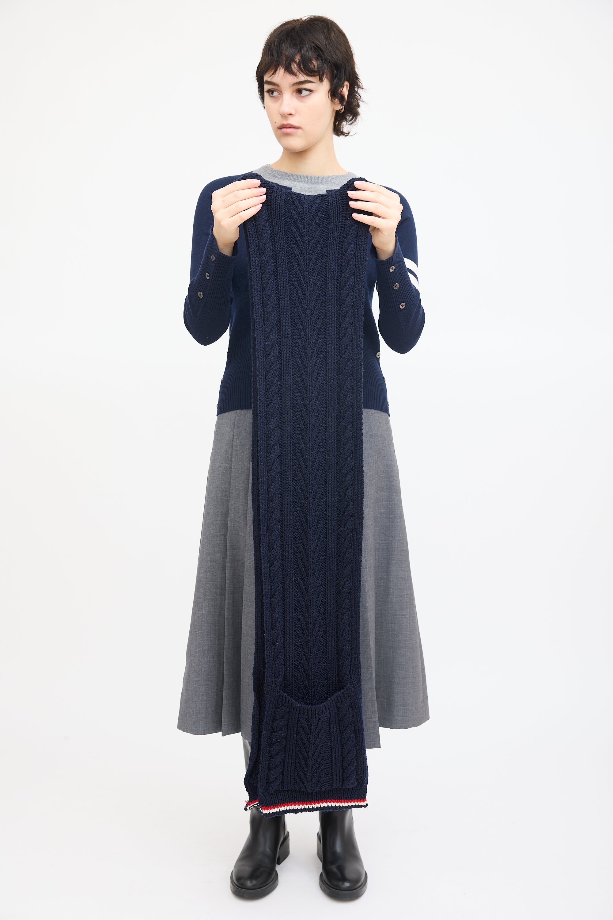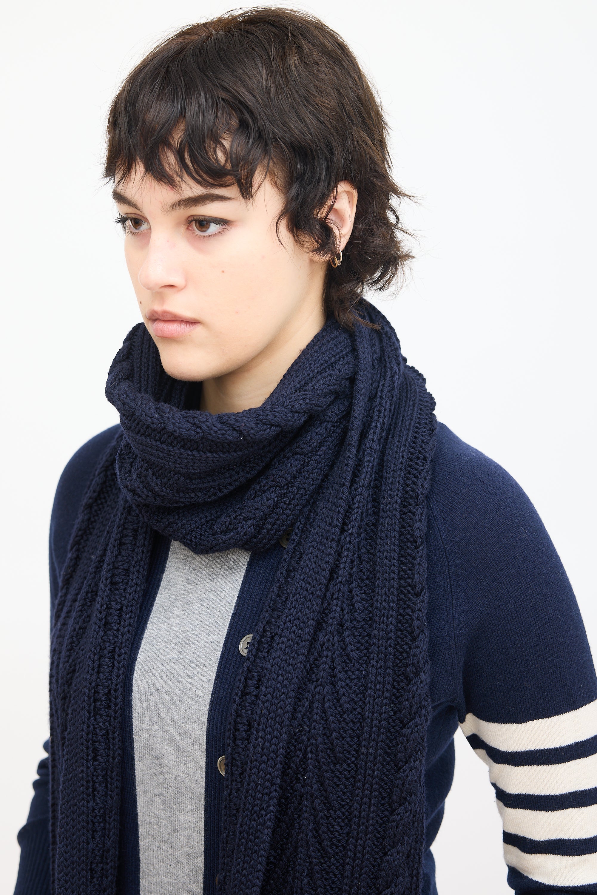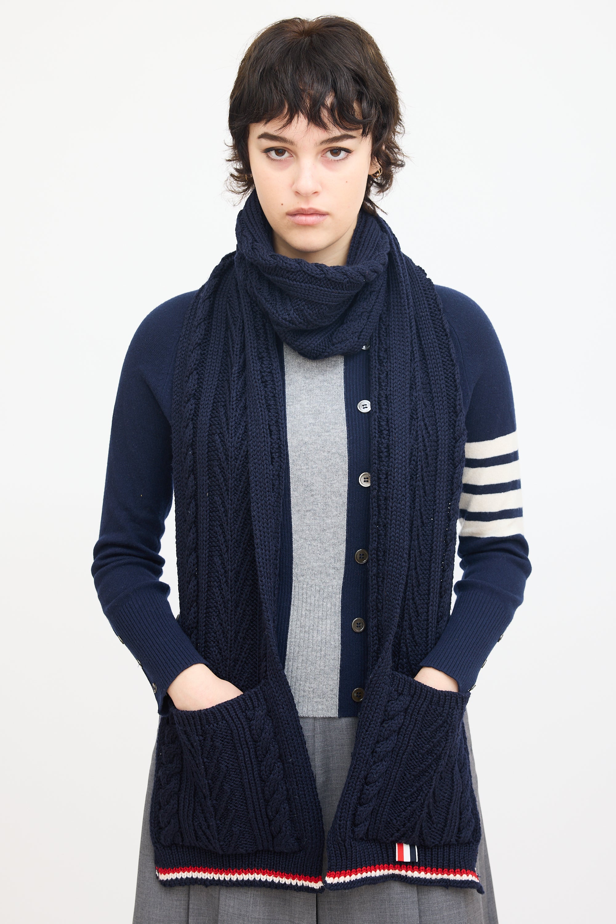 Pre-owned Thom Browne navy cable knit scarf featuring patch pockets and tricolour stripe intarsia at both ends, signature tricolour grosgrain detail at one end, and logo tab at reverse.