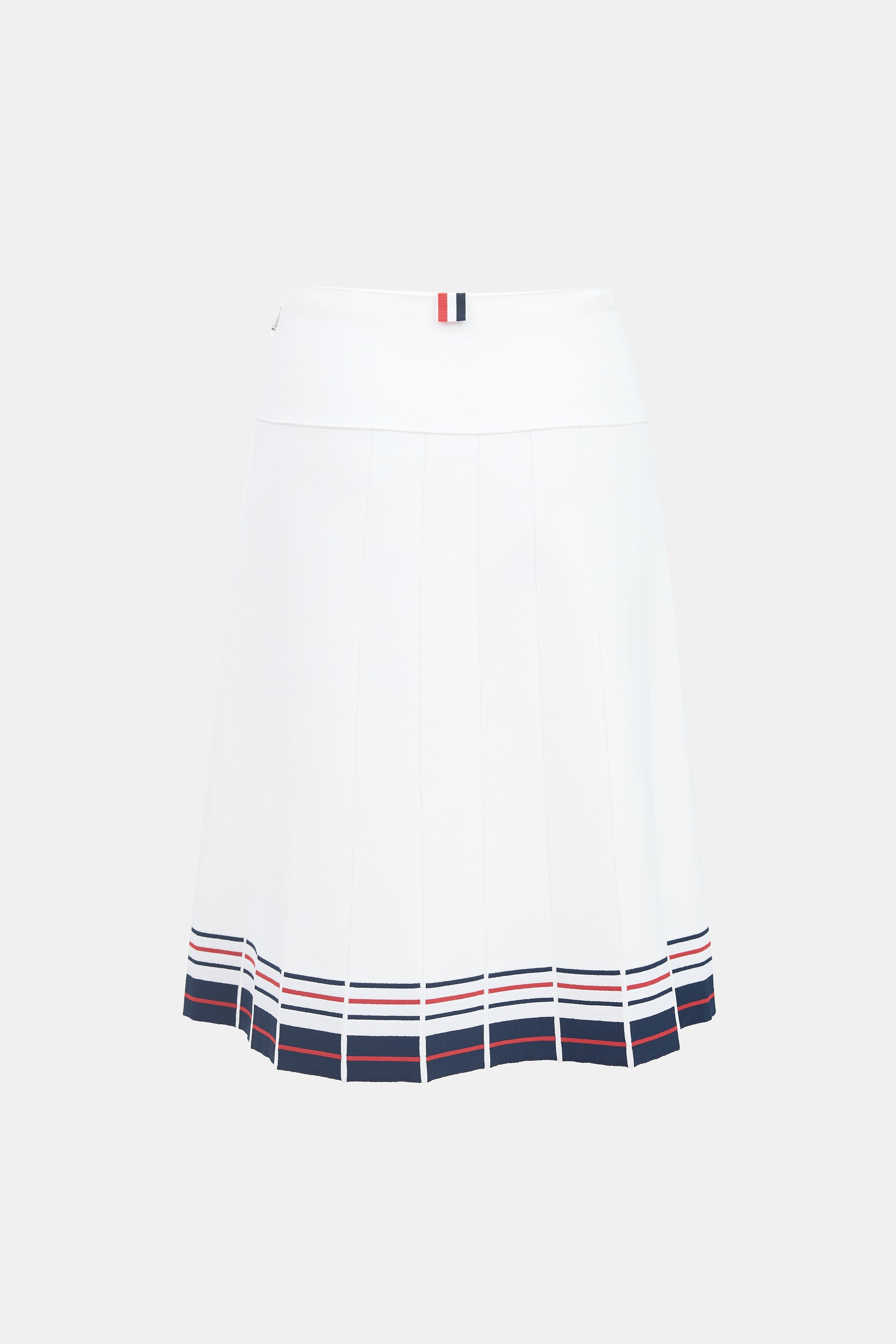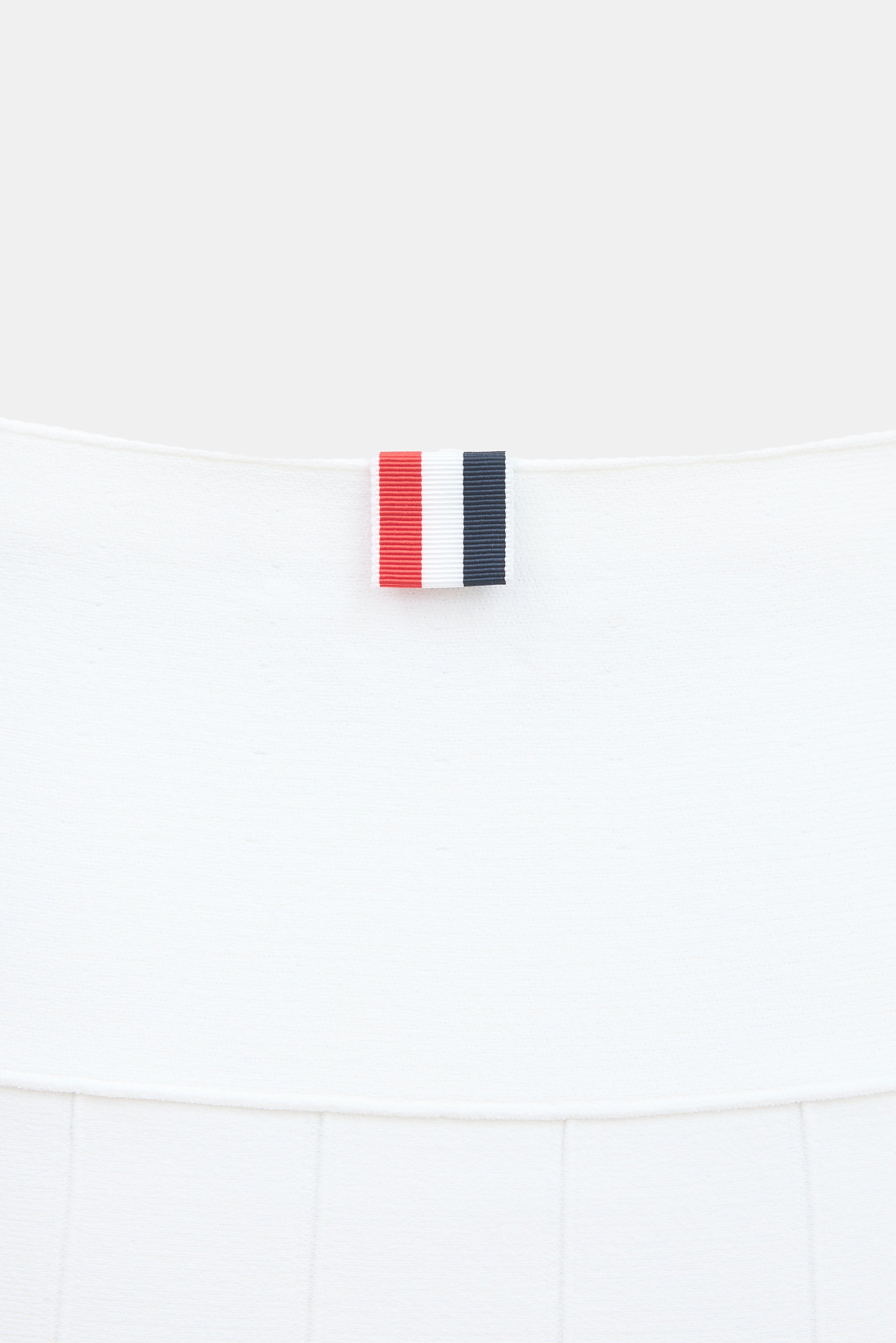Pre-owned Thom Browne white stretch jersey pleated skirt featuring a side zip closure, defined waist, signature grosgrain RWB tag at back, and a RWB stripe at hem.