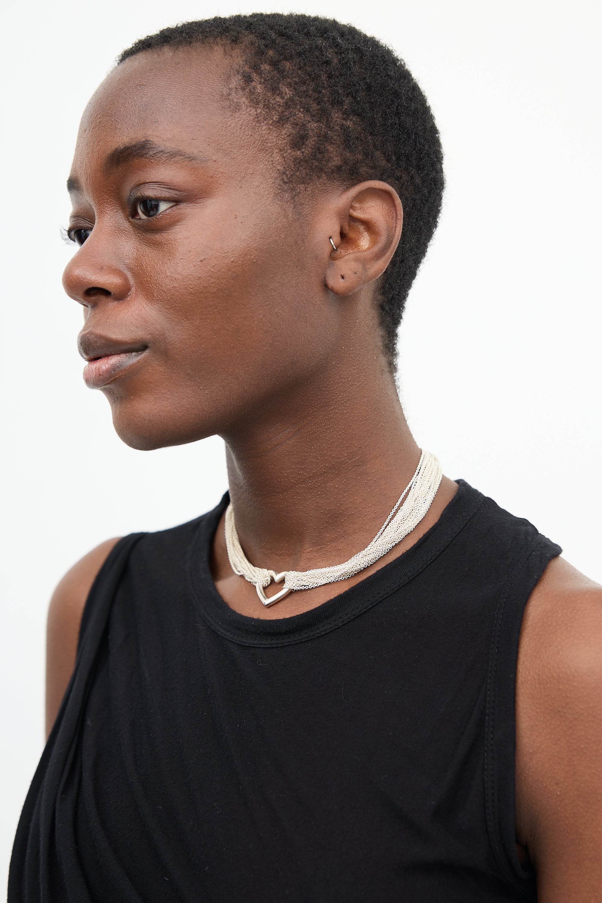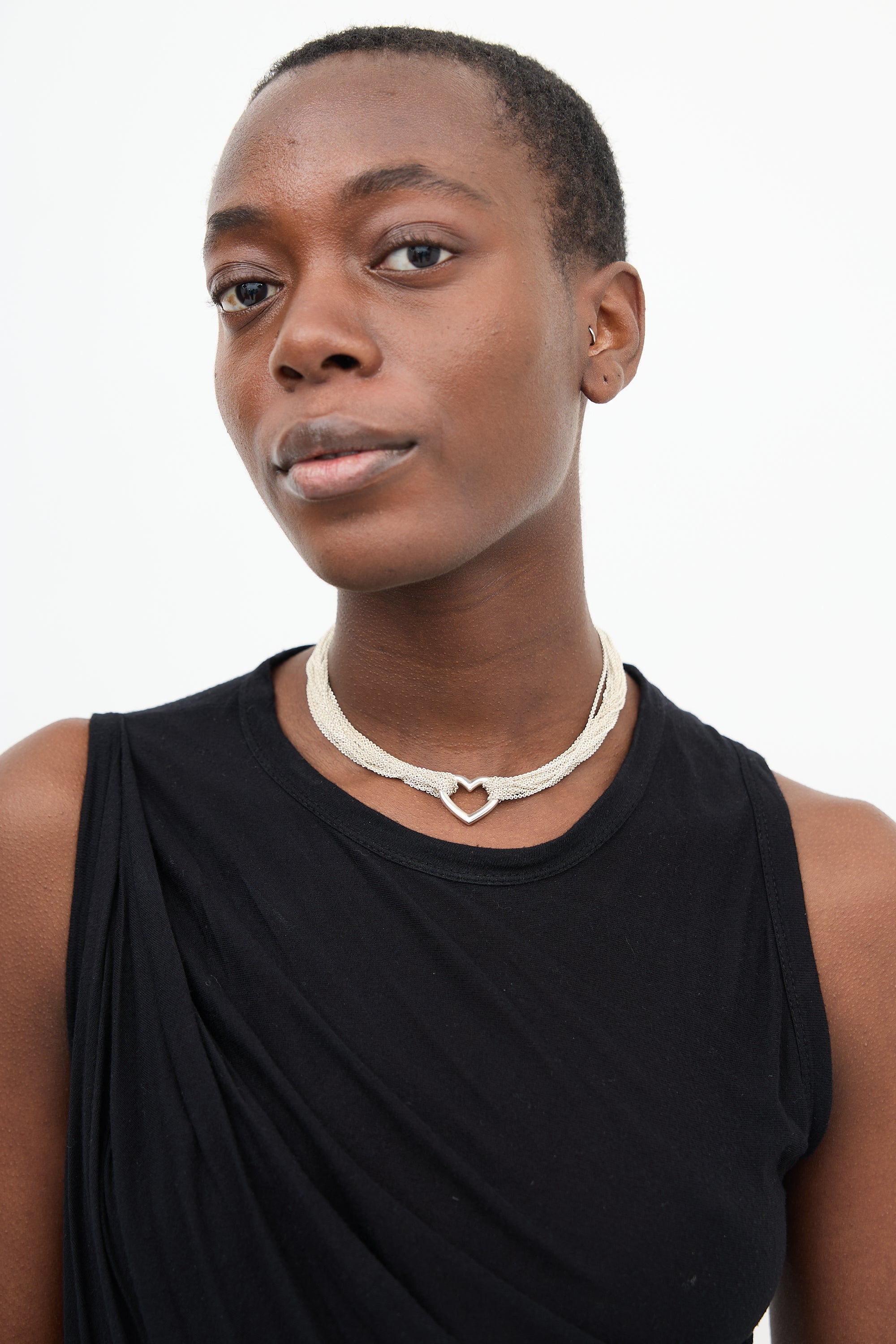 Pre-owned Tiffany & Co. silver necklace featuring stacked sterling silver cable link chains, cut out heart pendant, and toggle clasp closure. Stamped with registered trademark symbol, designer signature, and "925." Comes with original box.