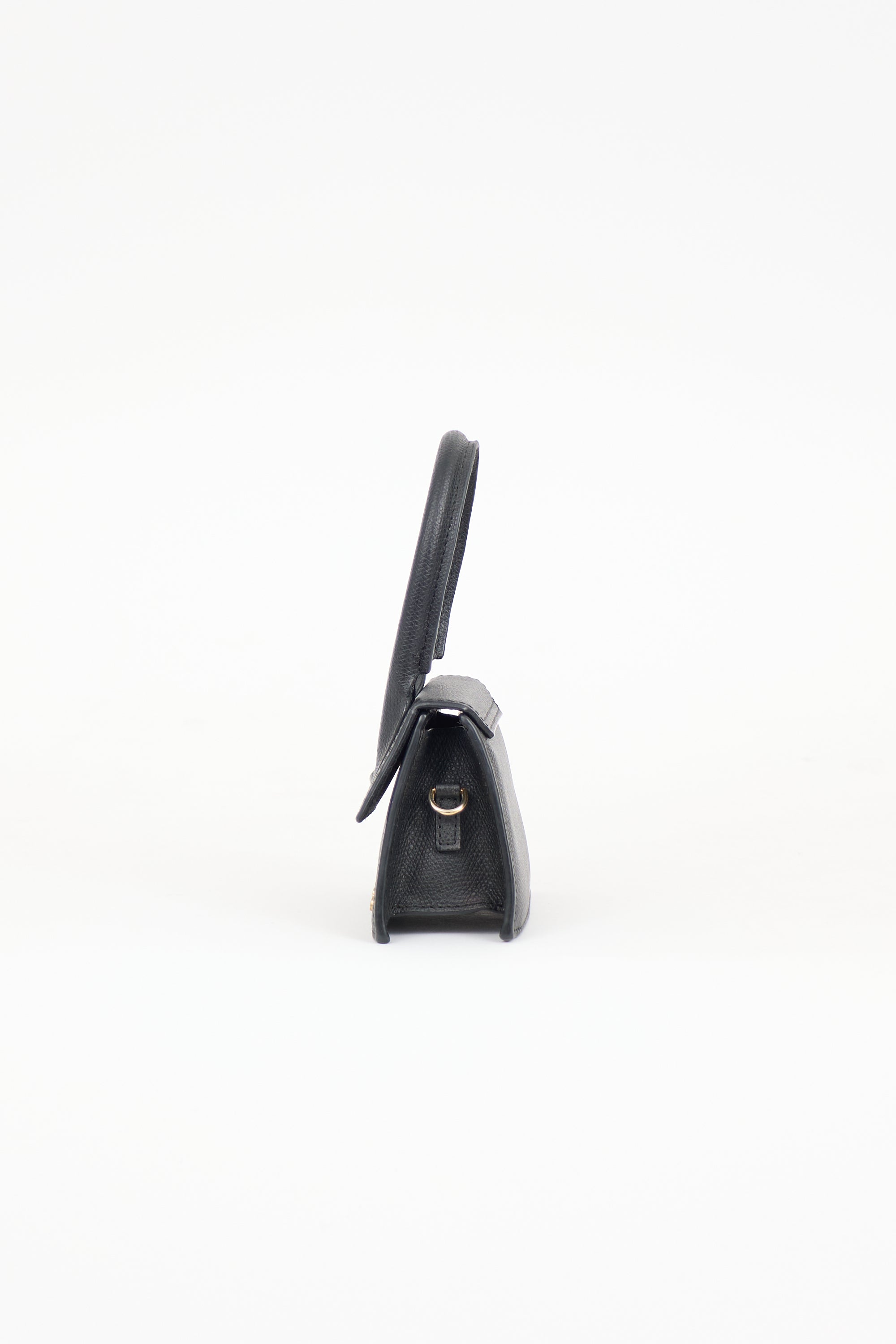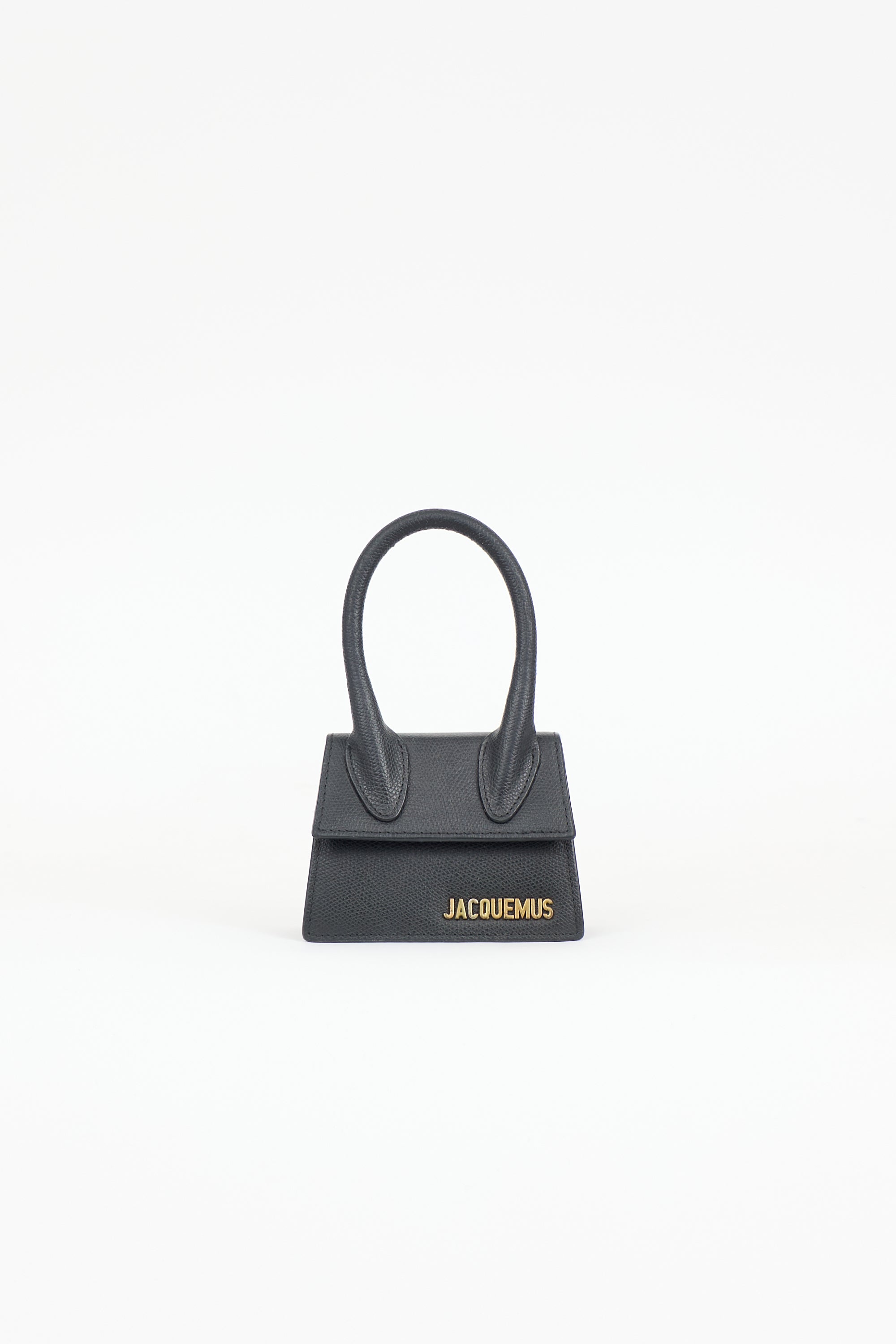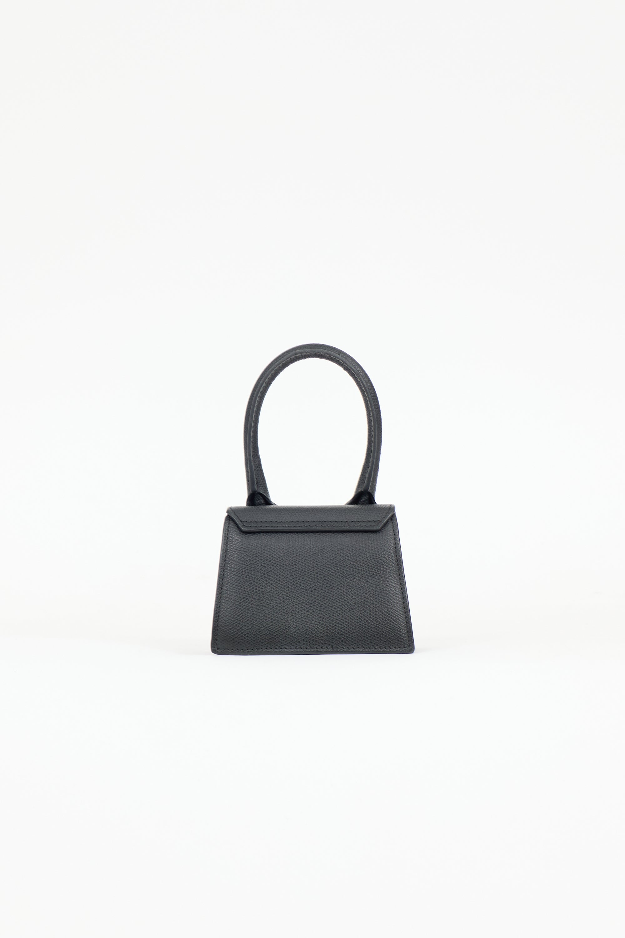 Pre-owned Jacquemus black textured leather La Chiquito bag featuring single rolled top handle, gold tone hardware, logo hardware at front, top flap with snap button closure, one main compartment, and detachable and adjustable shoulder strap. Comes with original dust bag.