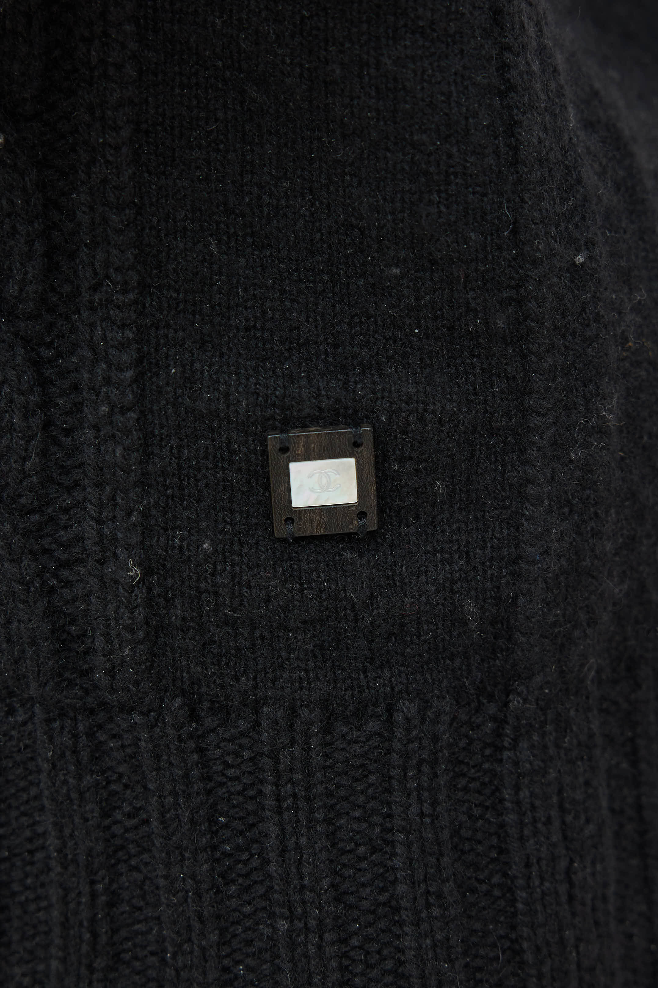 Pre-owned Chanel Fall/Winter 2001 black cashmere knit sweater featuring a turtleneck, long sleeves with quilted leather elbow pads, cable knit, CC logo hardware at hip, and ribbed hem.