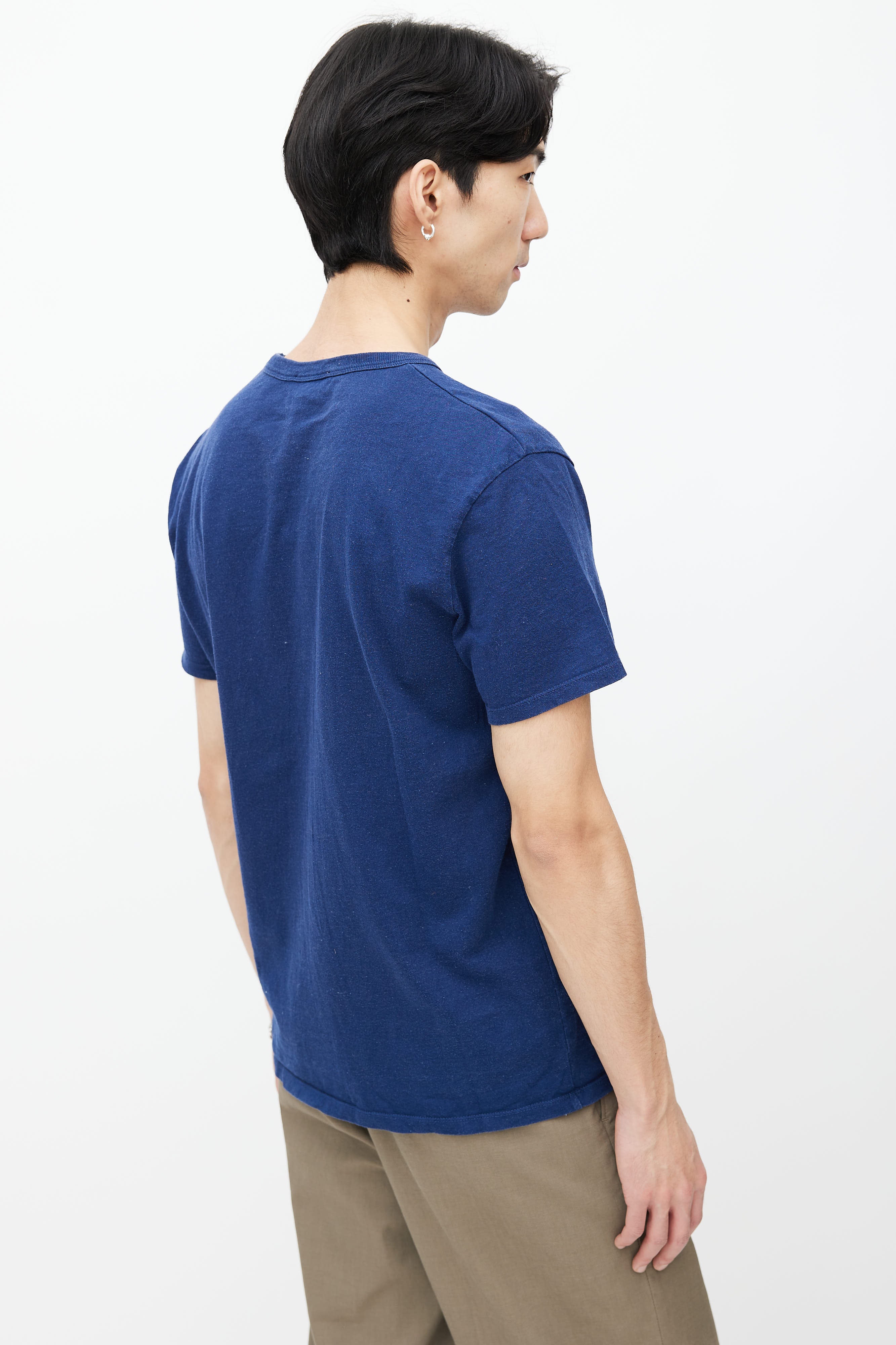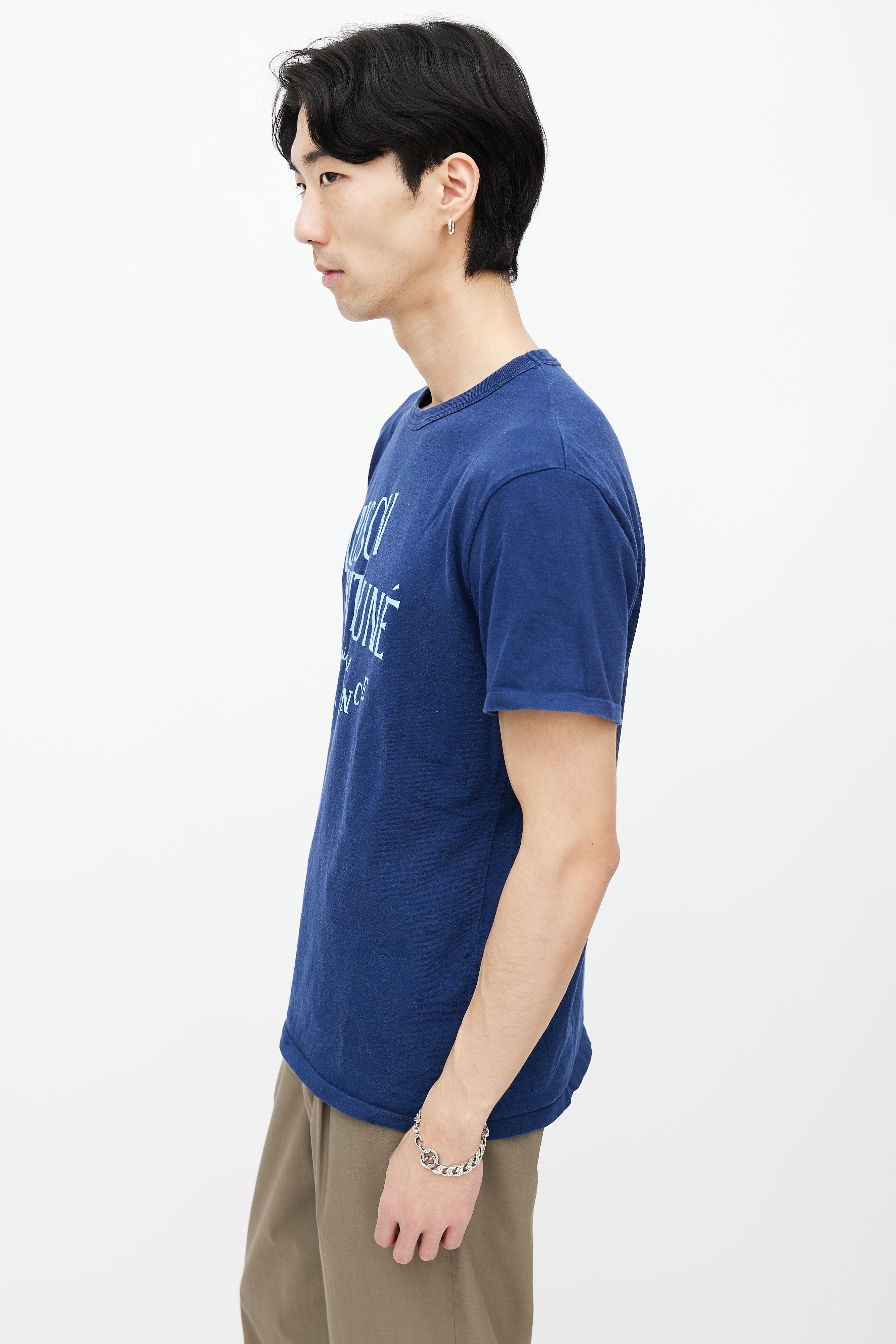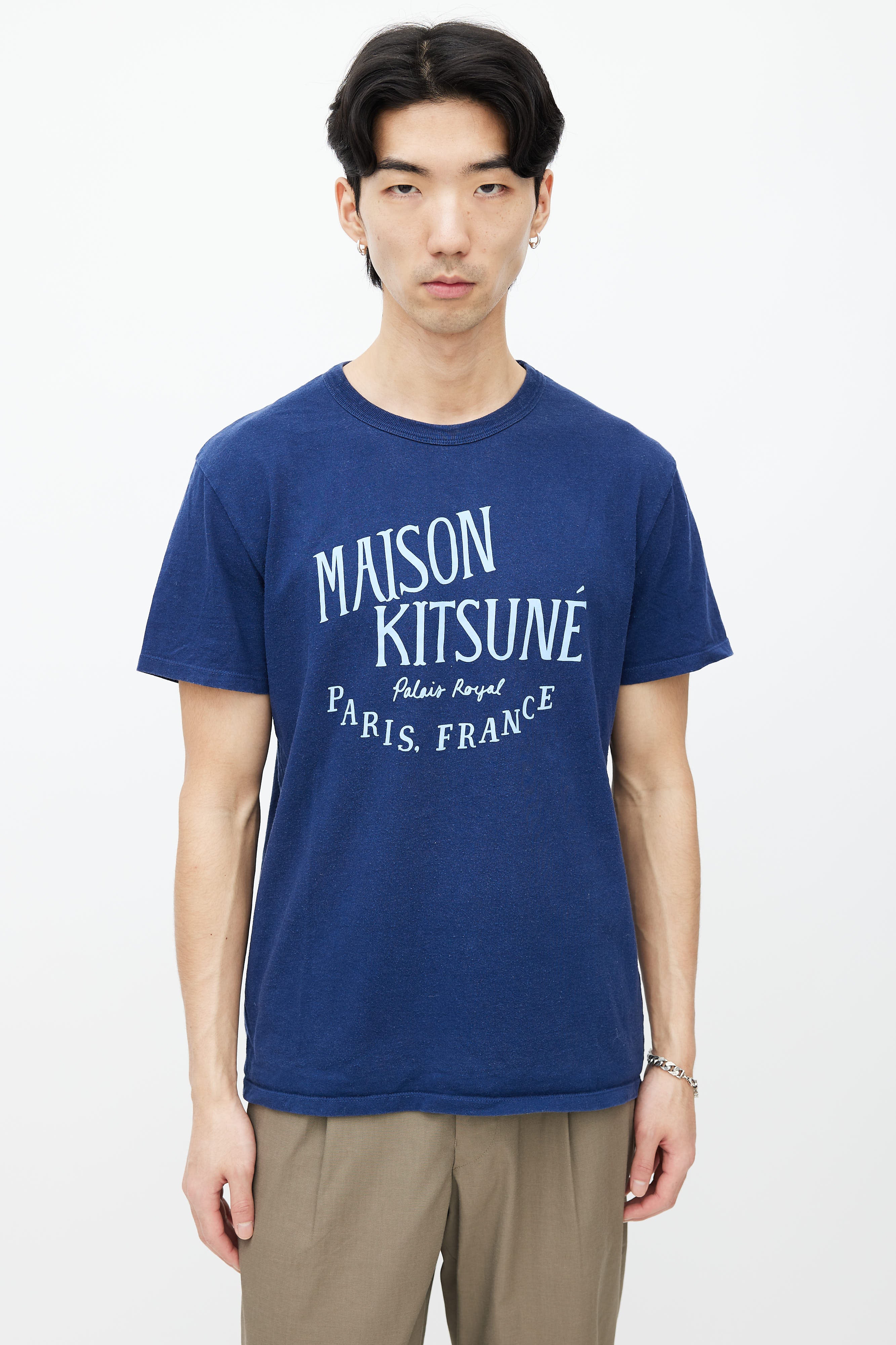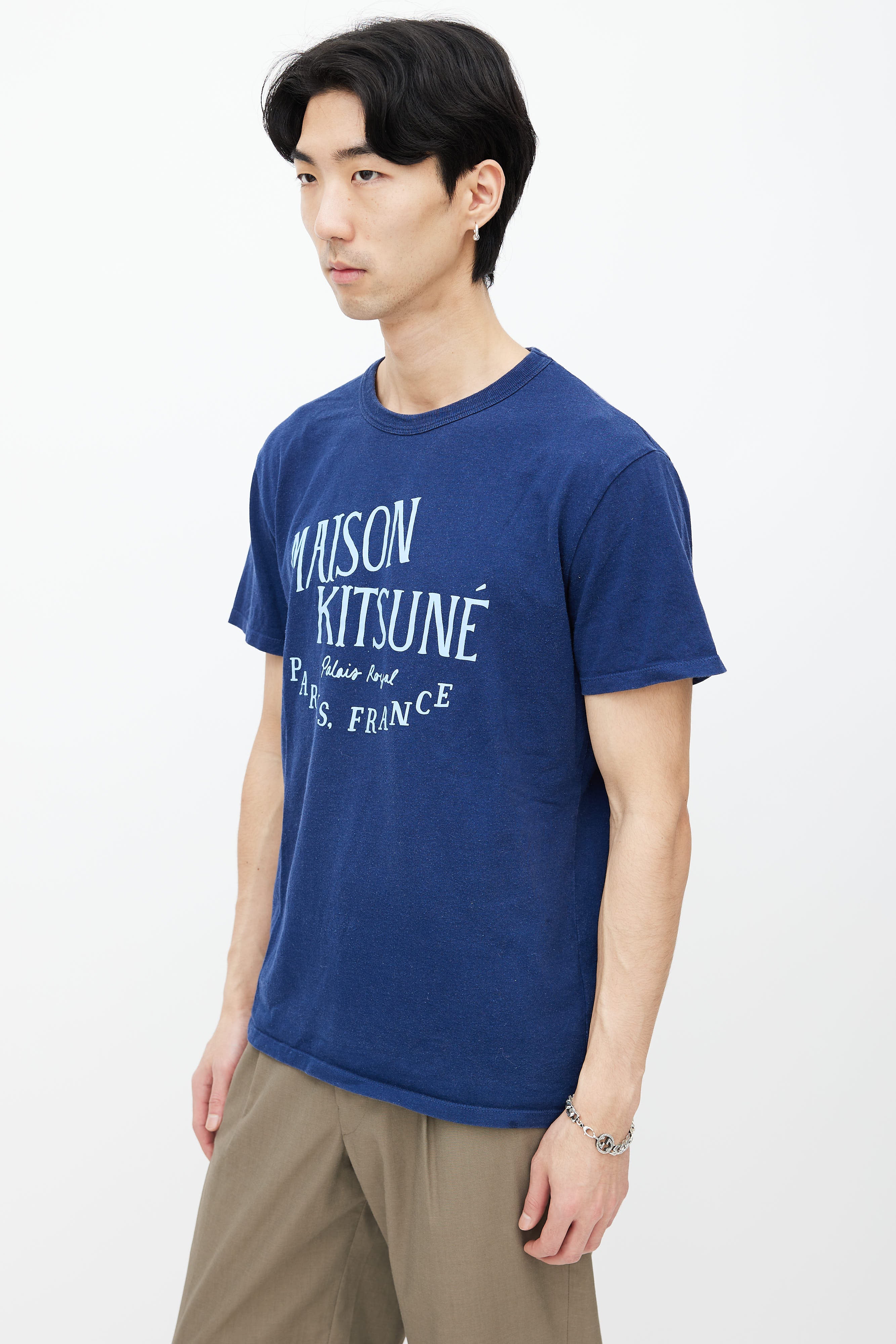 Pre-owned Maison Kitsuné T-shirt in navy featuring crew neckline, short sleeves, and light blue letter print at front.