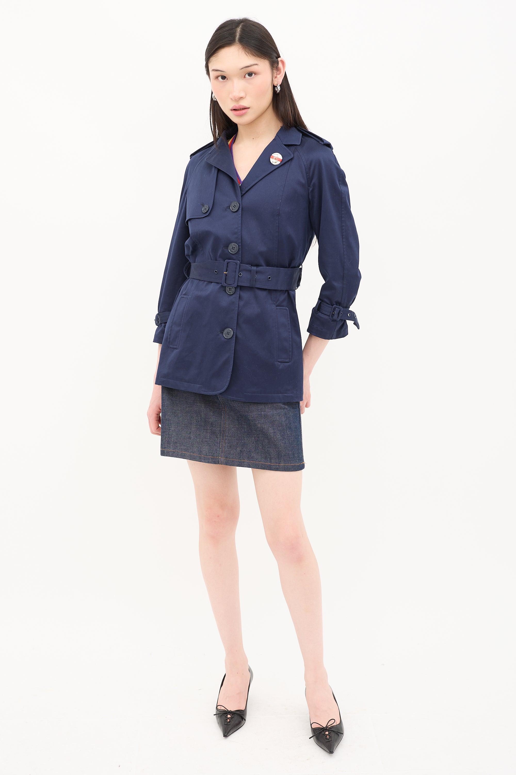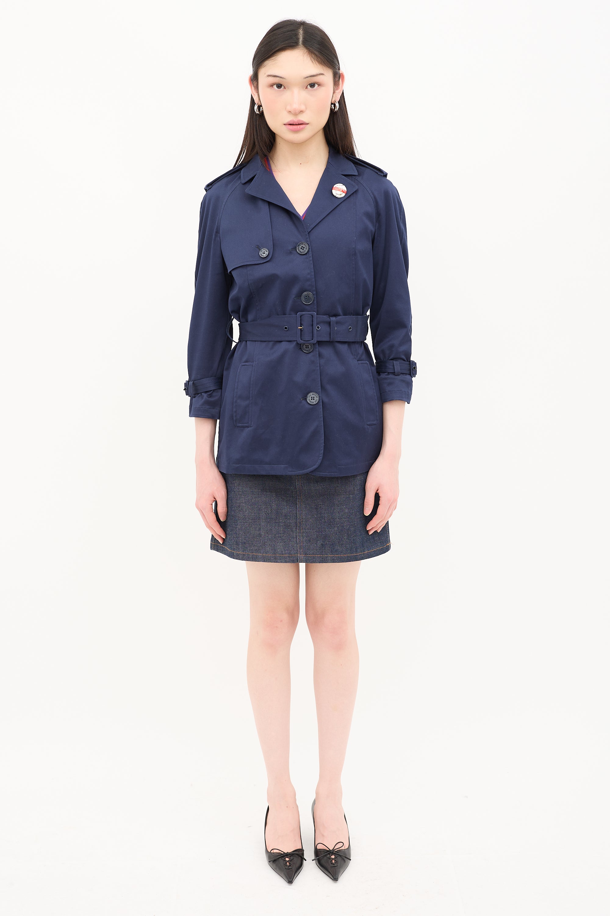 Pre-owned Love Moschino navy trench jacket featuring notched collar, removable logo button pin, button up front, two front welt pockets, storm flap at right shoulder, storm shield, waist belt, epaulettes, and adjustable cuff straps.