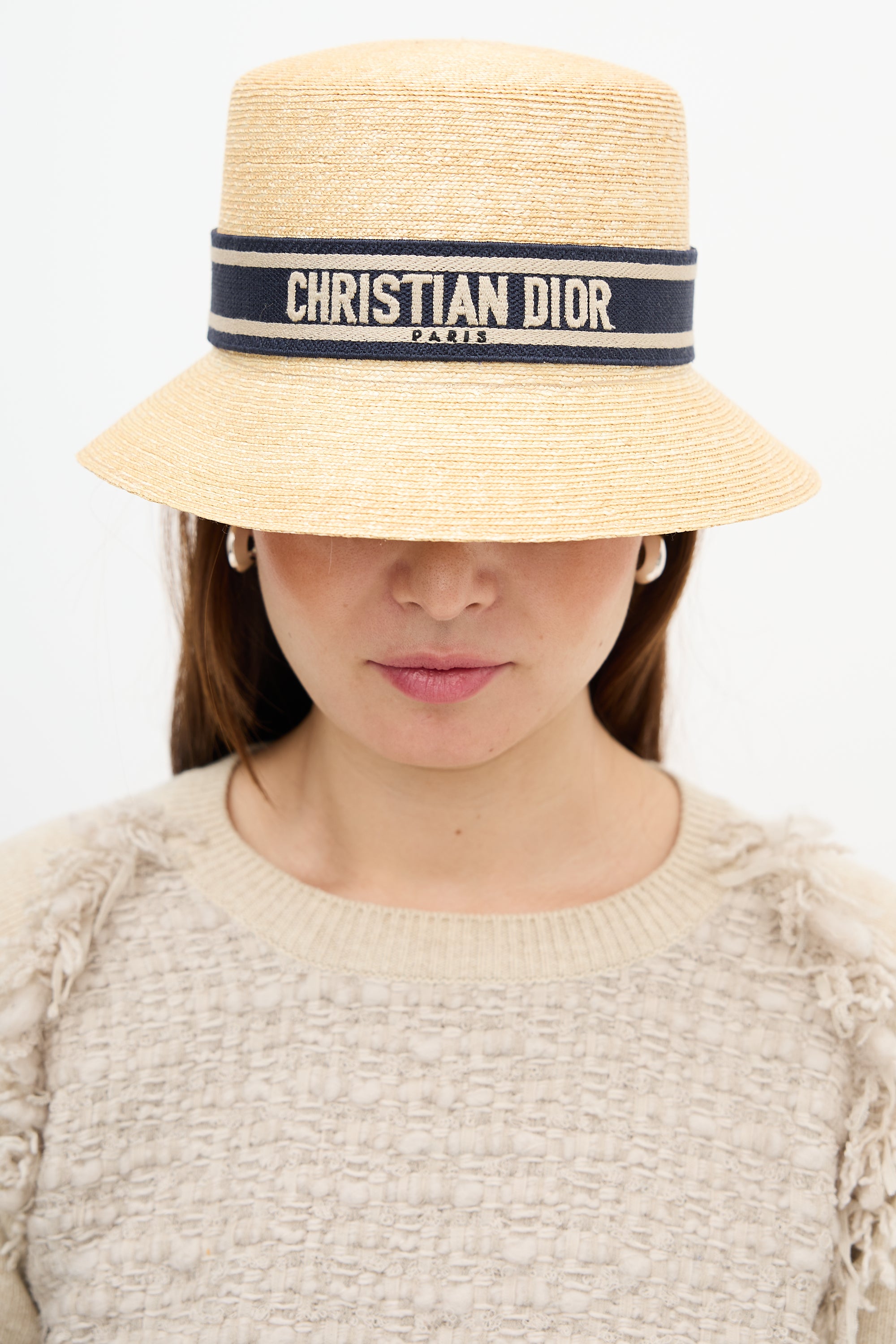 Pre-owned Christian Dior beige straw D-Bobby Small Brim hat featuring a navy and cream logo embroidered band and a webbed tonal trim at interior.