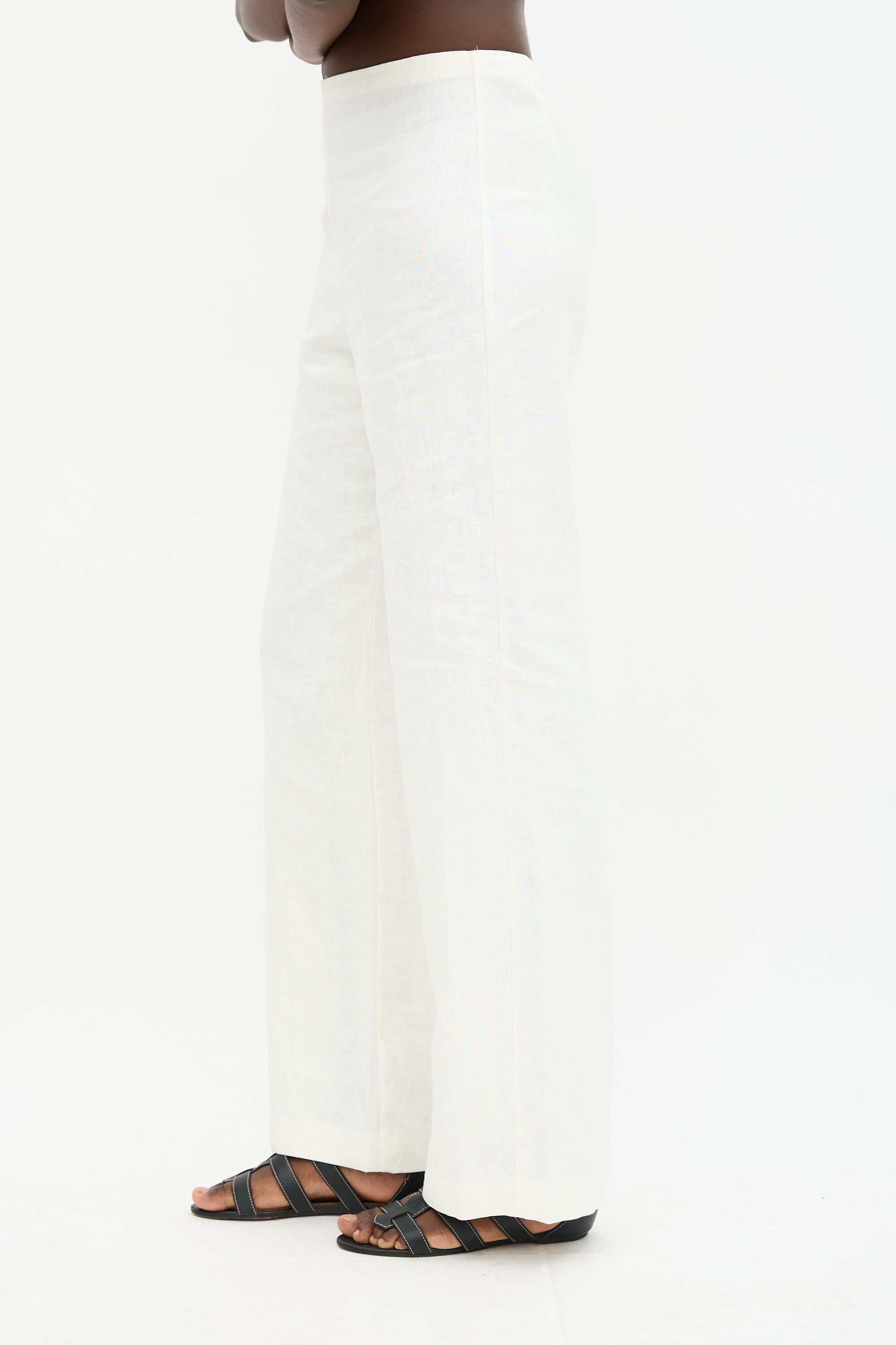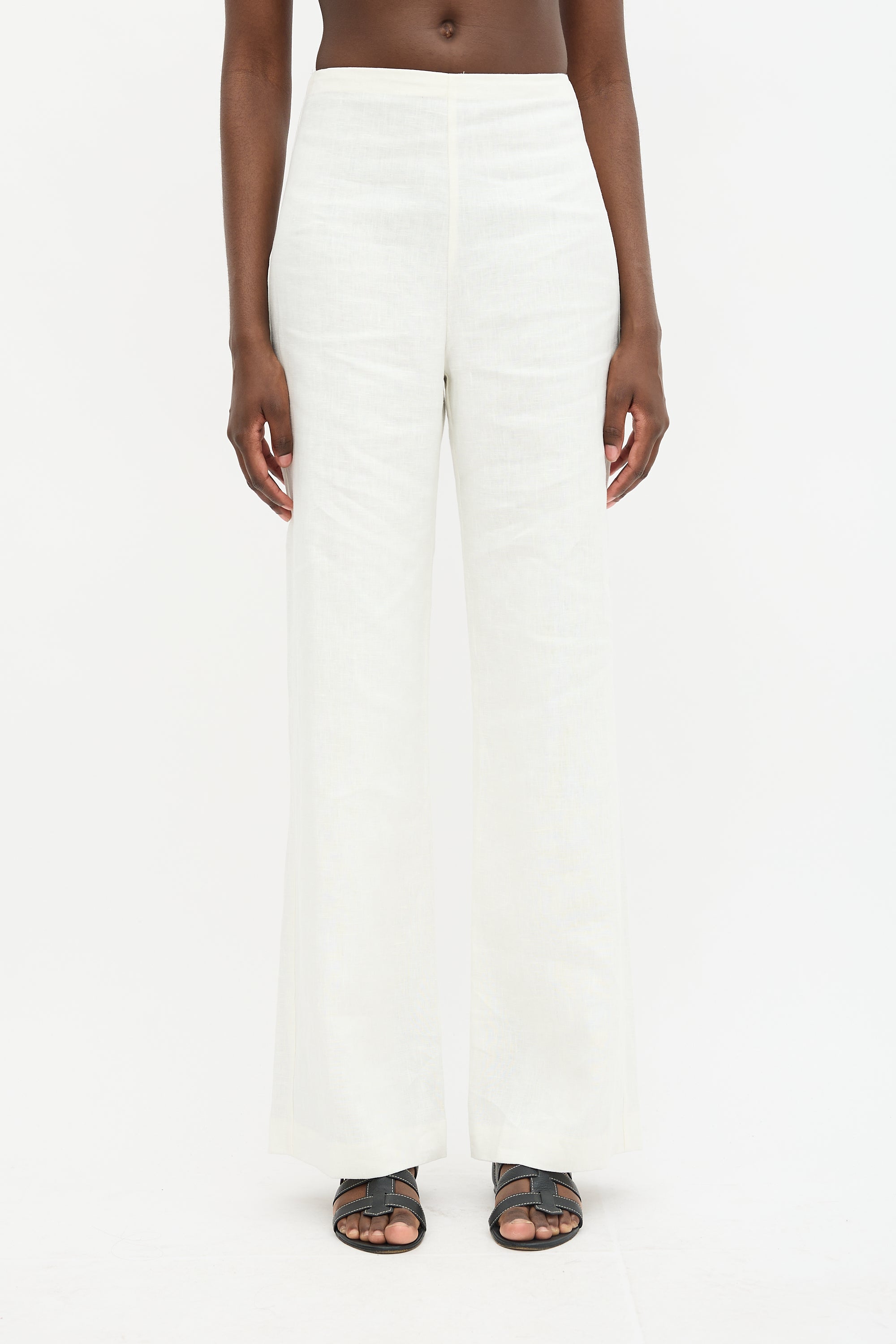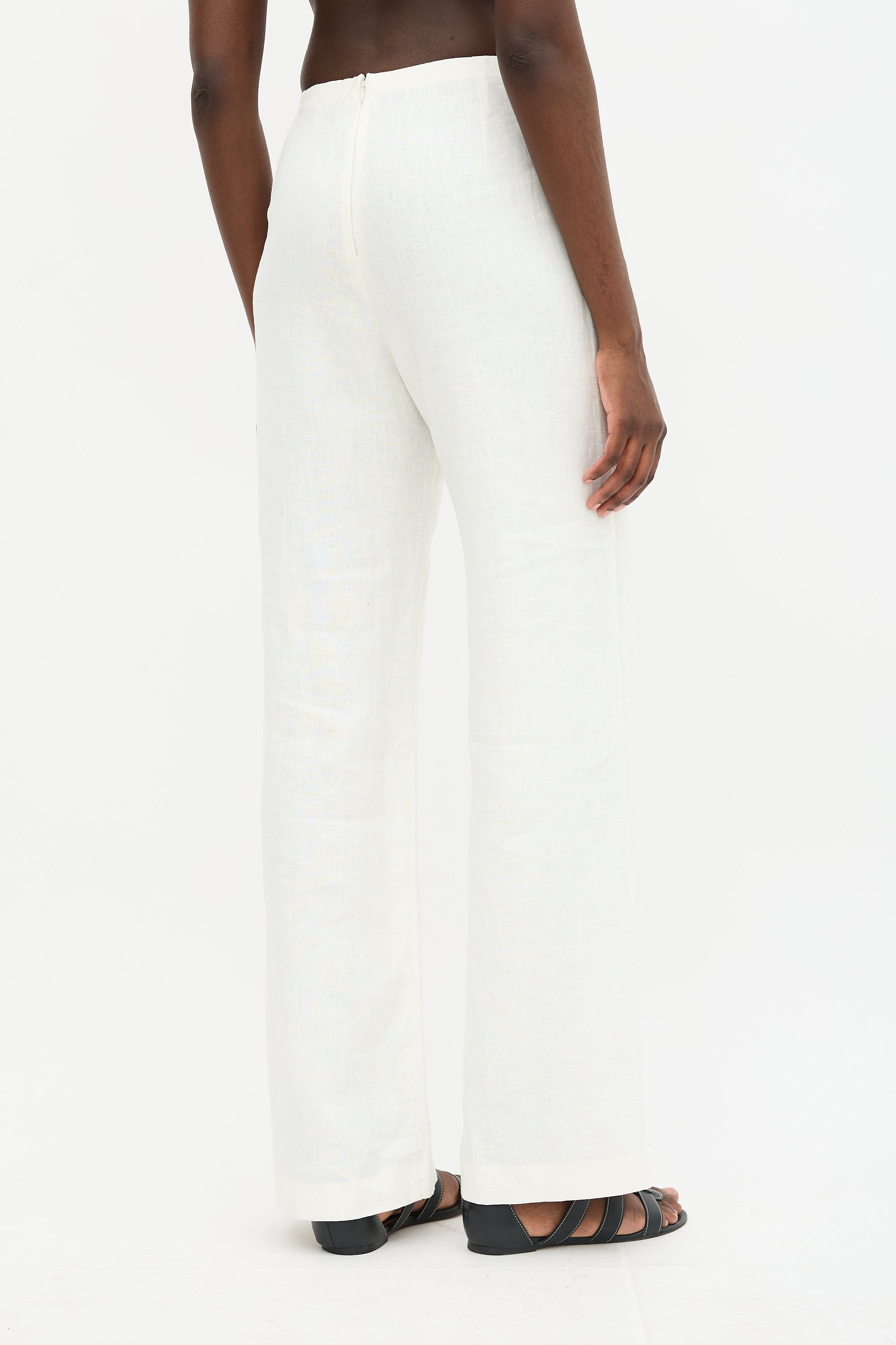 Pre-owned Faithfull the Brand white linen Ilride pants featuring a high rise, back zip closure, and a wide leg.
