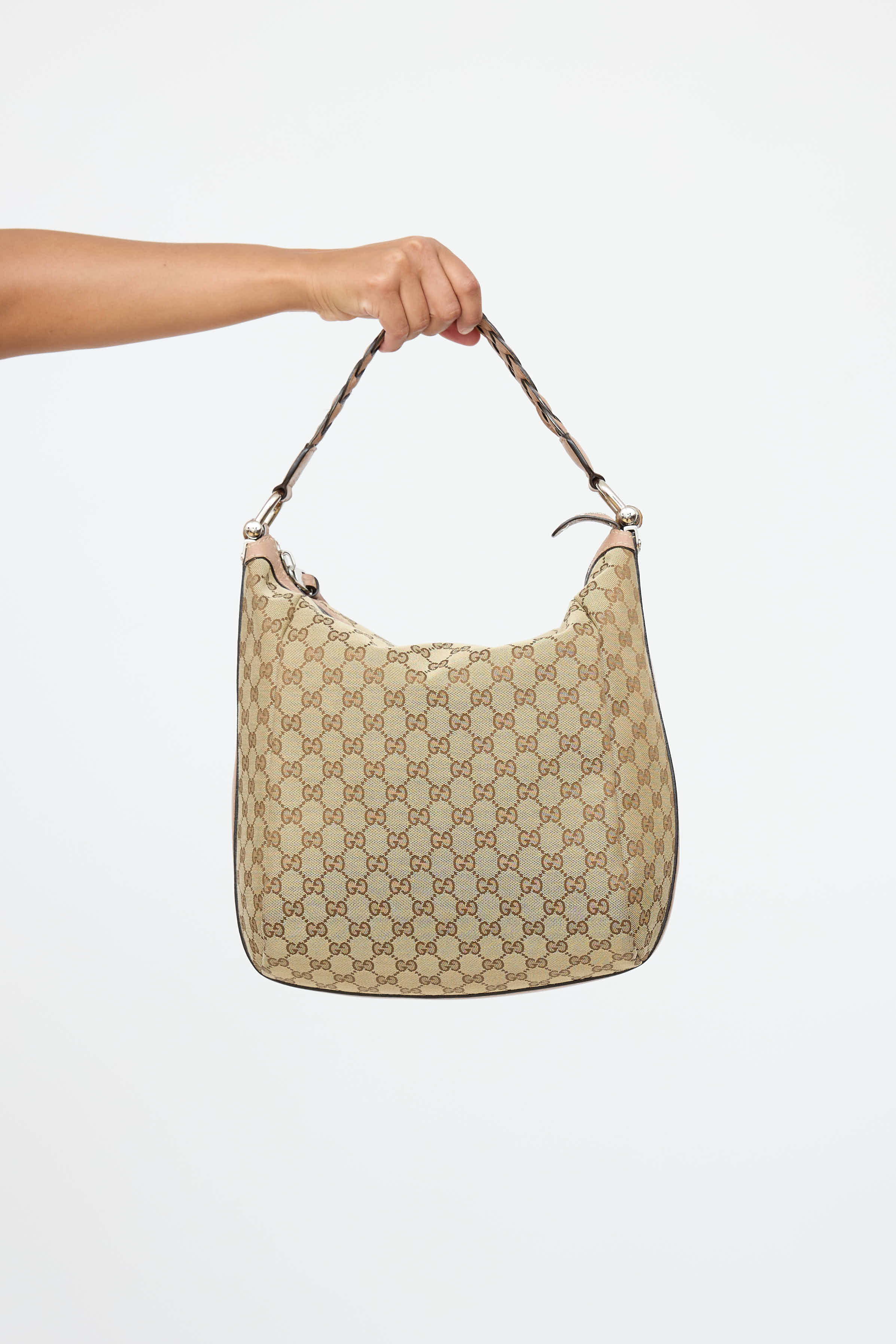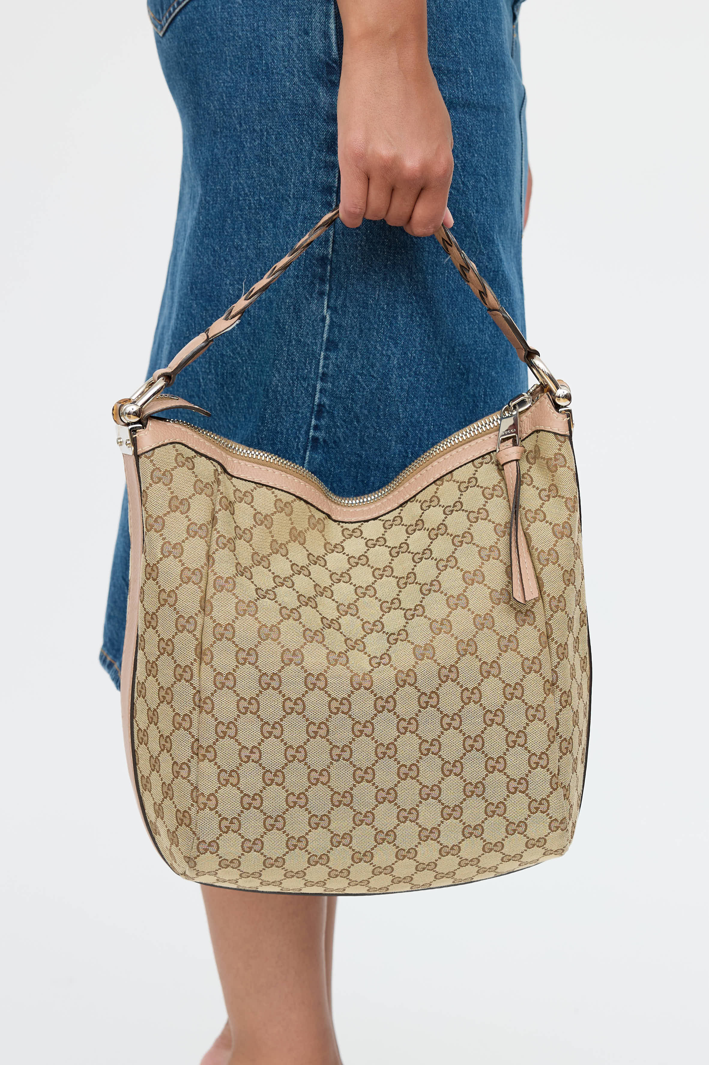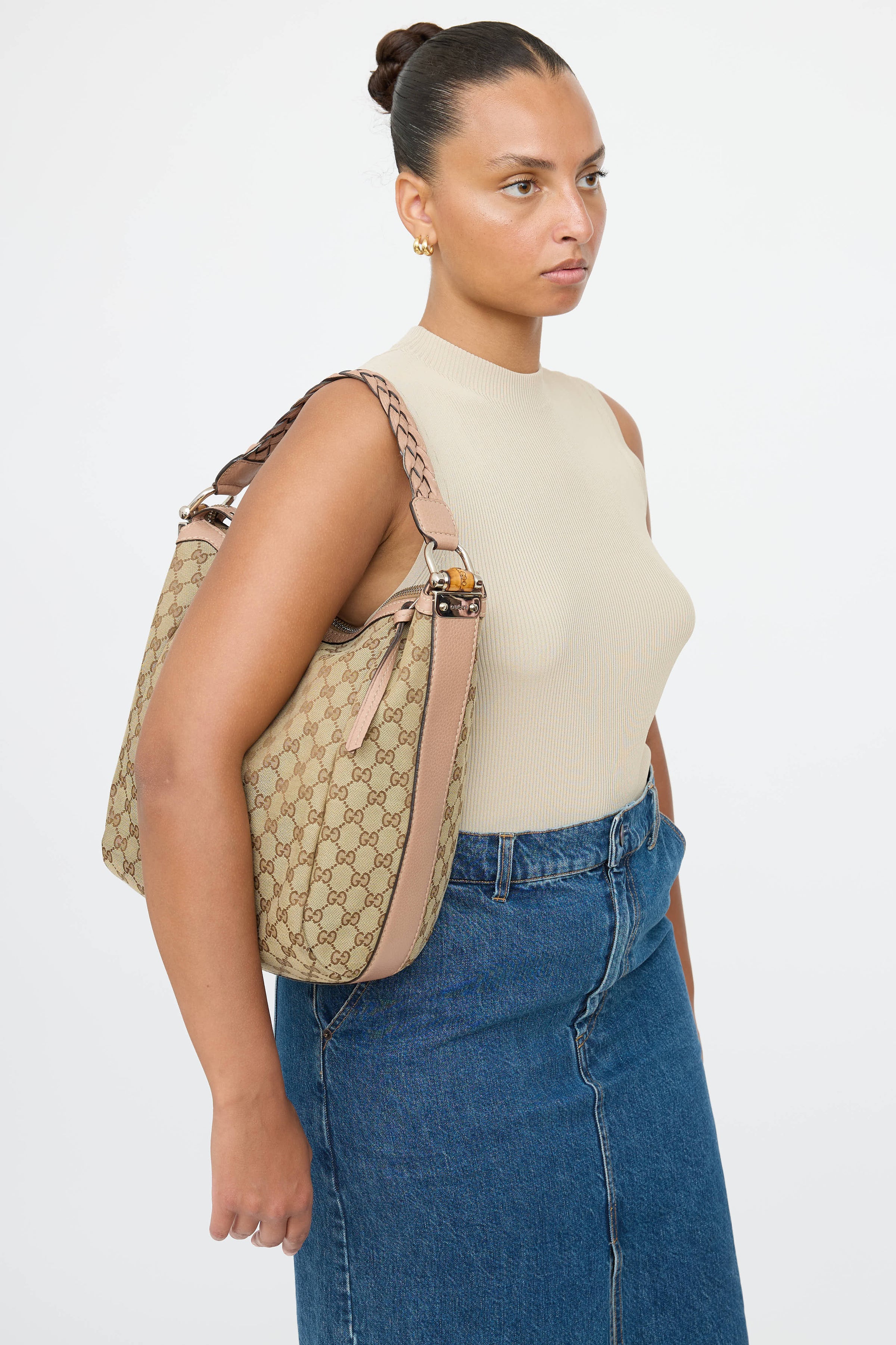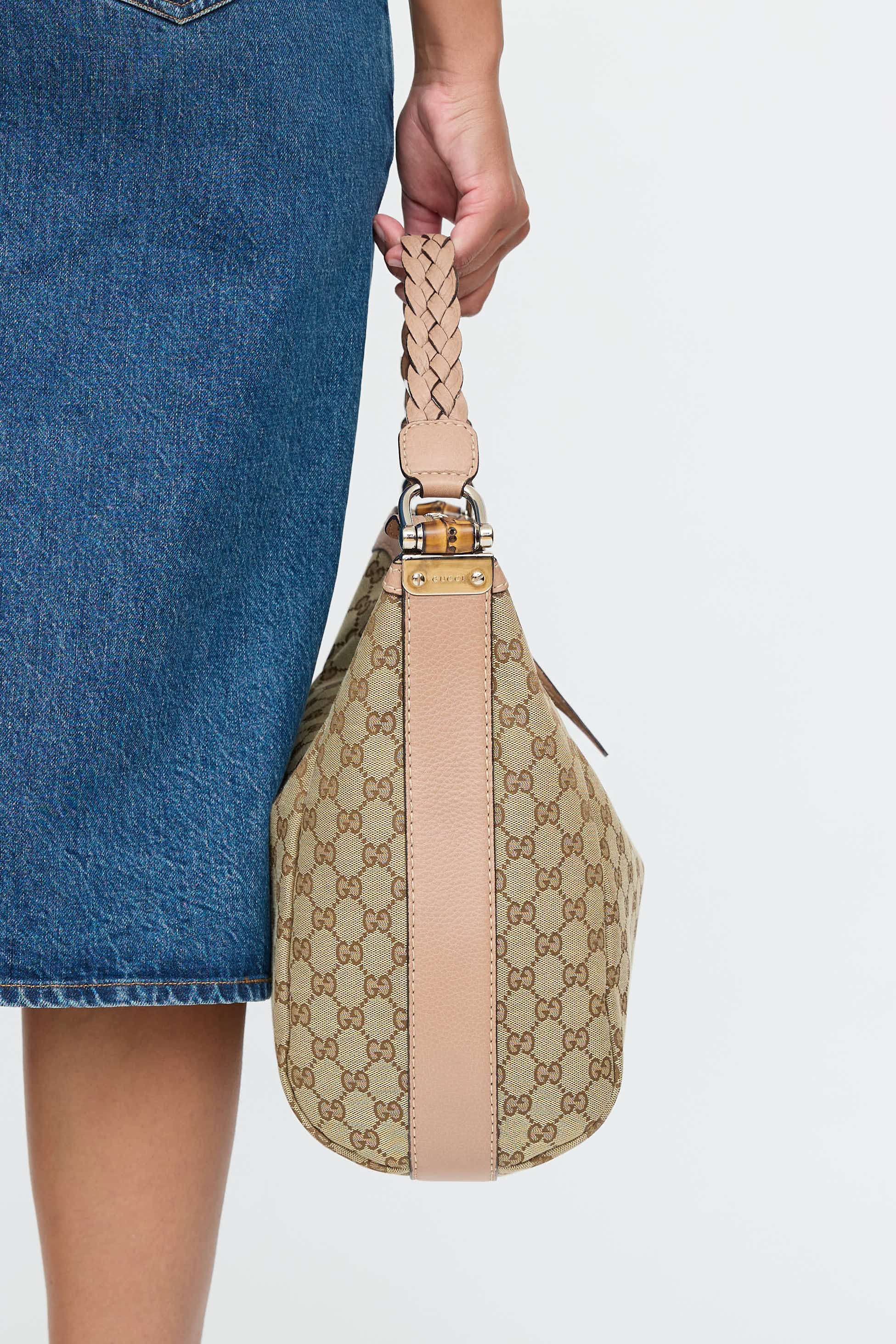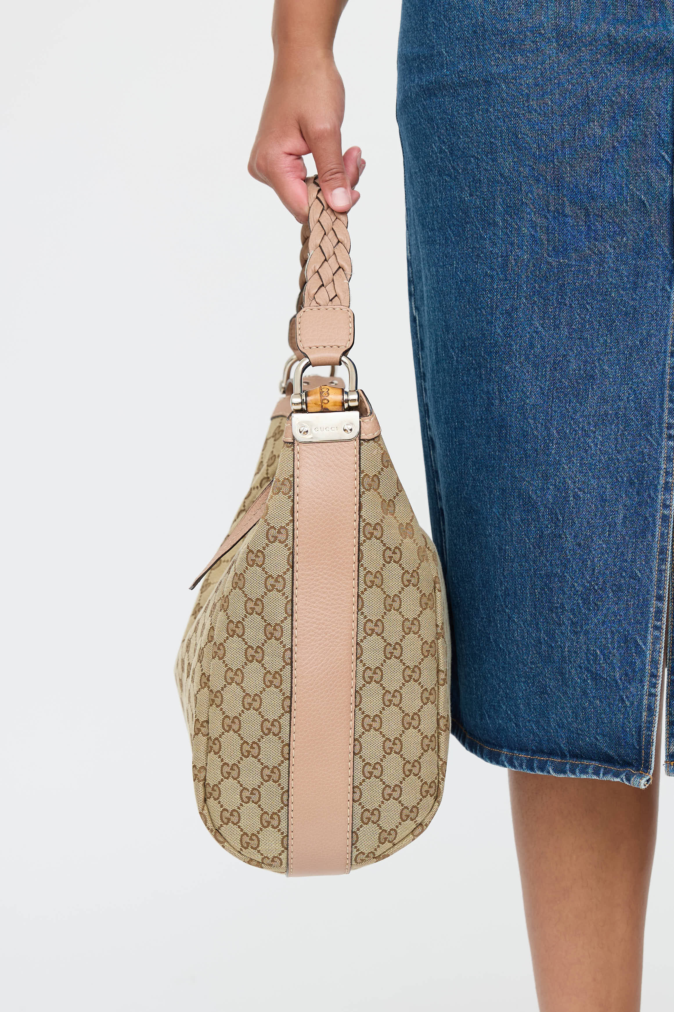 Pre-owned Gucci brown GG Canvas Bamboo Bar bag featuring singular braided top handle, silver tone D buckles with bamboo detail at side, leather trim, top zip closure with pull tab, and one main compartment with one zip pocket, and two slip pockets.