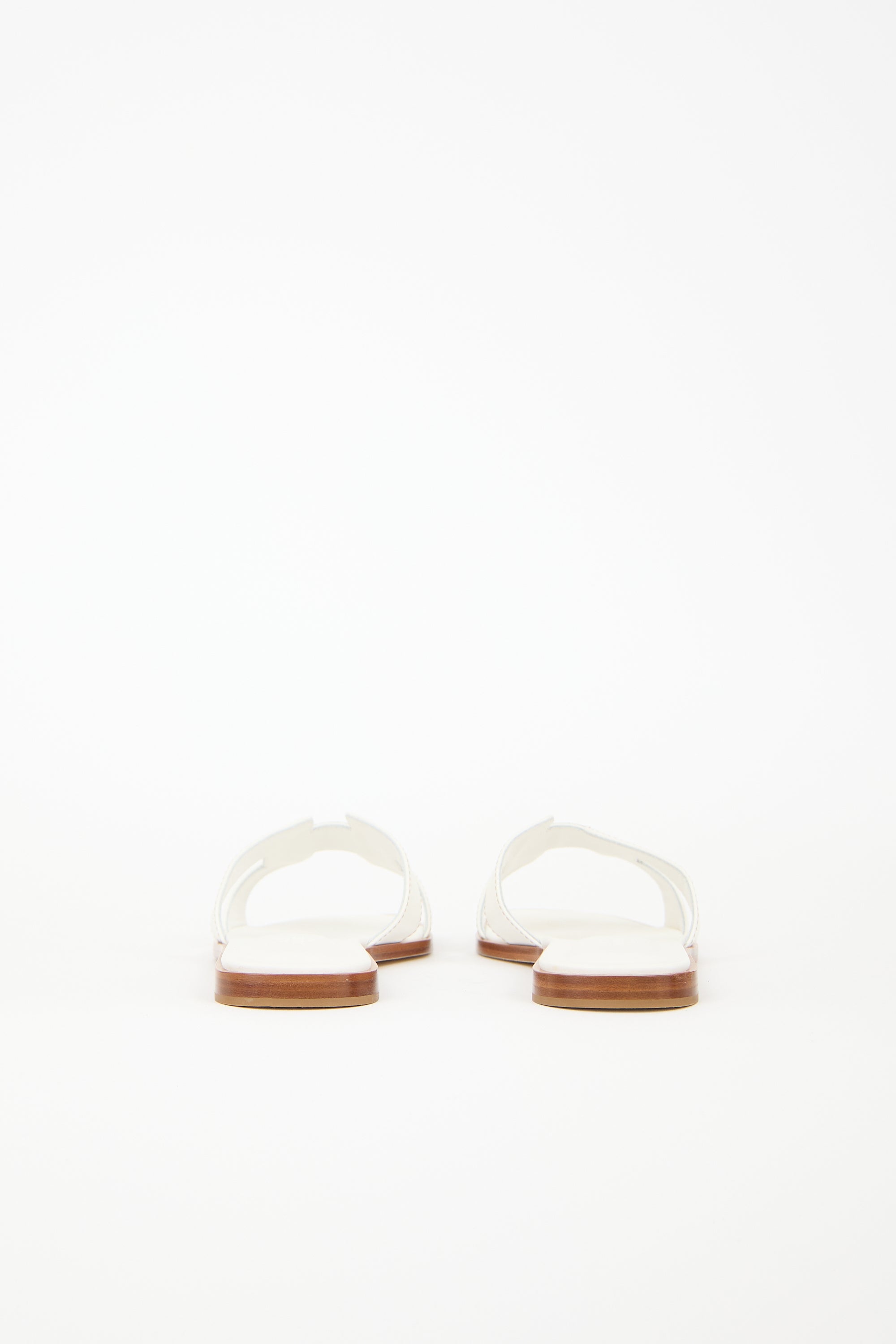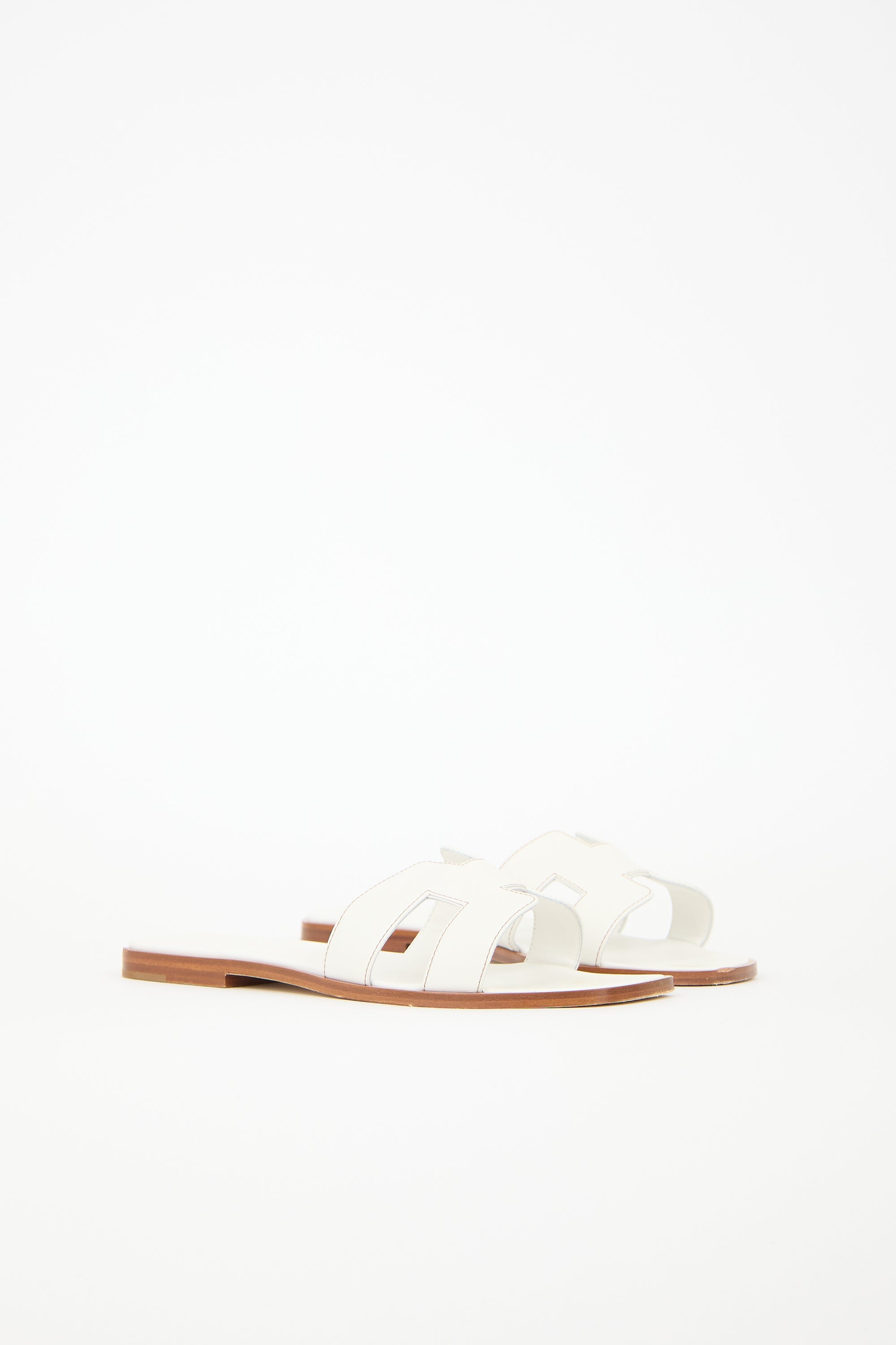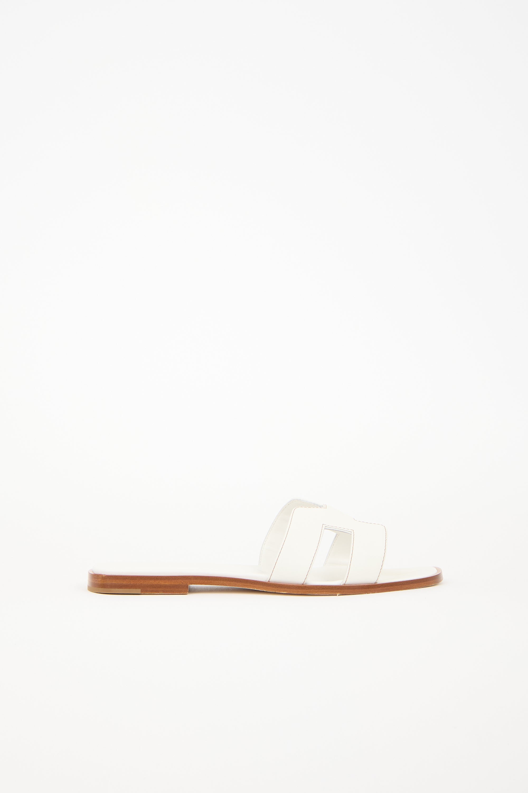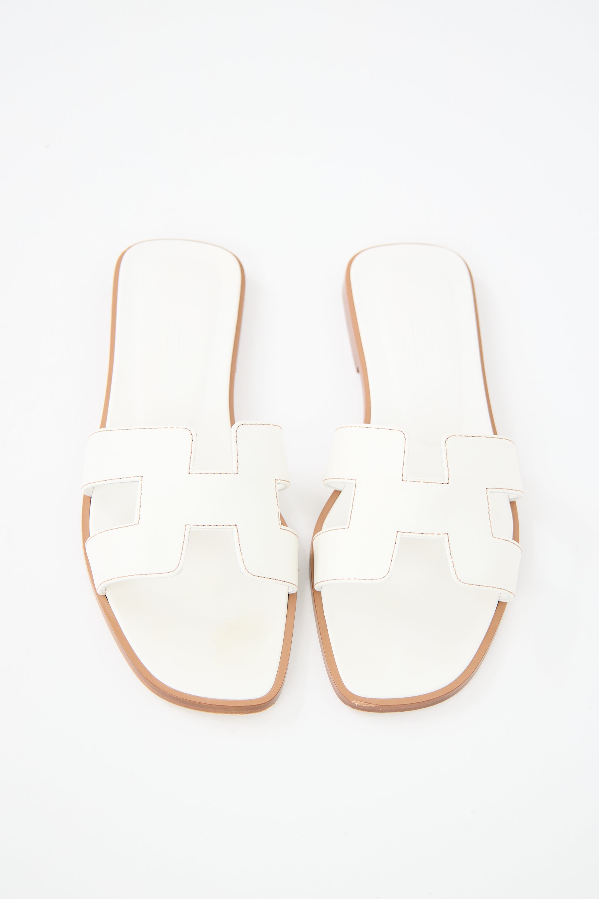 Pre-owned Hermès white leather Oran sandals featuring open square toe, cut out "H' at vamp, and short stacked heel. Comes with original dust bags.