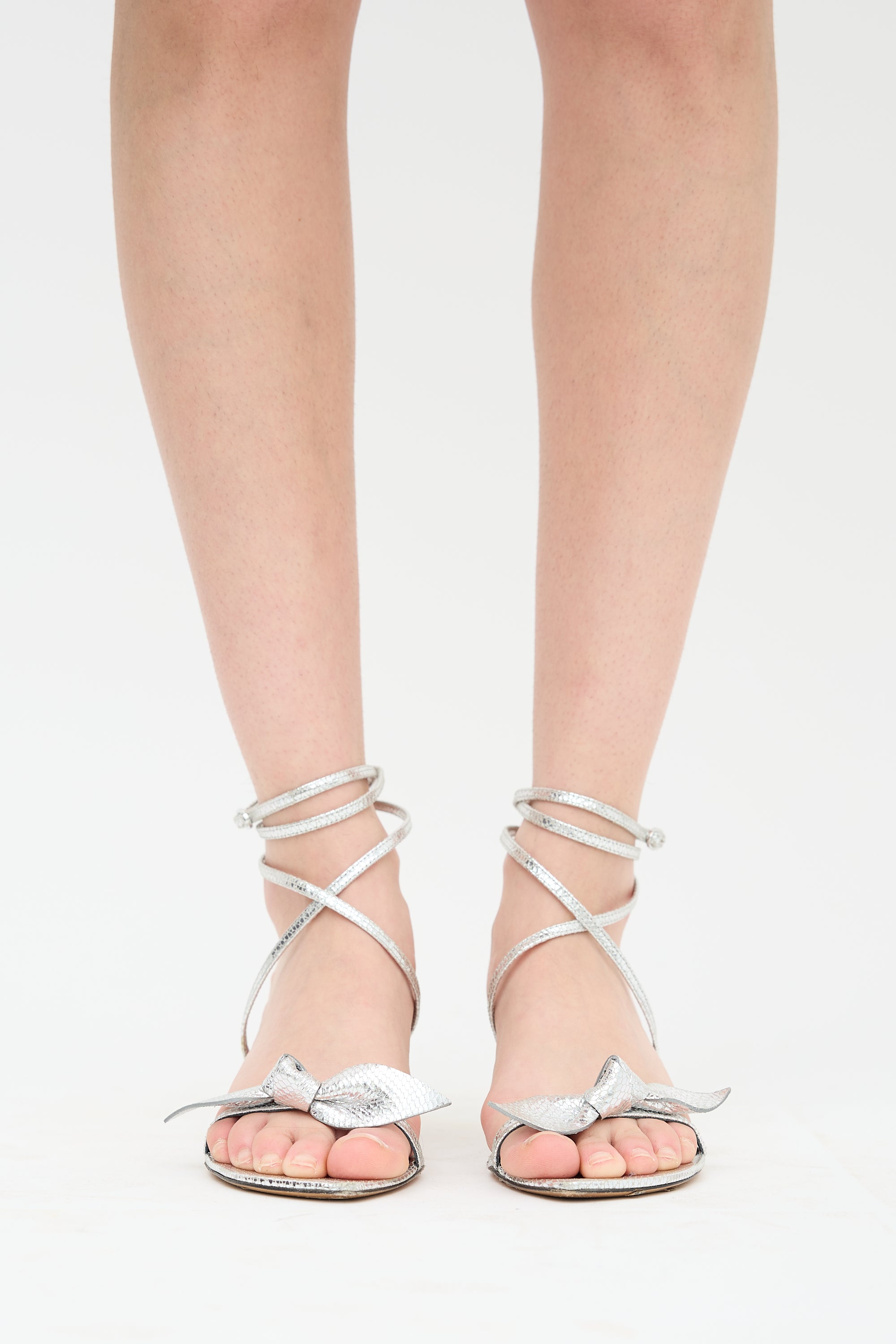 Pre-owned Isabel Marant silver tone Aldine heels featuring open asymmetrical pointed toe, textured metallic leather upper, knot strap across vamp, adjustable wraparound ankle strap, and covered kitten heel.
