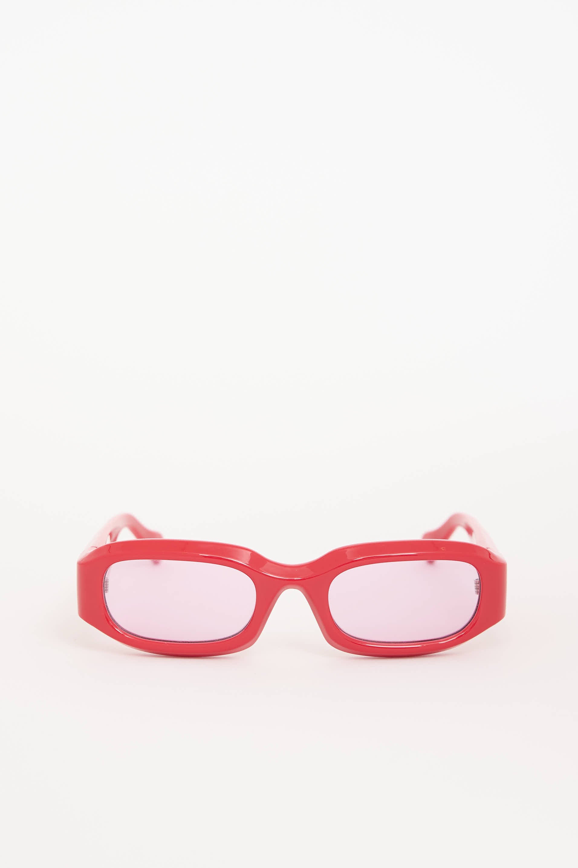 Pre-owned Heaven Marc Jacobs red L7QUR sunglasses featuring a rectangular frame, pink tint lens, and thick red arms with silver tone logo at temple.