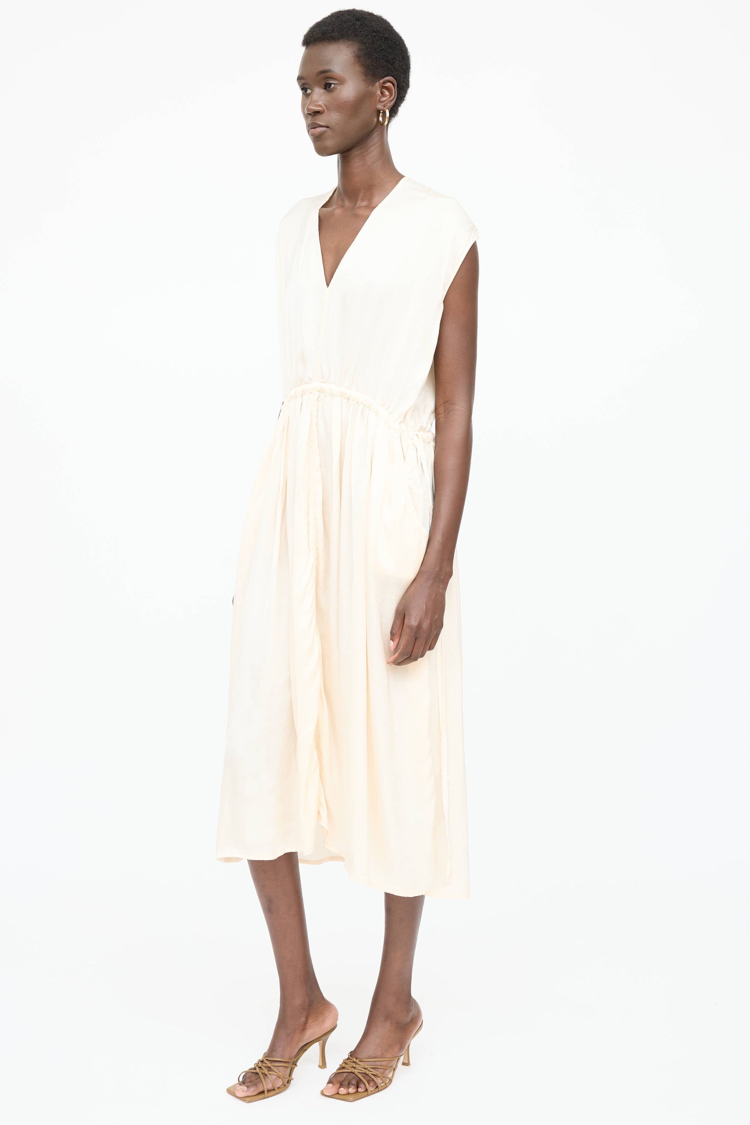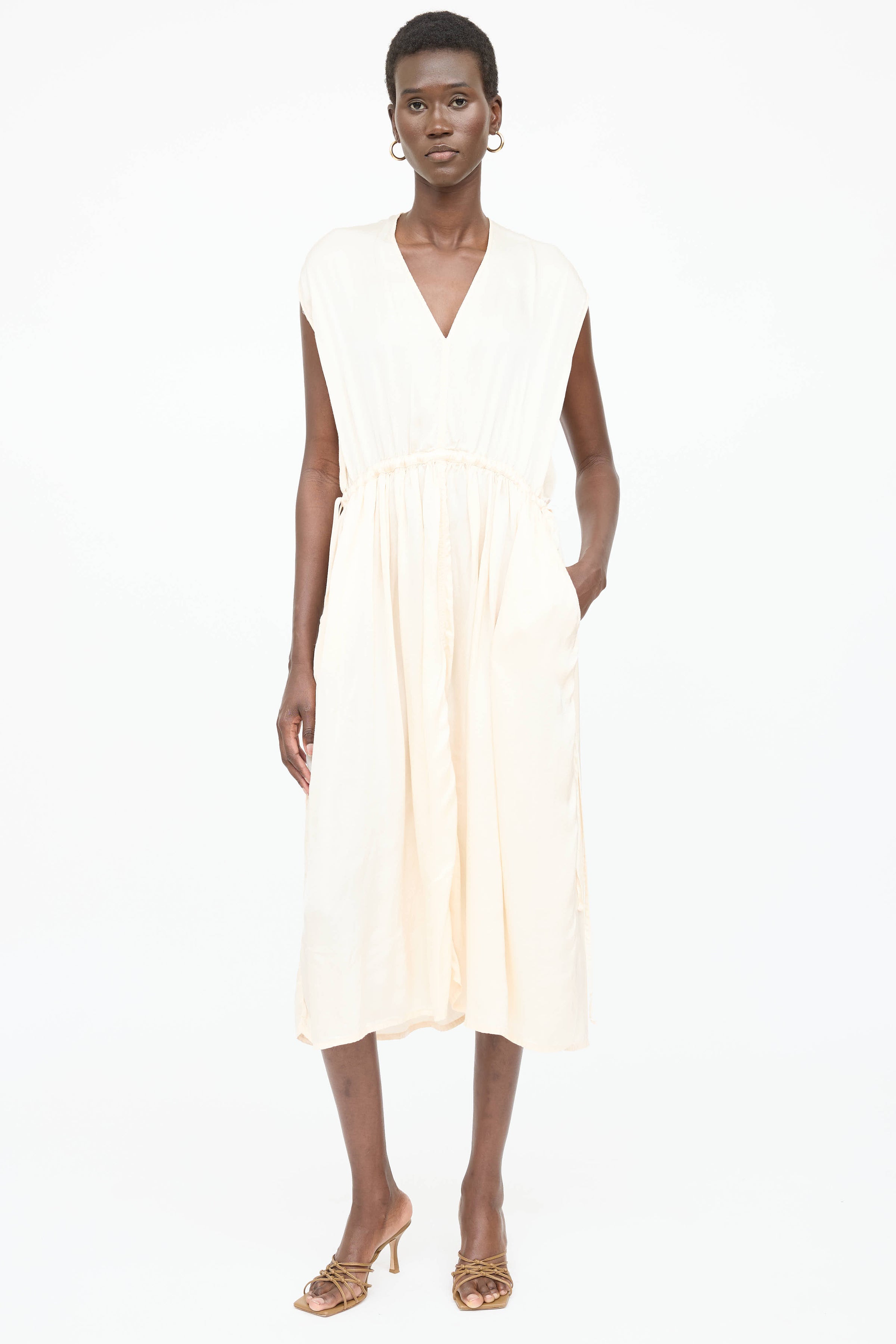 Pre-owned Raquel Allegra cream satin dress featuring a V-neckline, sleeveless styling, panelled seams, adjustable tie waist, and two slip pockets at hip.