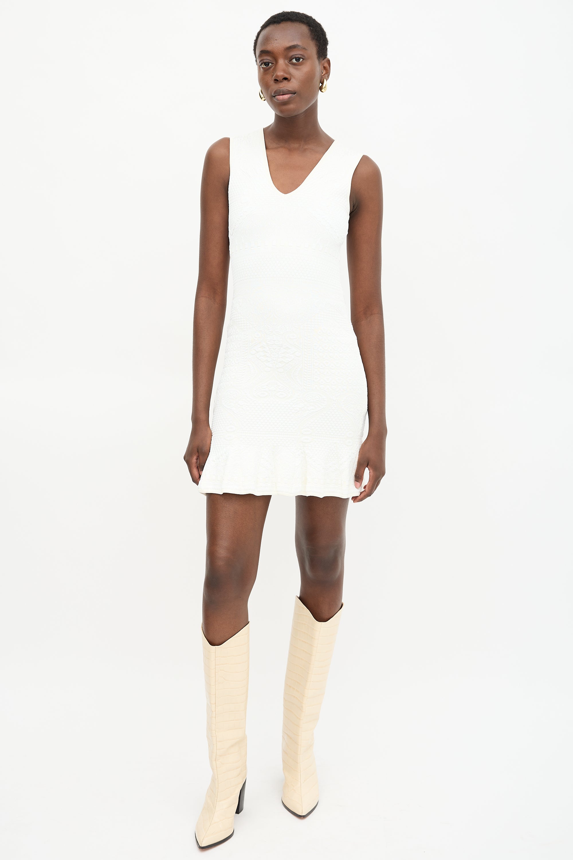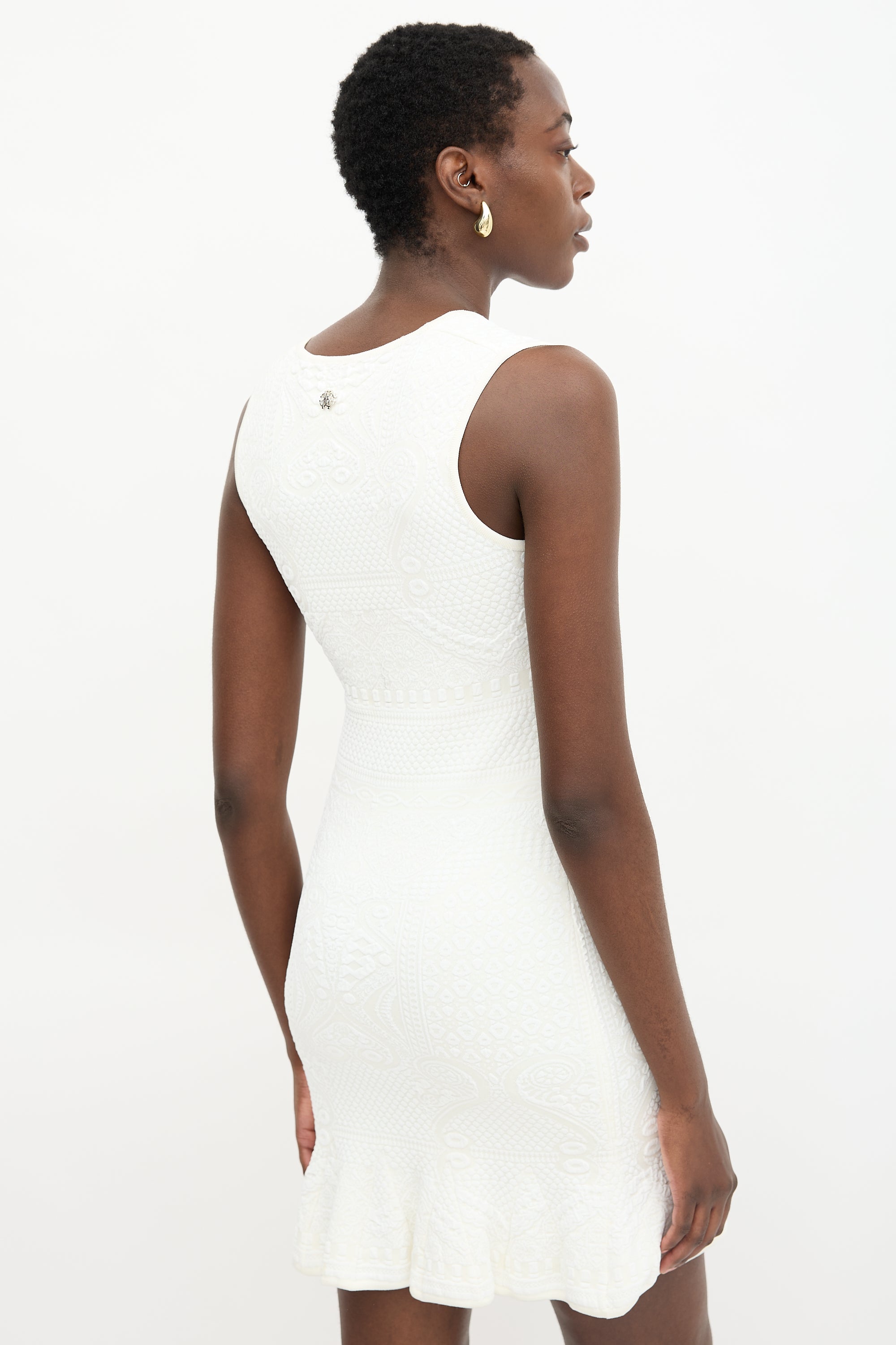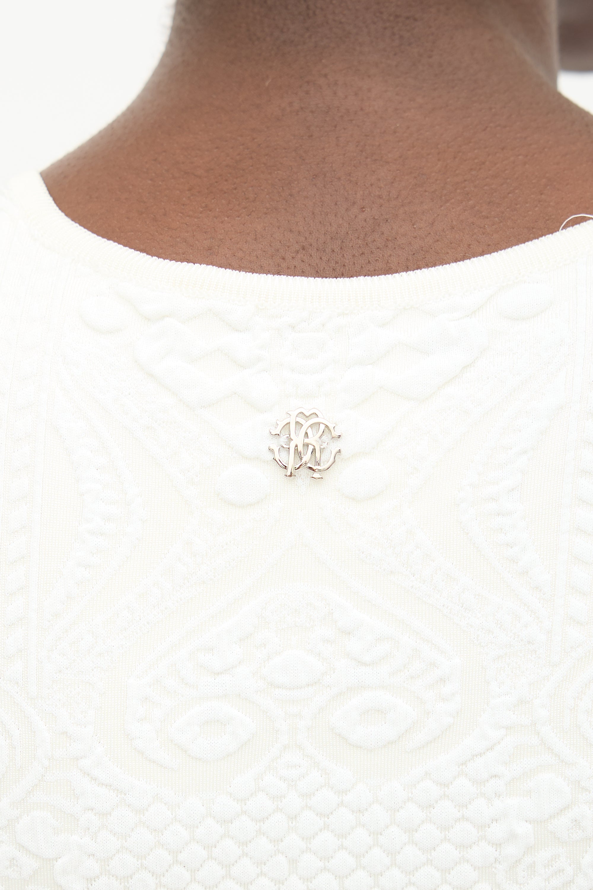 Pre-owned Roberto Cavalli white knit dress featuring mixed tonal geometric and paisley jacquard, V-neckline, and silver tone logo embellishment at back collar. Unlined.