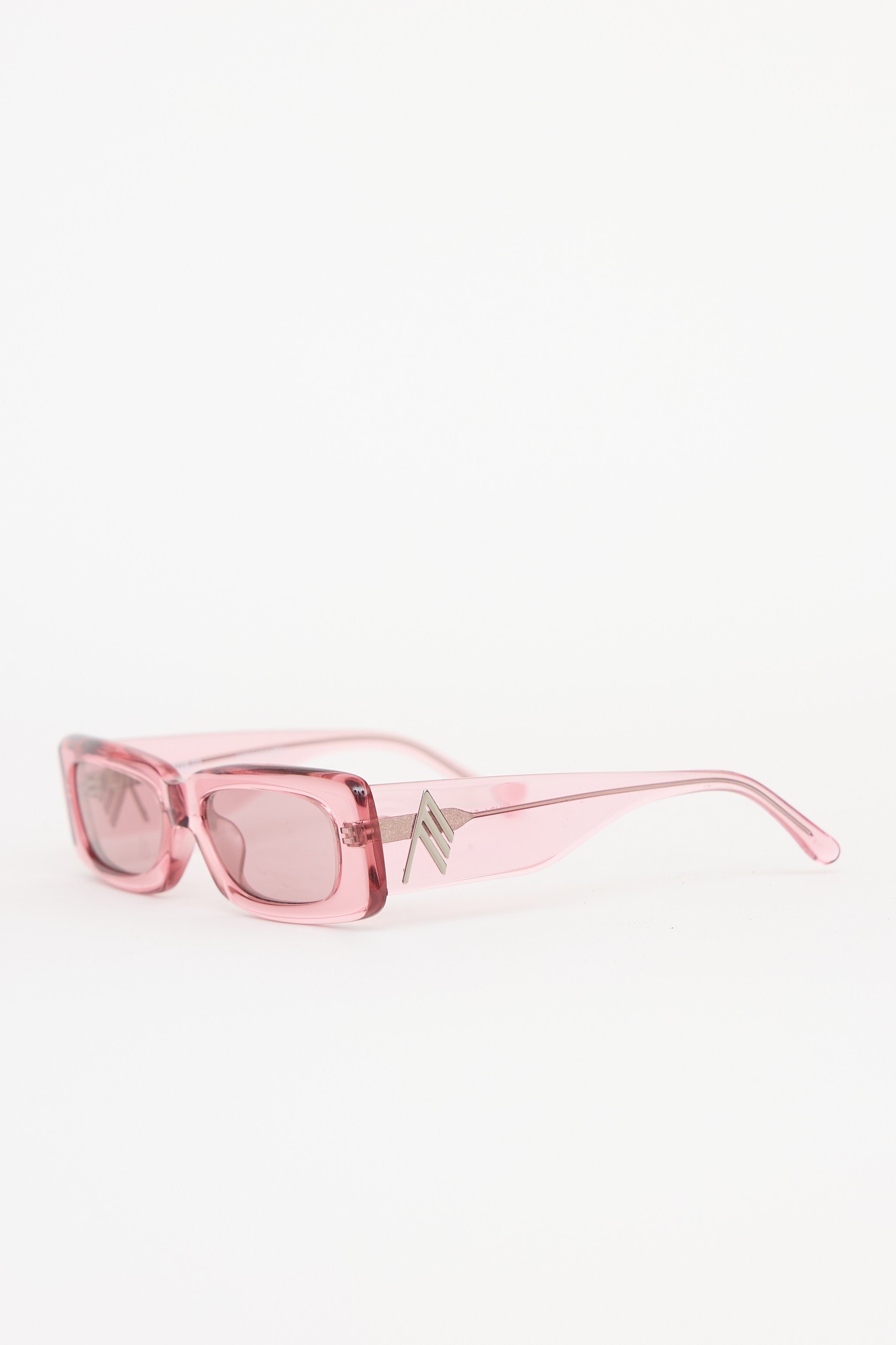 Pre-owned The Attico pink mini Marfa sunglasses featuring pink tinted lenses, translucent rectangular frames, and silver tone logo at temples.