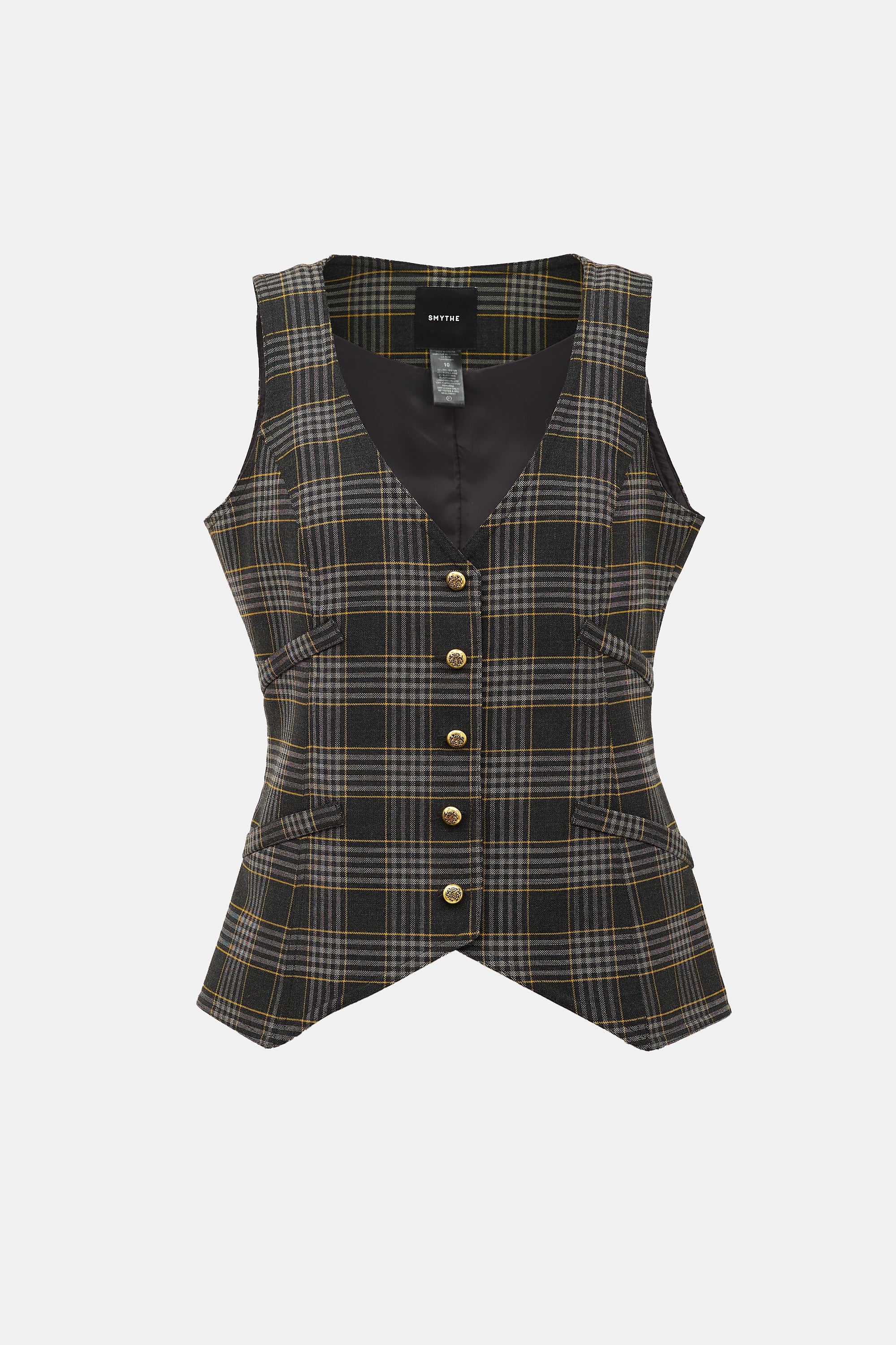 Pre-owned Smythe wool blend vest featuring a grey and yellow check pattern, V-neckline, button front, and decorative welts. Lined.