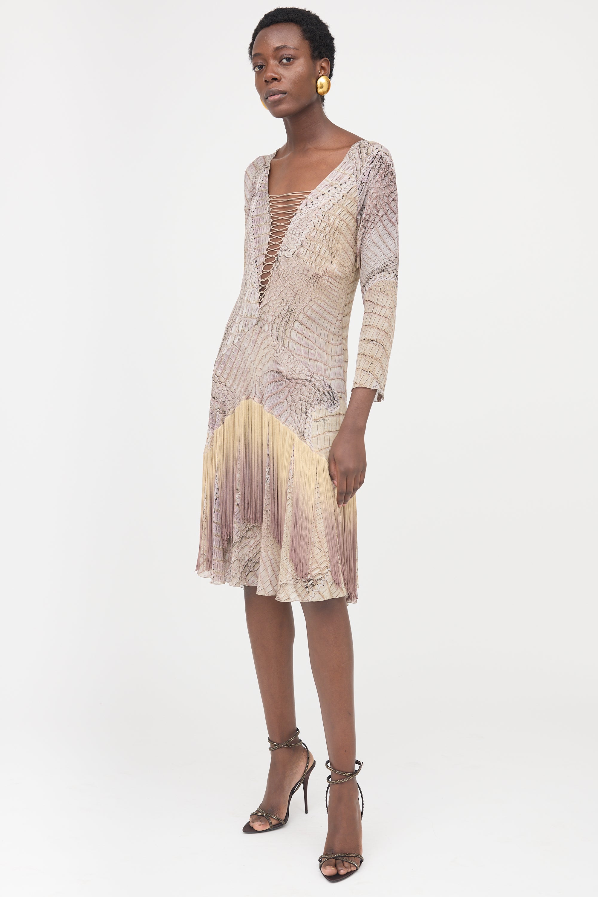 Pre-owned Roberto Cavalli Spring/Summer 2011 silk dress featuring a beige crocodile skin print, V-neckline and lace up detail, concealed side zip, and layered skirt with fringe trim. Partially lined.