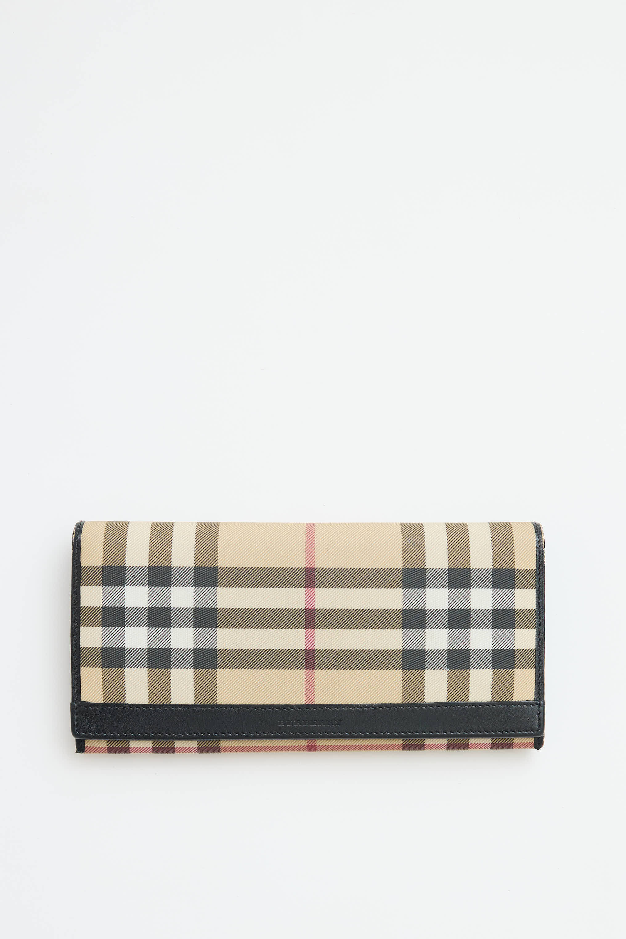 Pre-owned Burberry cream and black long wallet featuring Nova check pattern, debossed logo at front, top flap, two bill slots, one zip pocket, and 10 card slots.