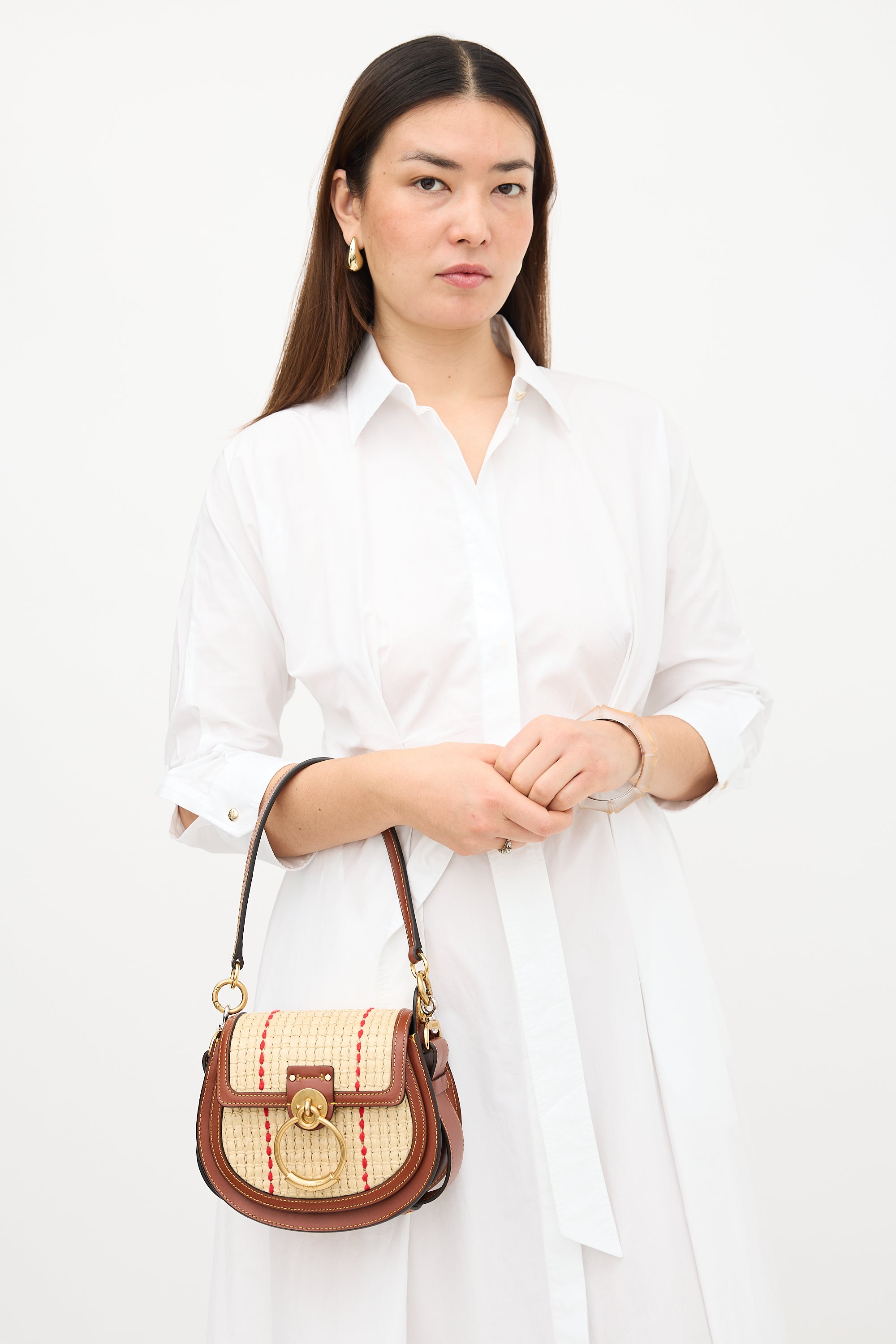 Pre-owned Chloé brown and beige raffia small Tess bag featuring leather trims, gold tone hardware, detachable leather top handle, detachable grosgrain shoulder strap, top flap with snap button closure, large ring hardware at front with debossed logo, red stitching throughout woven straw body, one slip pocket under flap, and one main compartment with one card slot. Comes with original dust bag.