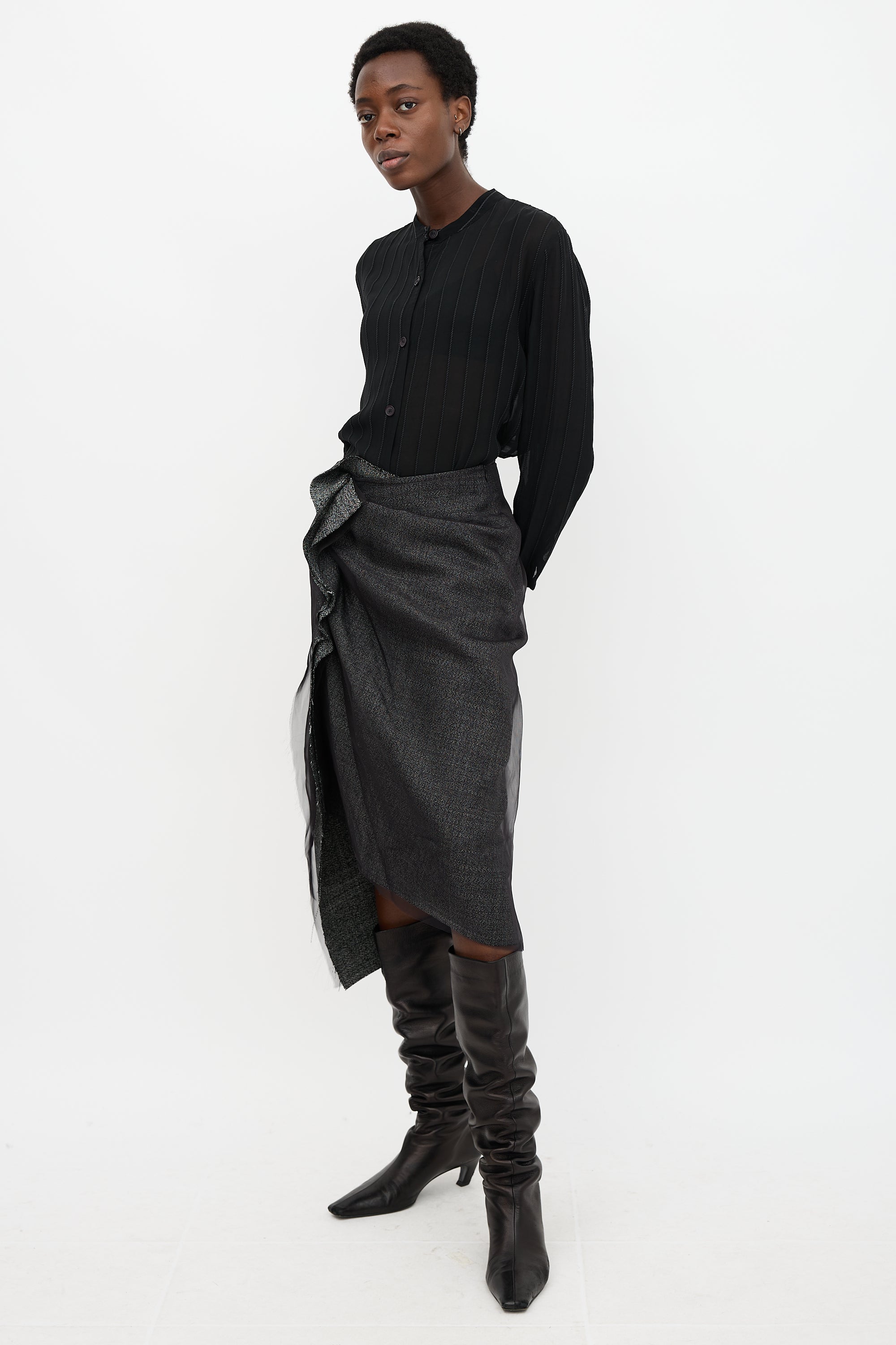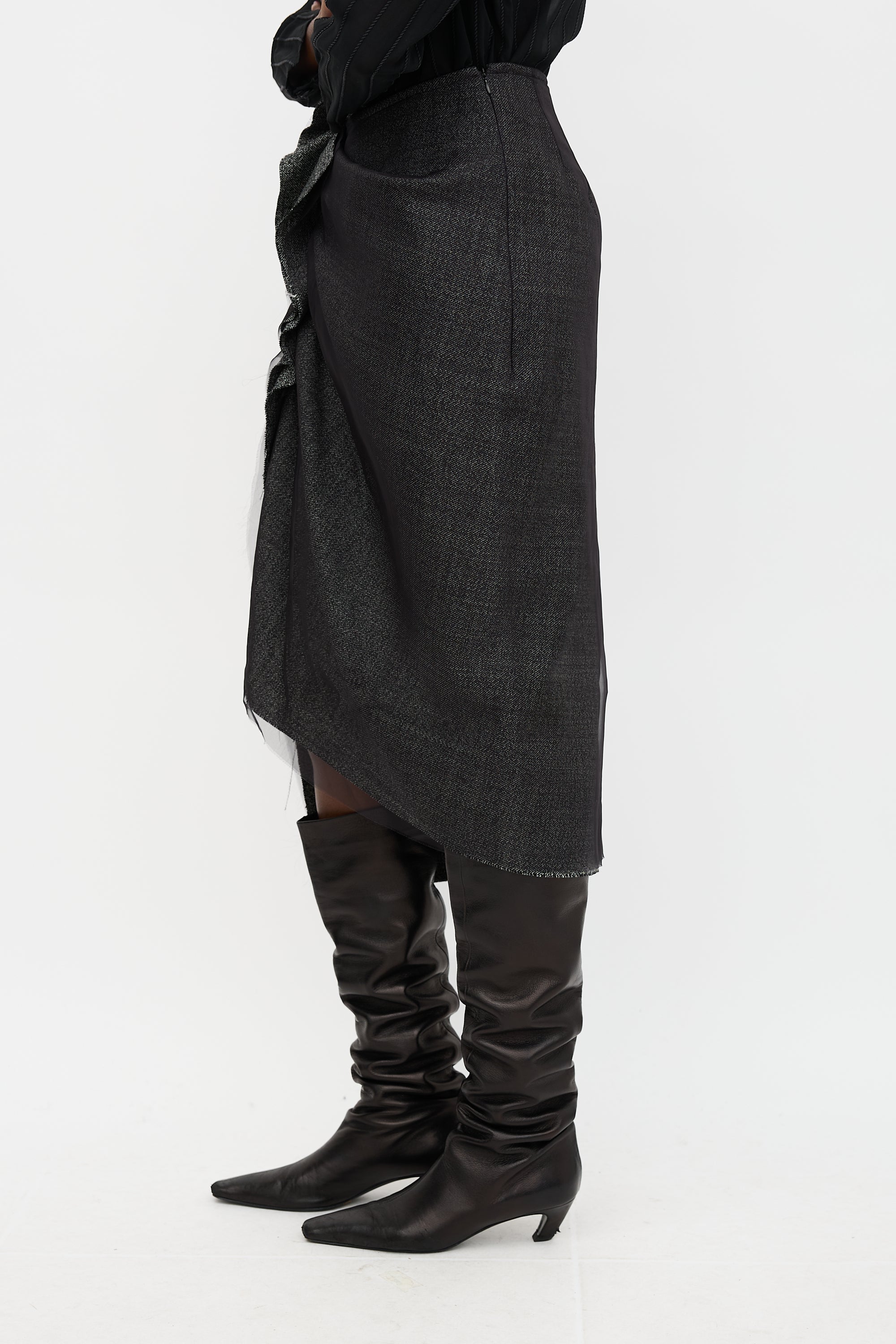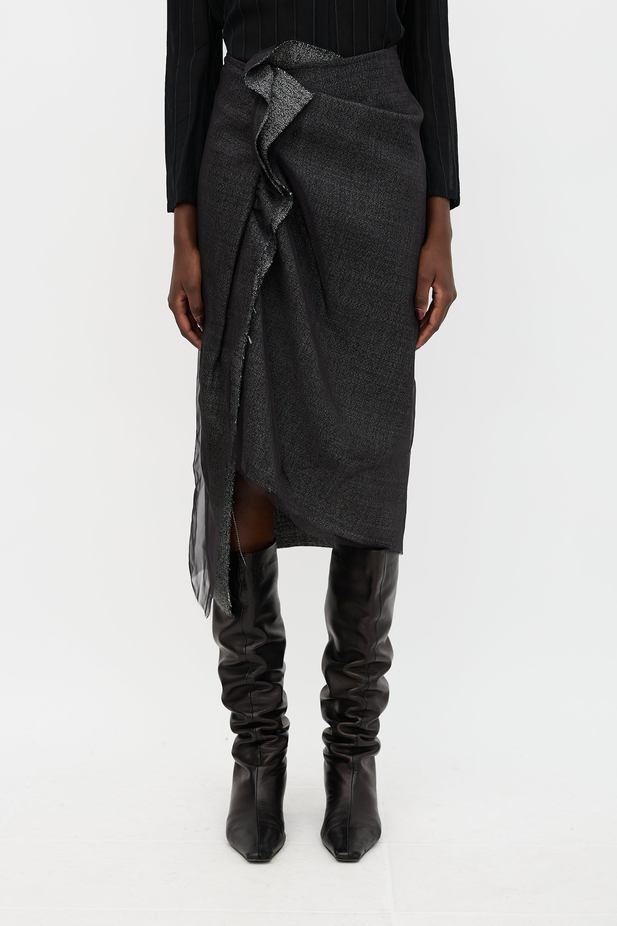 Pre-owned Dries Van Noten grey wool skirt featuring black sheer overlay, ruffle at front, zip closure at side, and raw hem.