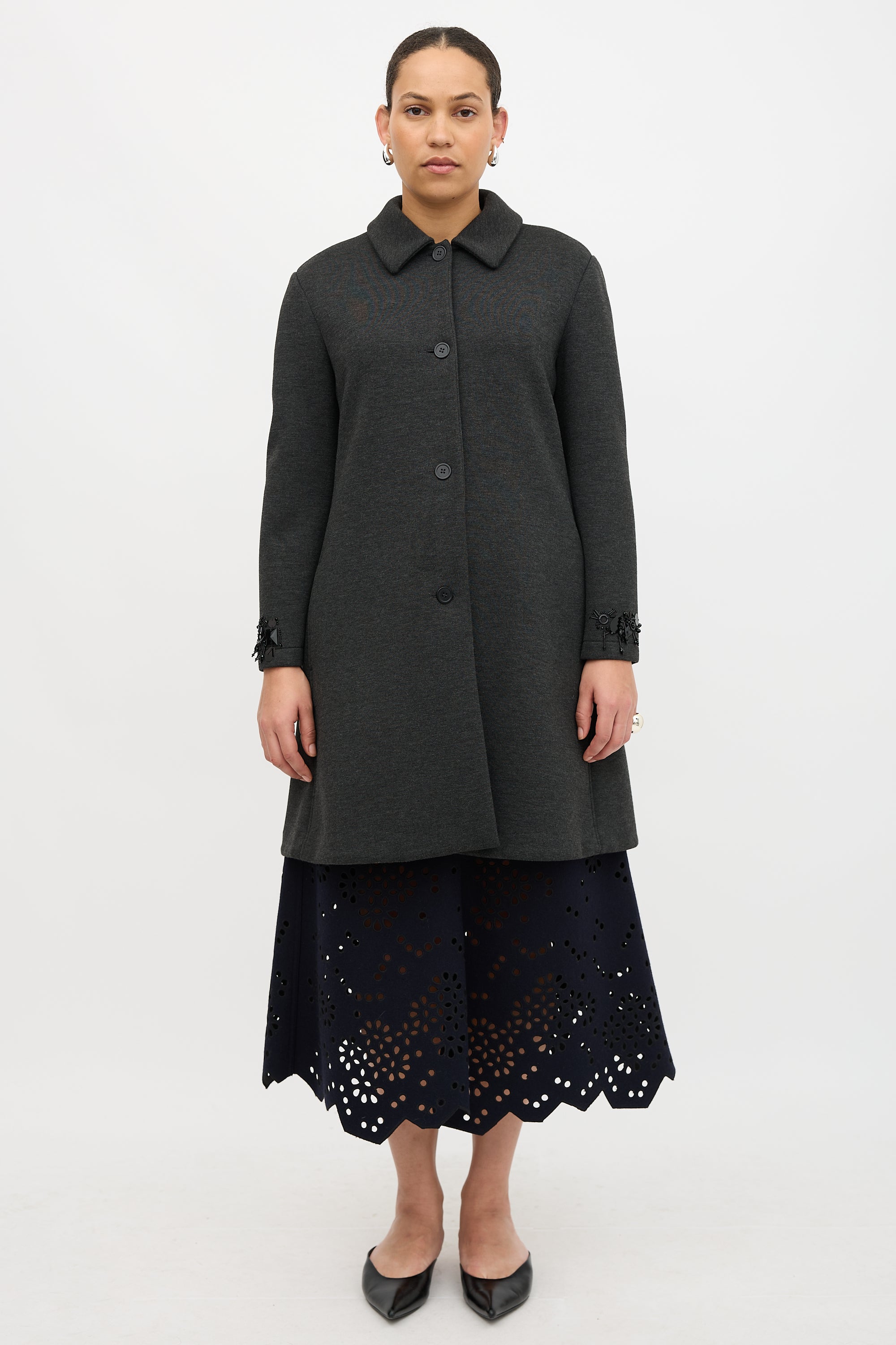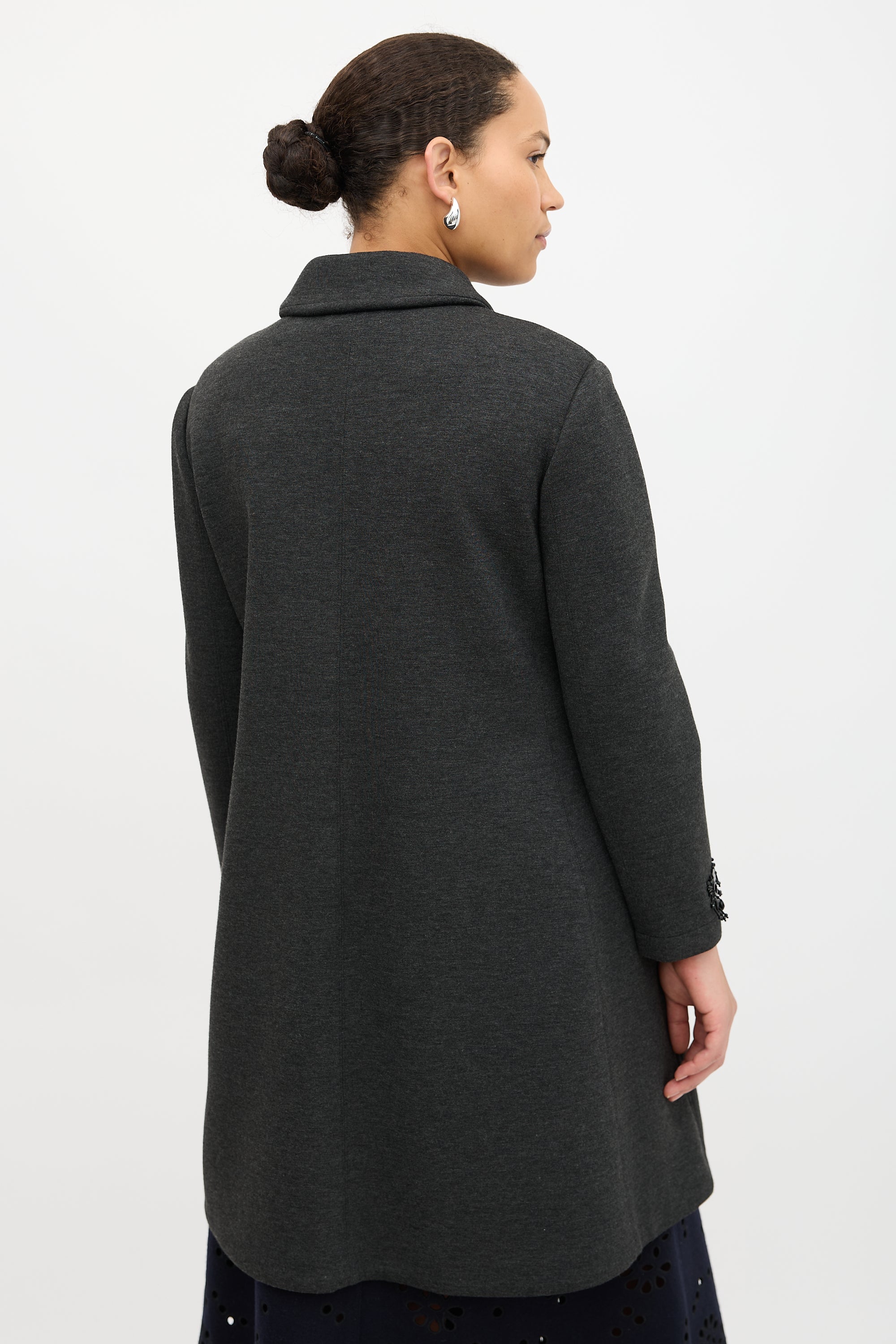 Pre-owned Max Mara S dark grey jersey coat featuring spread collar, button up front, in seam pockets, and black embellishments at cuffs.