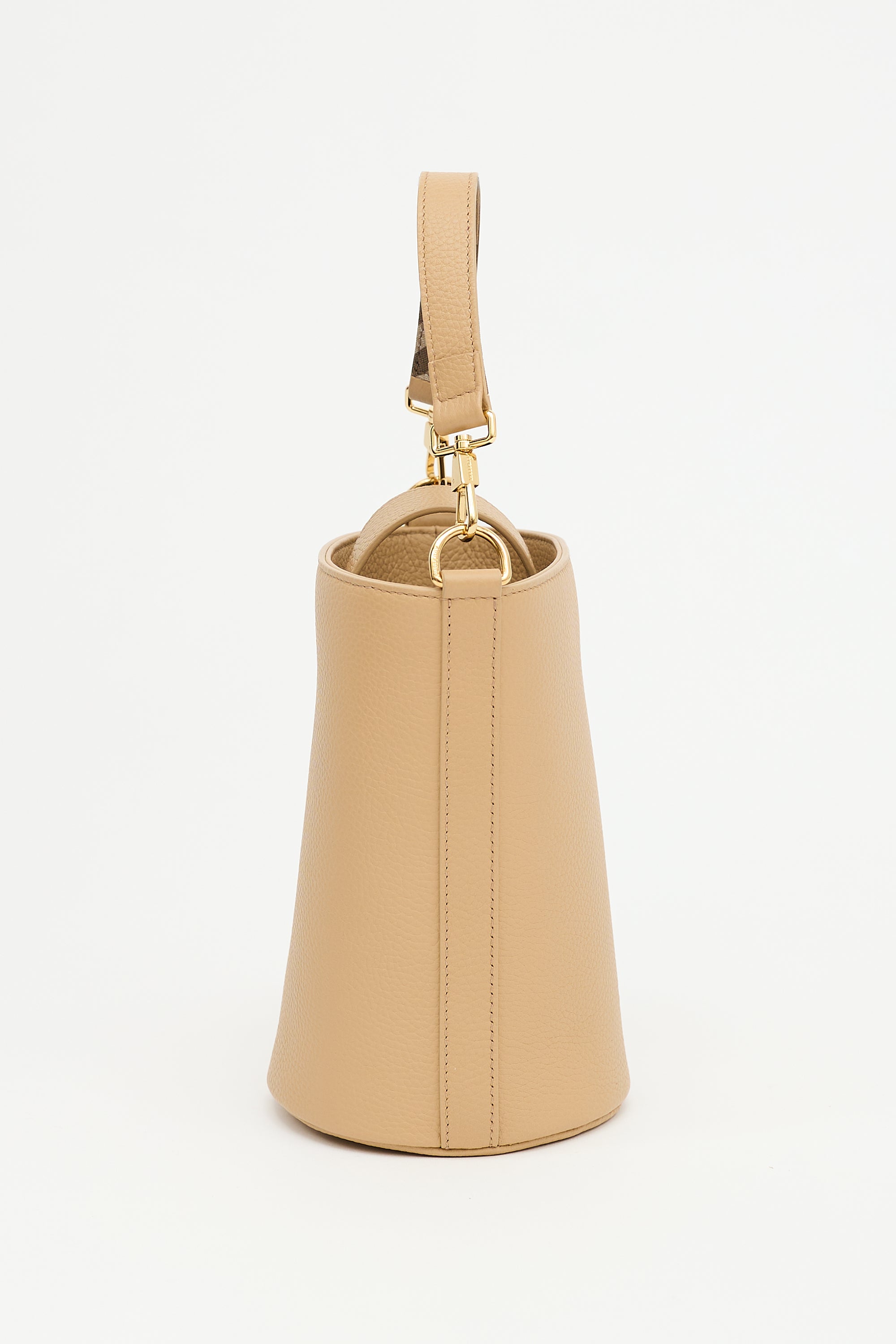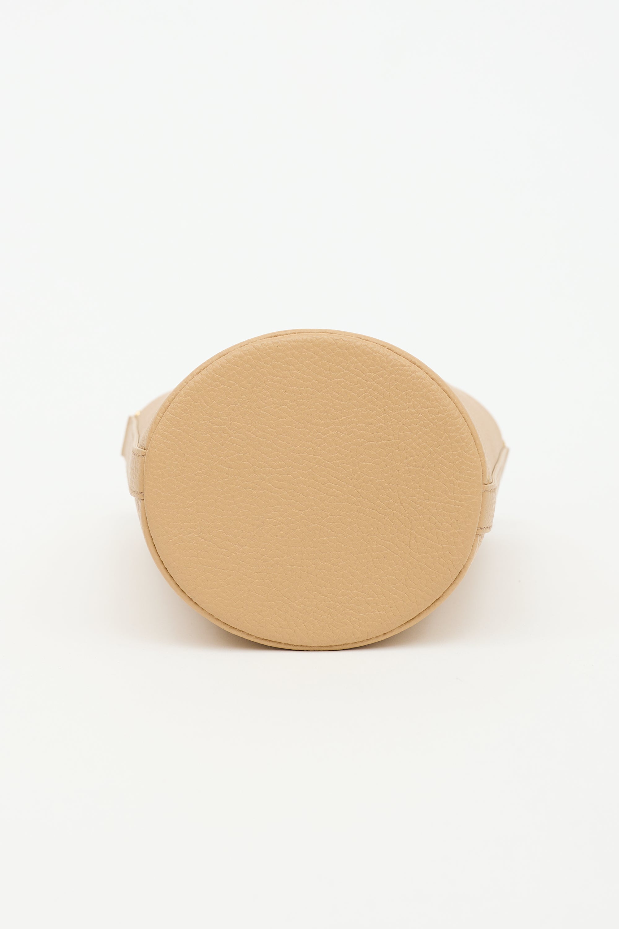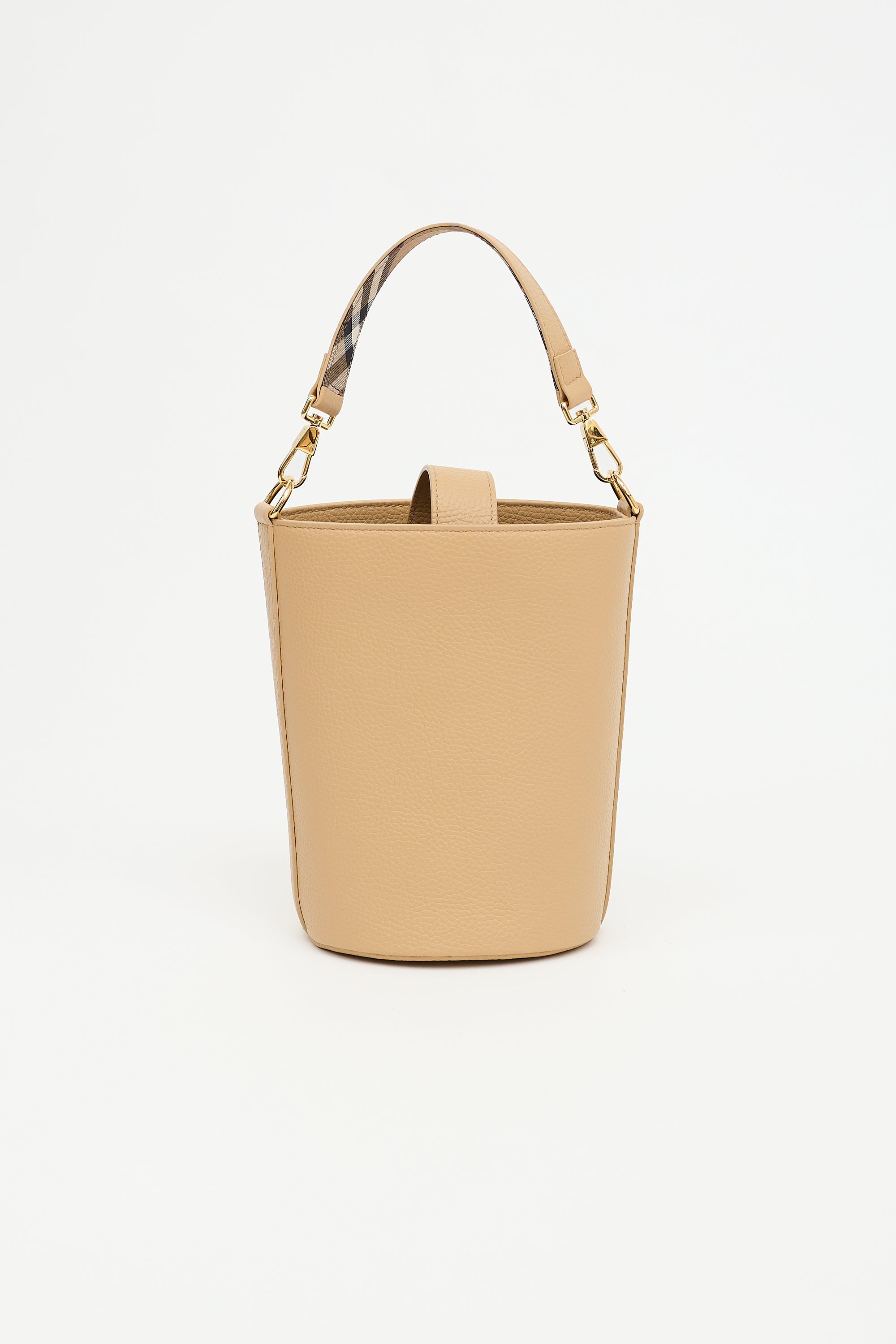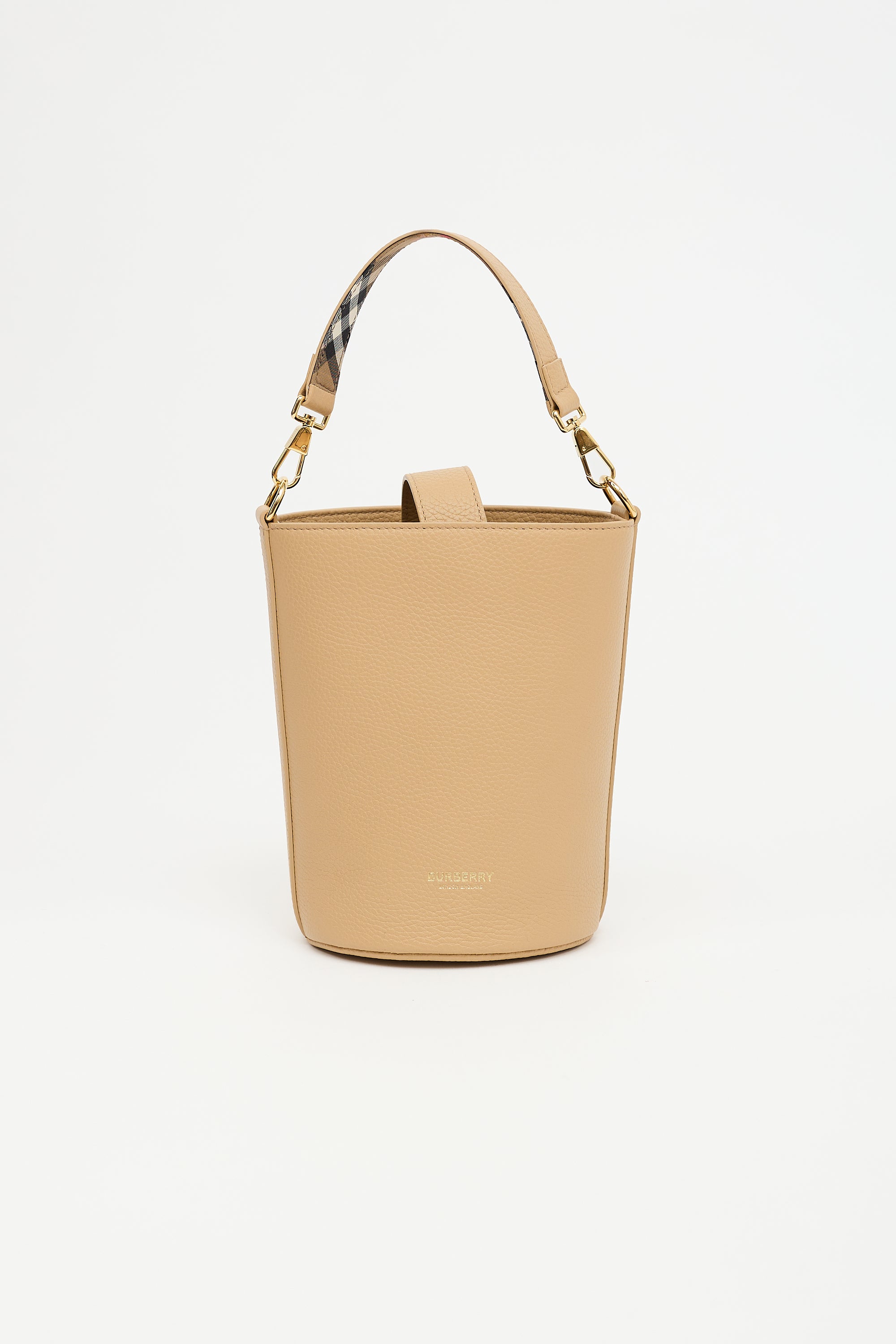 Pre-owned Burberry beige leather bucket bag featuring detachable top handle, detachable and adjustable crossbody strap, Nova check print at lining and under bag straps, gold stamped logo at front, open top with buttoned strap, and one main compartment. Includes original dust bag.