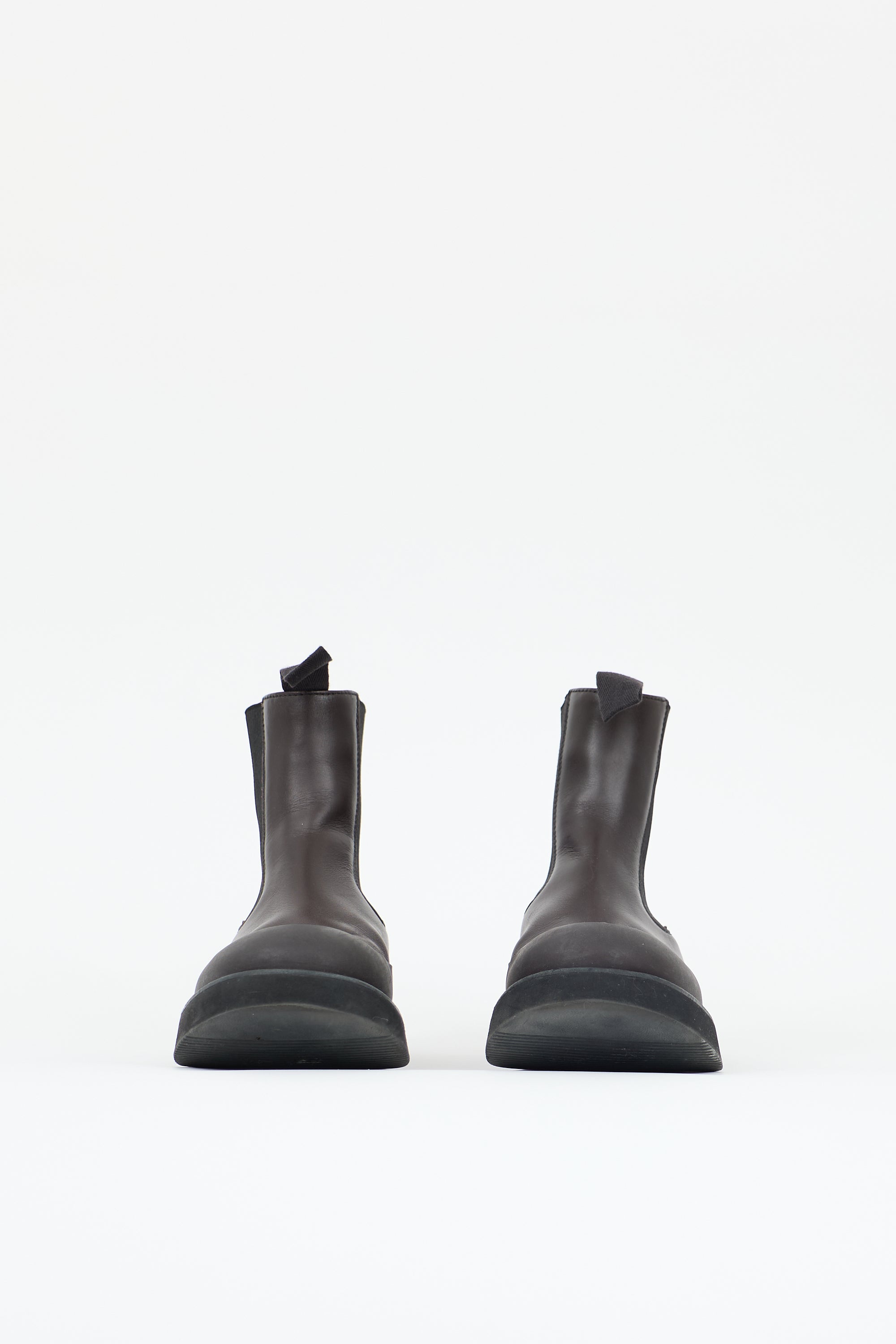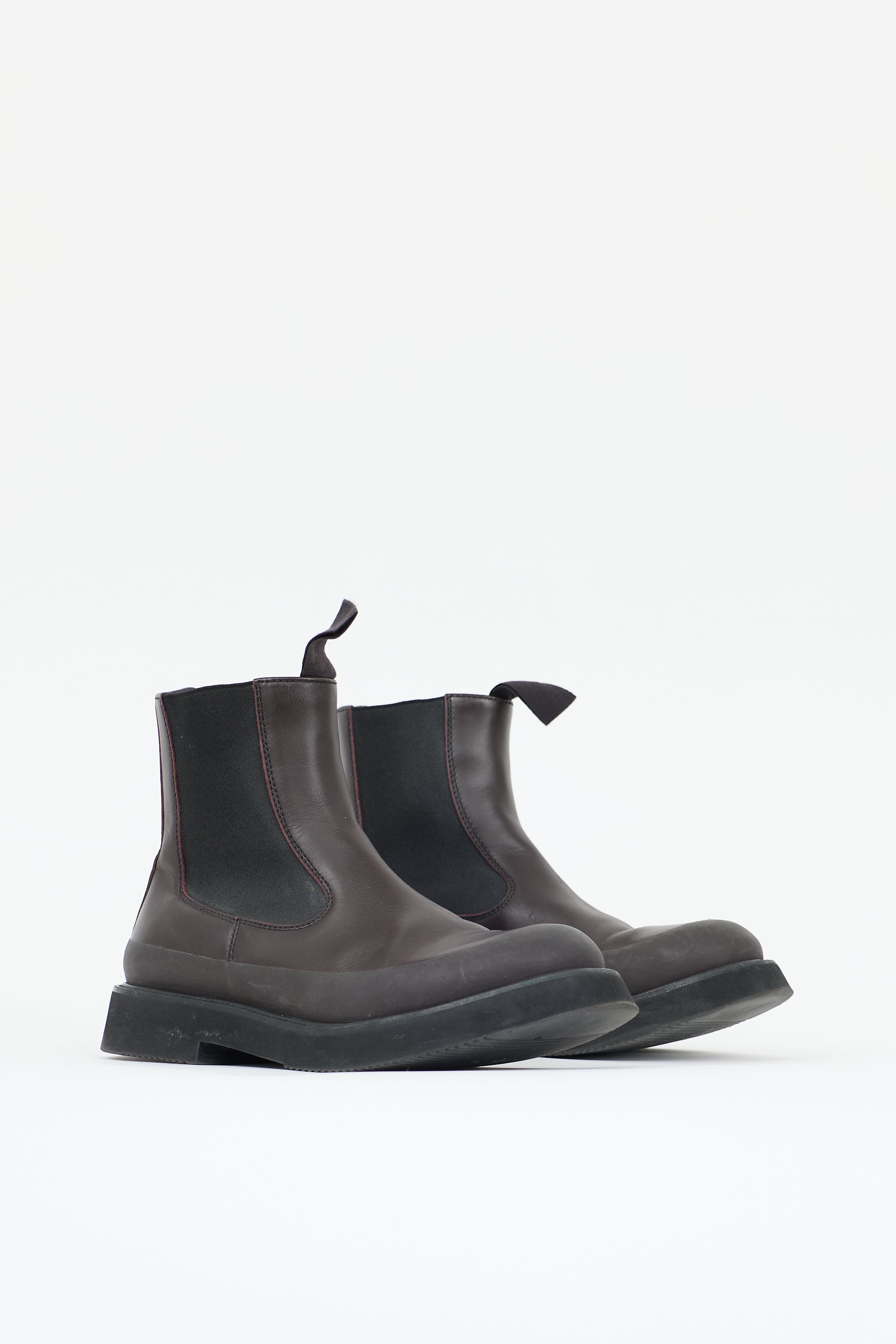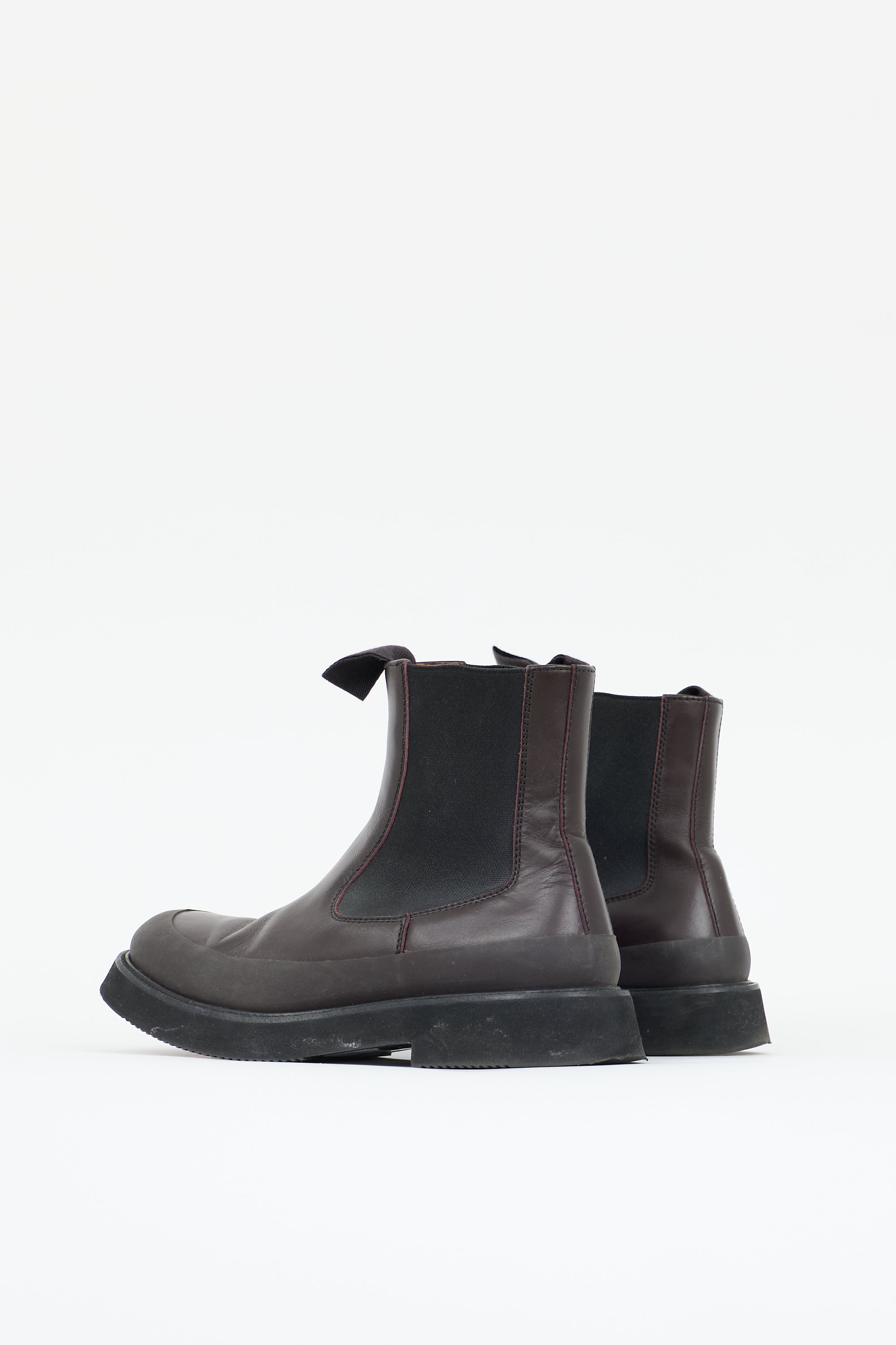 Pre-owned Celine Spring Summer 2016 brown leather chelsea boots featuring a rounded toe, rubber panel, black elasticized gusset at sides, grosgrain pull tabs at collar, and foam rubber outsole. Phoebe Philo era design.