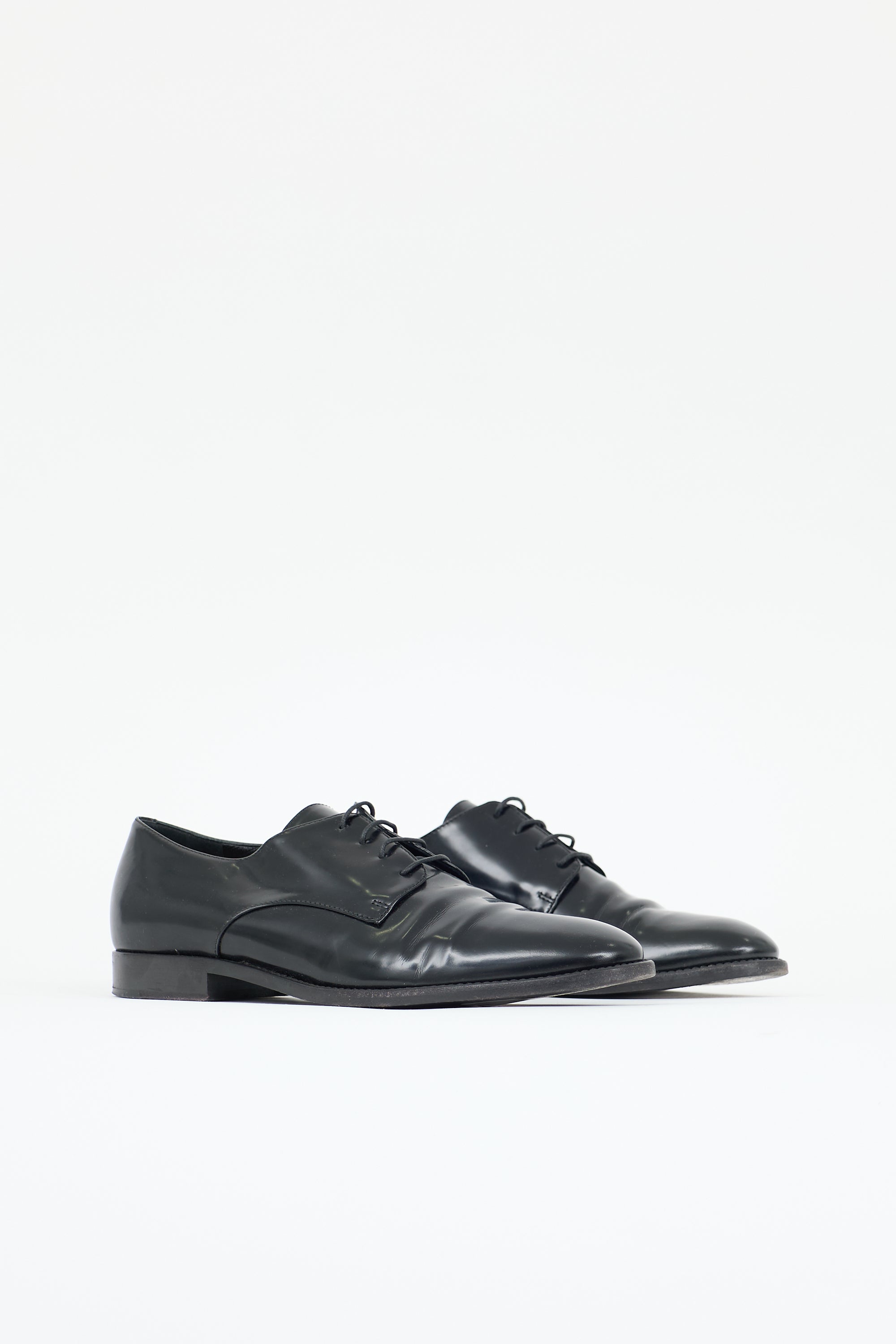 Pre-owned Christian Dior black leather derby featuring a rounded toe, lace up front, and stacked leather heel.
