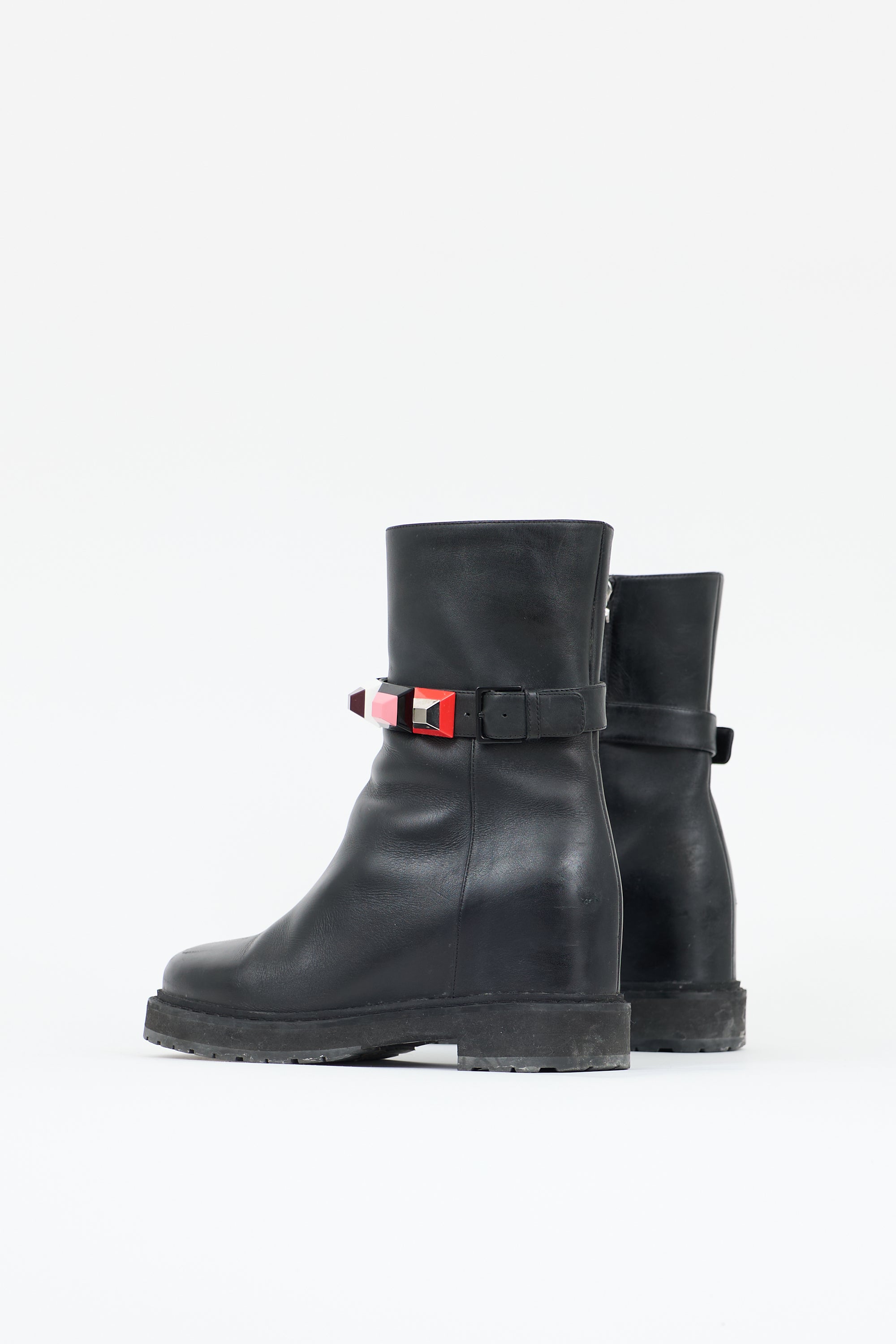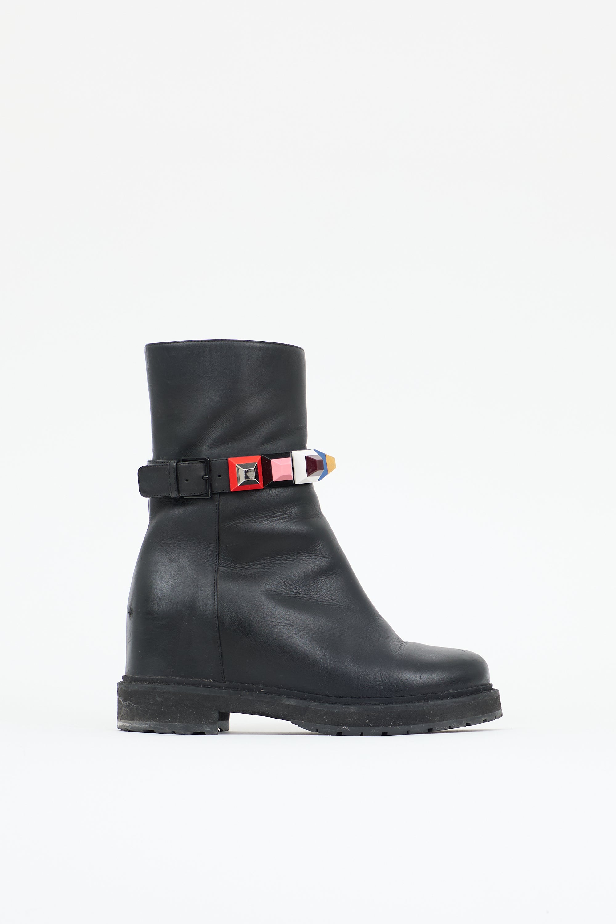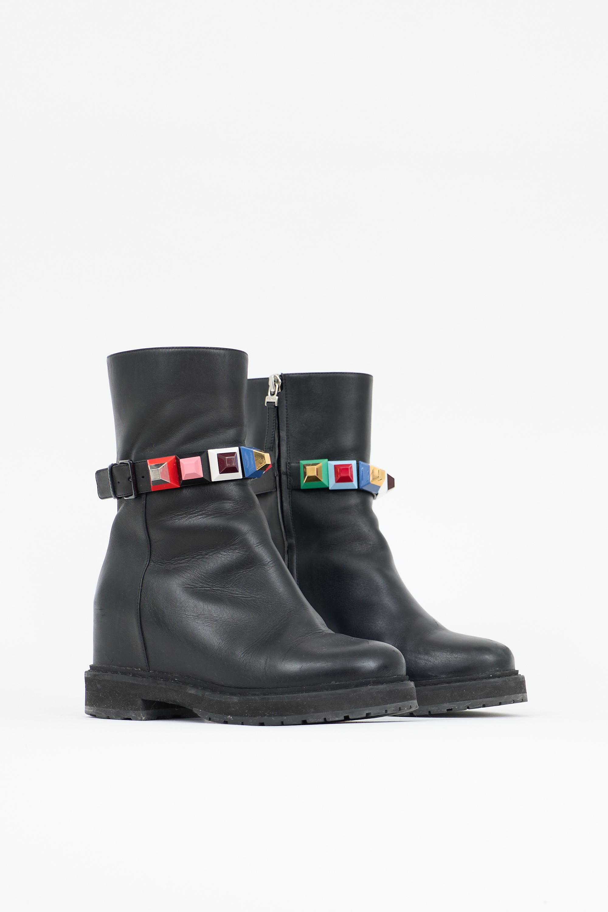 Pre-owned Fendi black leather moto style boots featuring a rounded toe, inner side zip closure, strap around ankle with multicolour stud embellishments, interior wedge, and a rubber sole. Comes with original dust bags.