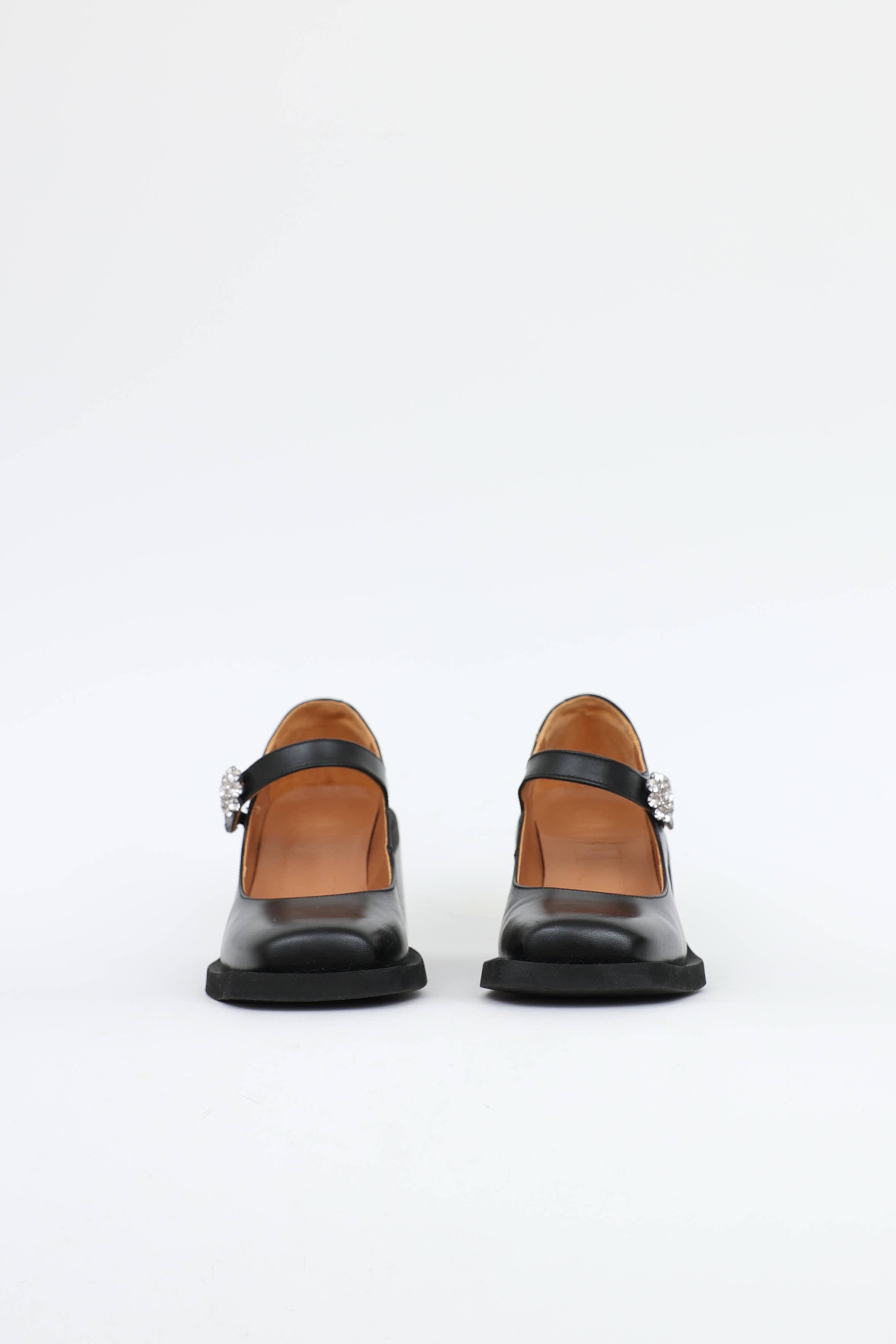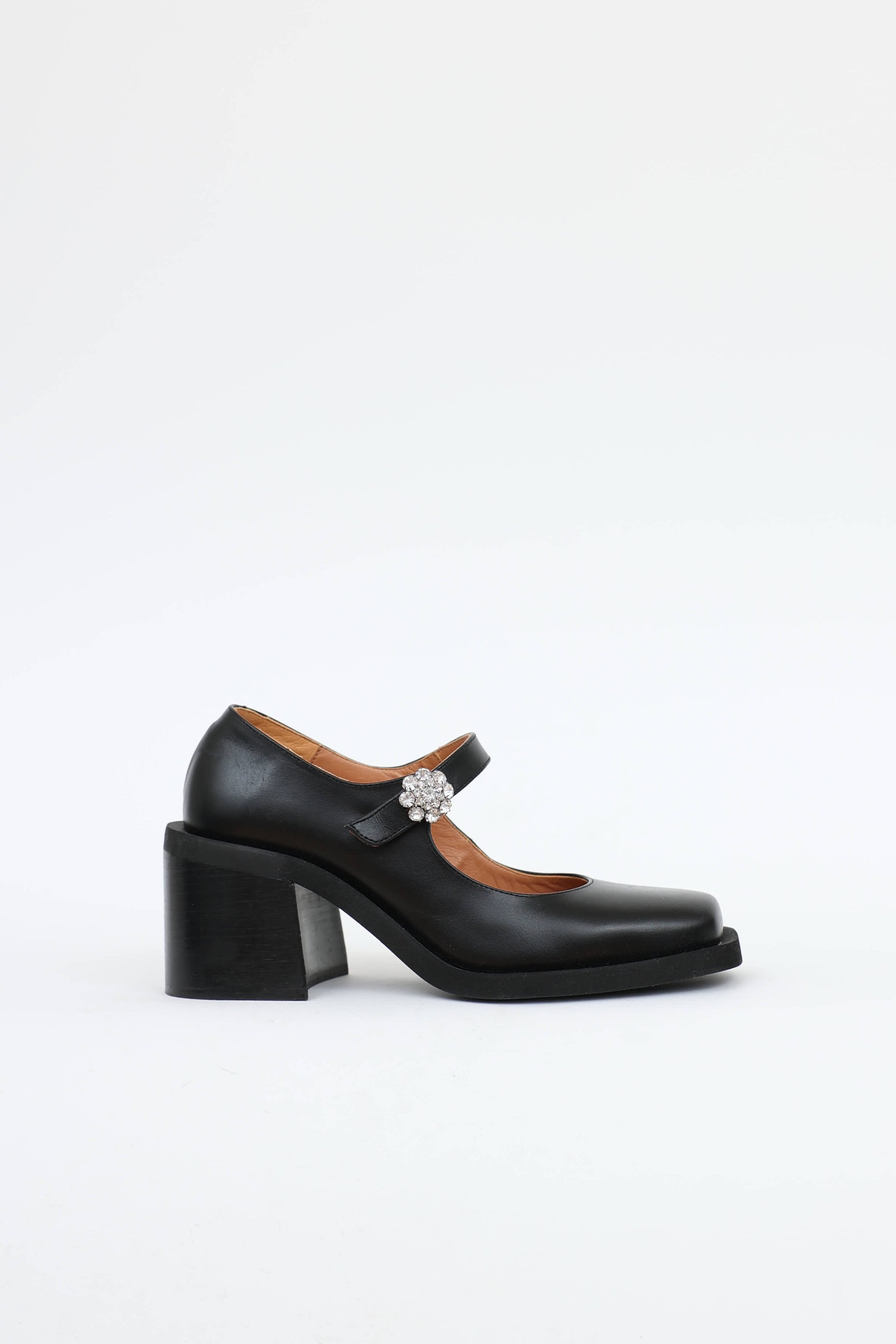 Pre-owned Ganni black Mary Jane heels featuring a square toe, leather upper, elasticized Mary Jane strap with jewel embellished button, extended outsole, embossed logo text at counter, and stacked block heel.
