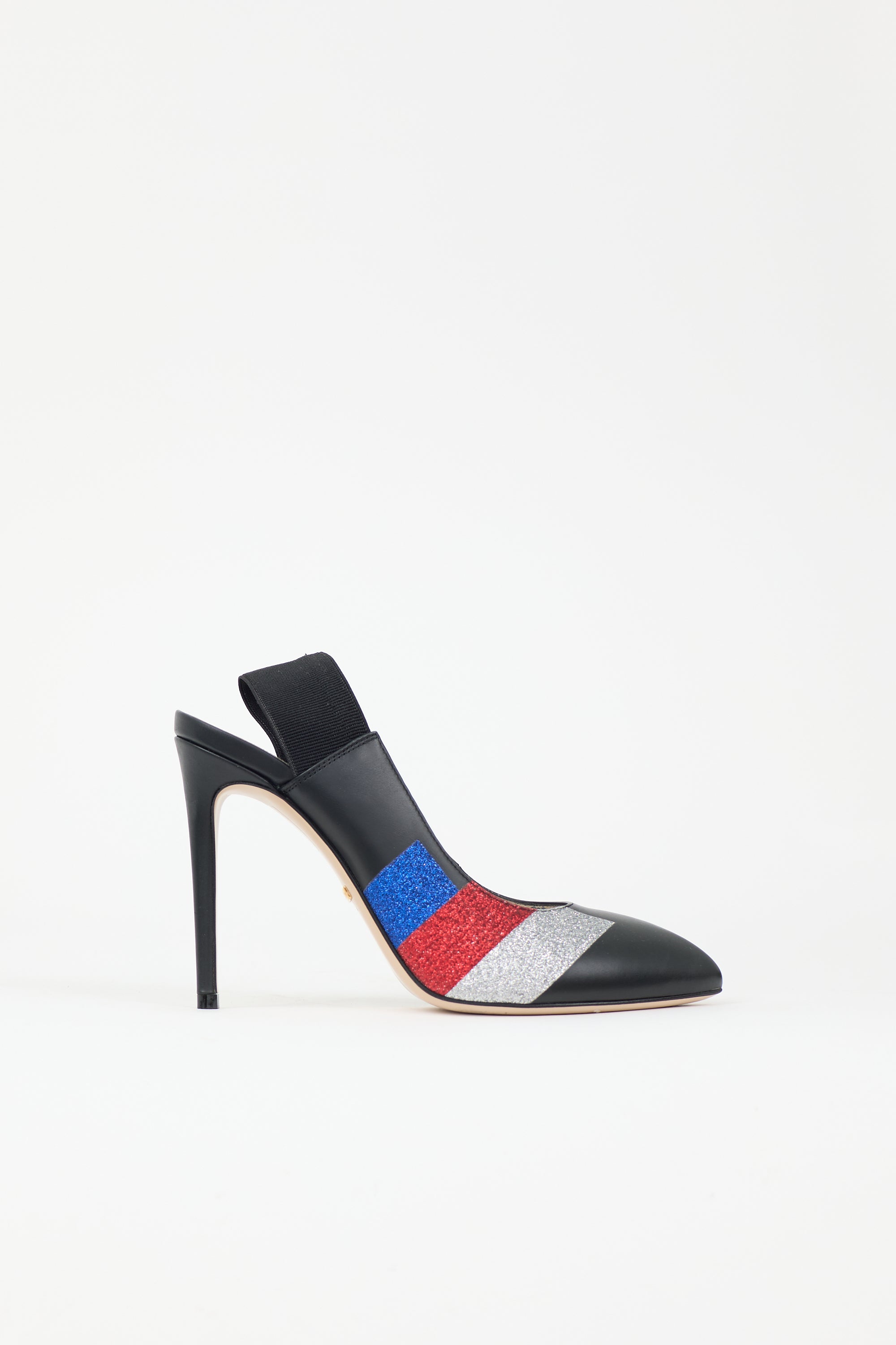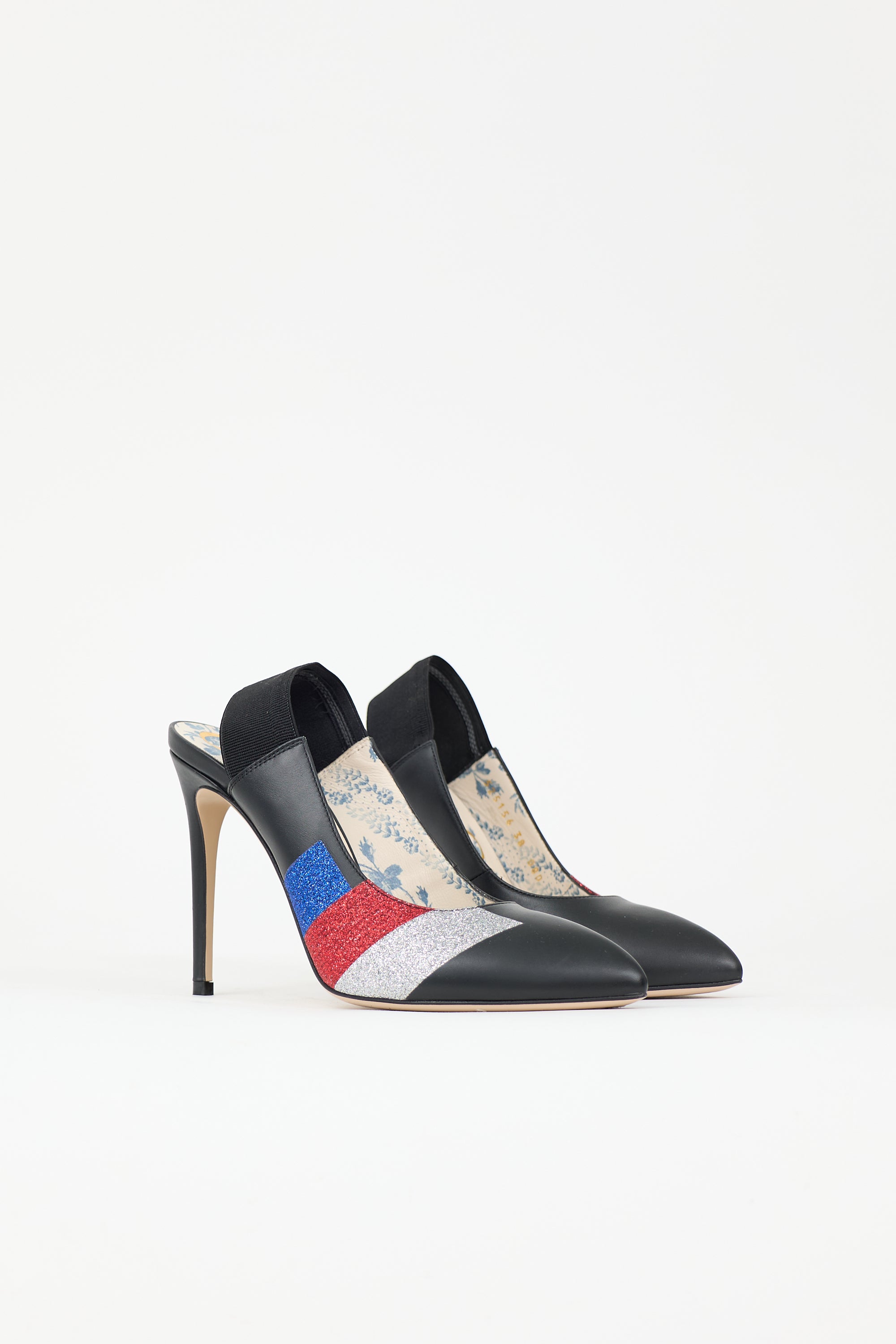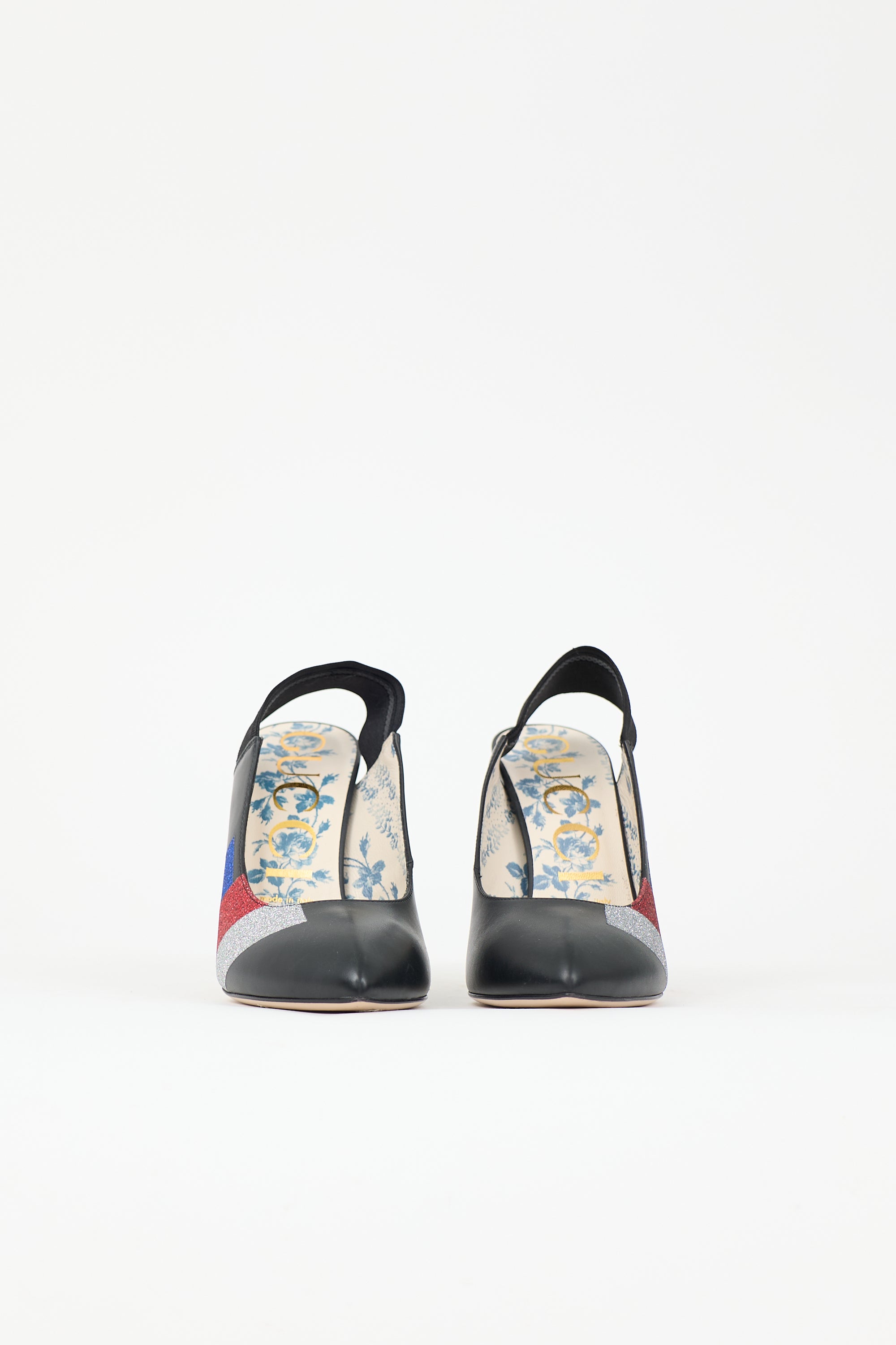 Pre-owned Gucci black leather heels featuring pointed toe, floral printed insole, elasticized slingback strap, red, blue, and silver glitter accent, and stiletto heel. Includes original dust bag.