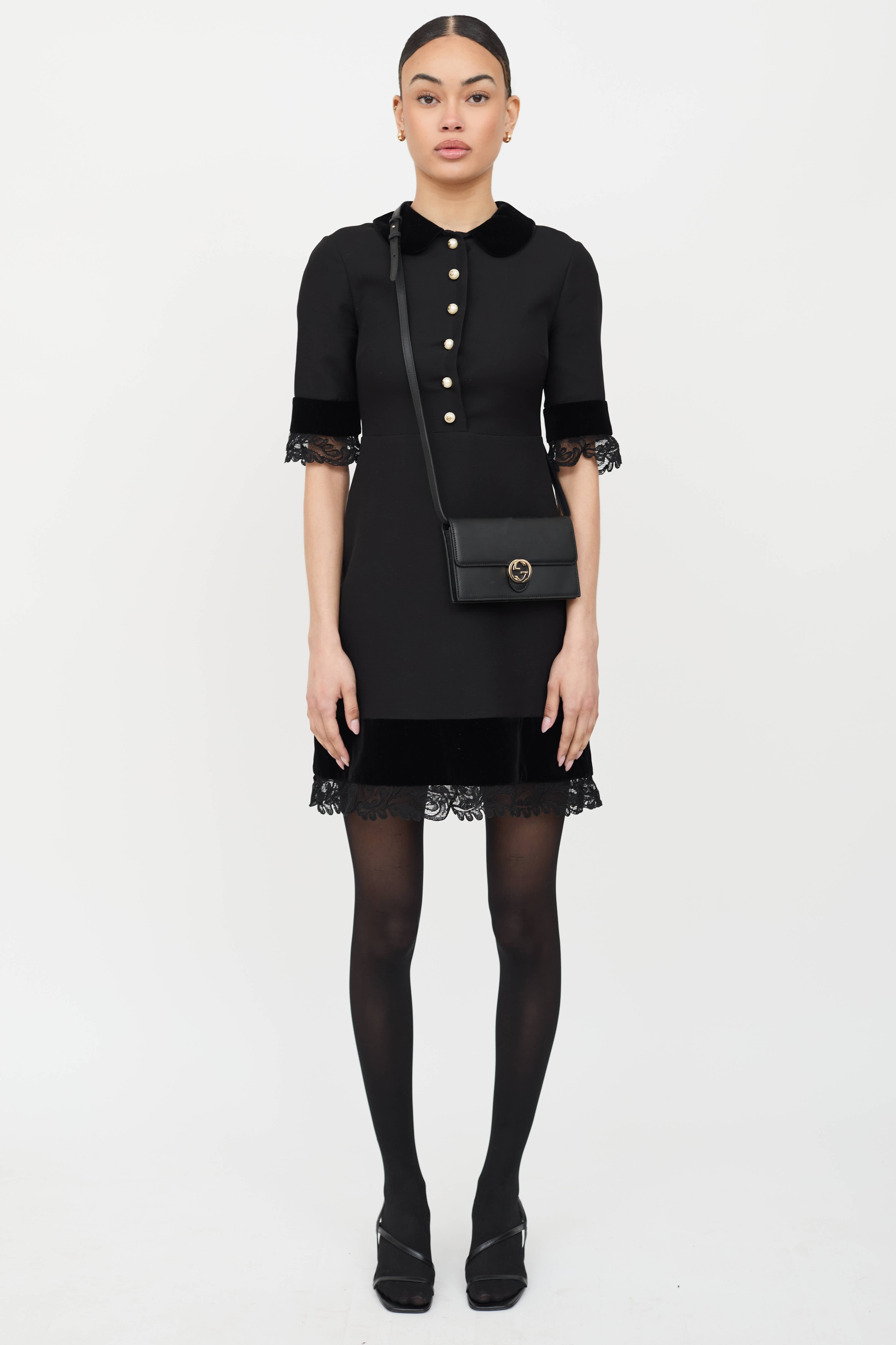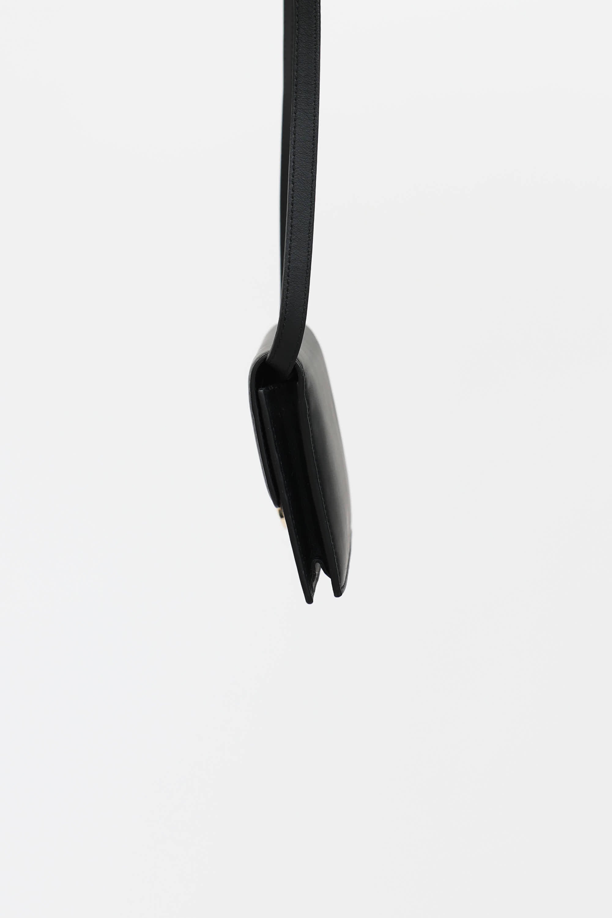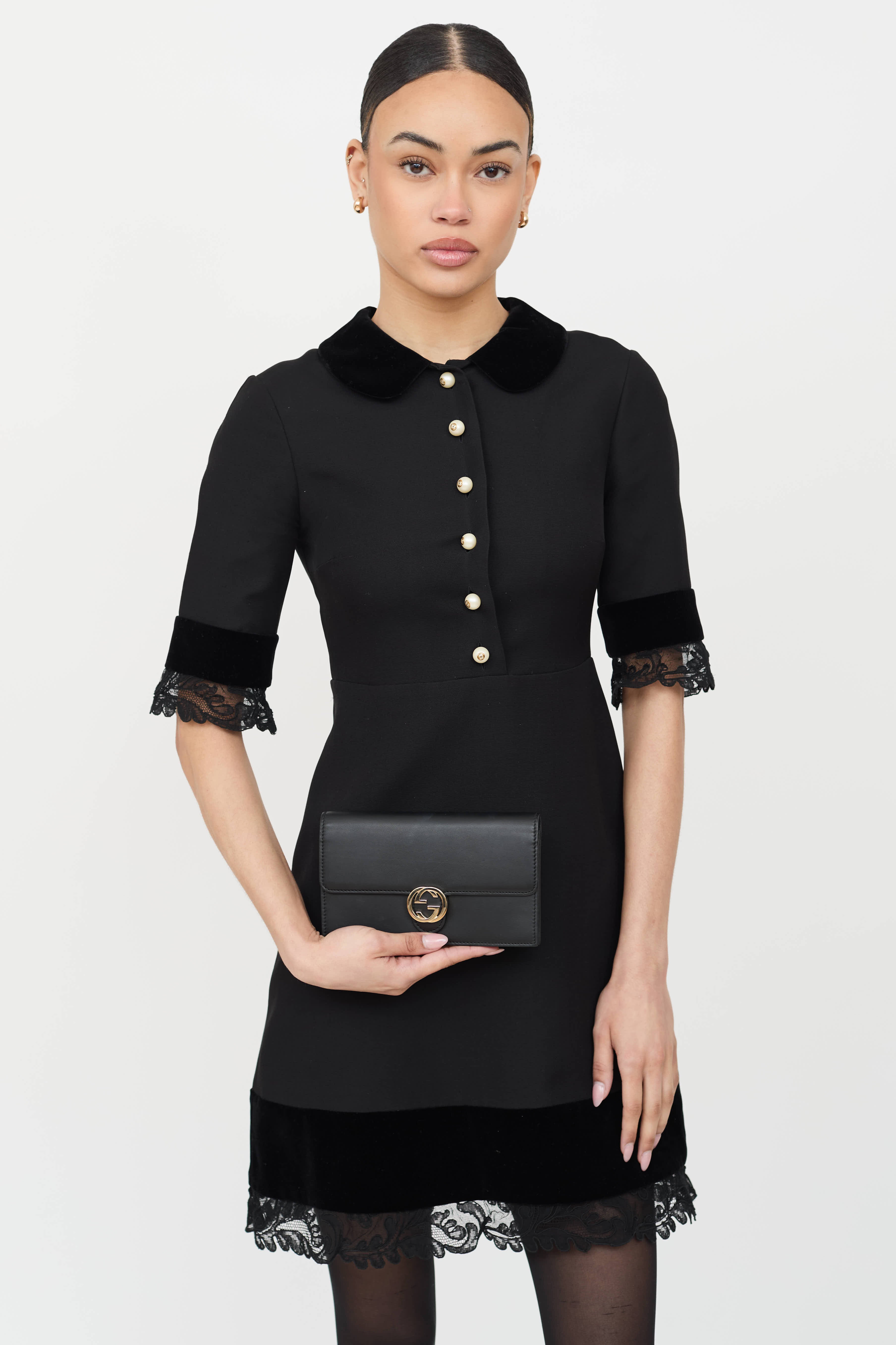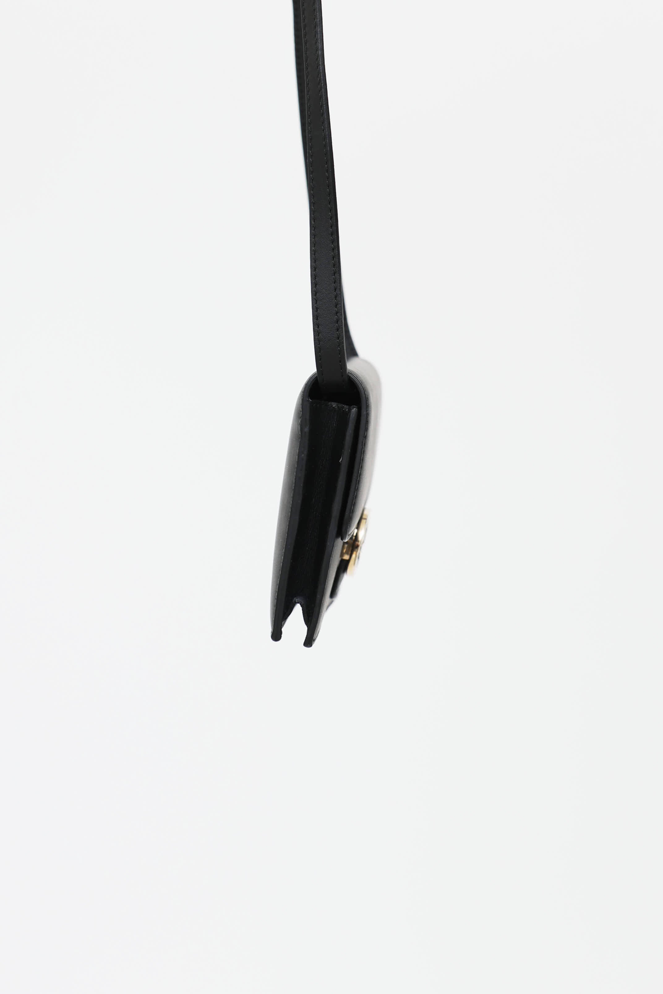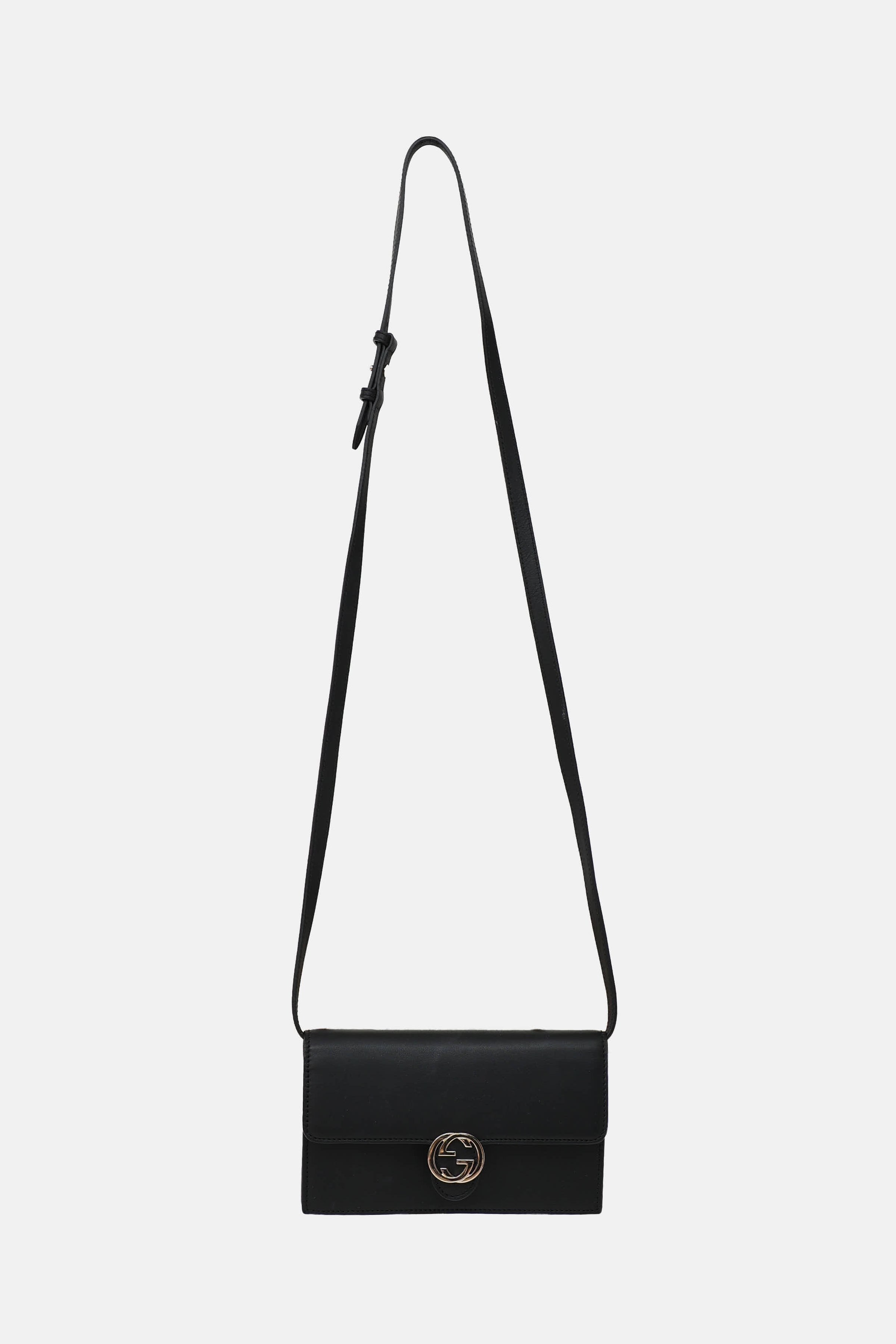 Pre-owned Gucci black leather wallet on strap featuring adjustable crossbody strap, gold tone hardware, top flap with interlocking GG, snap closure, one main compartment, one zip pocket, and 18 card slots.