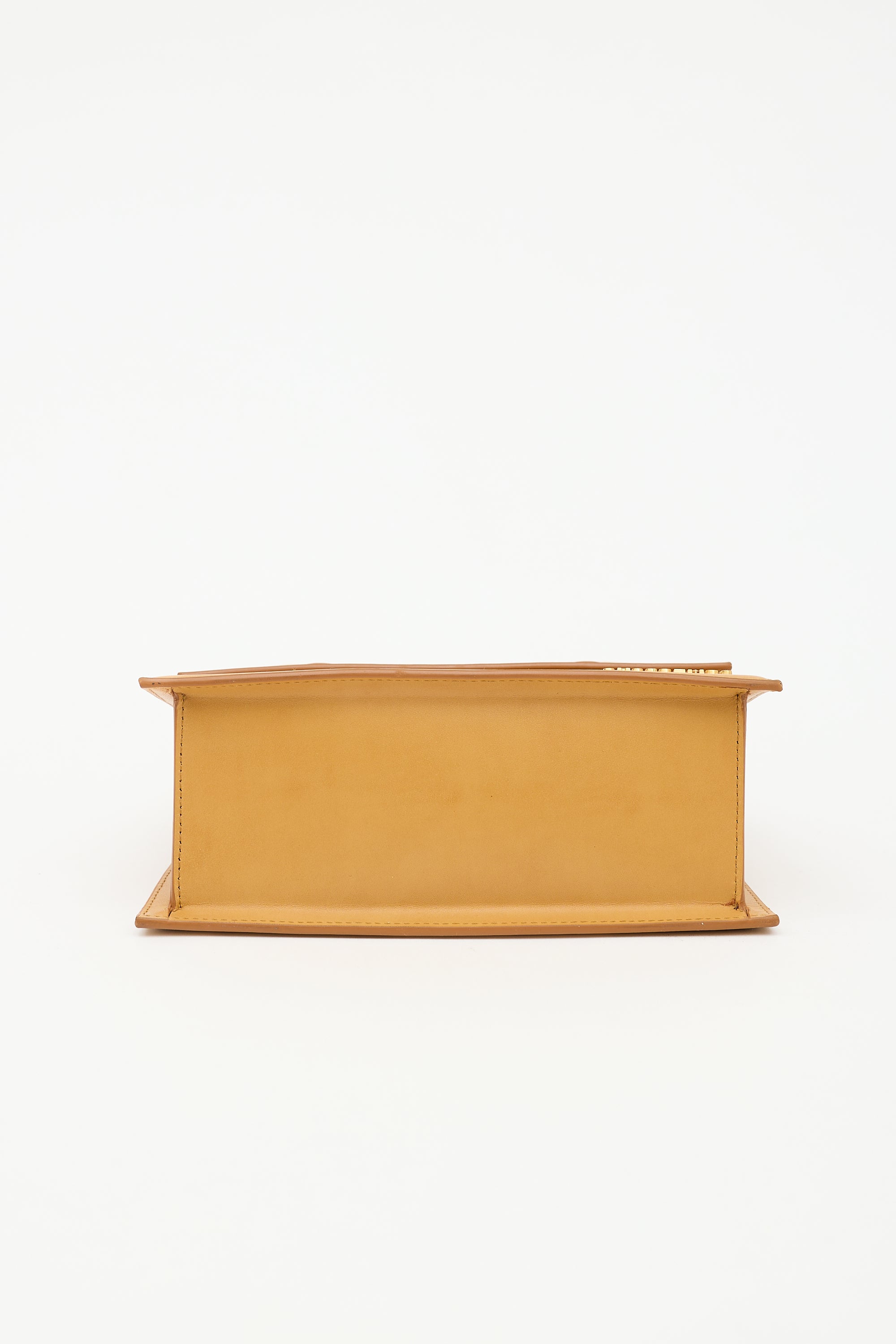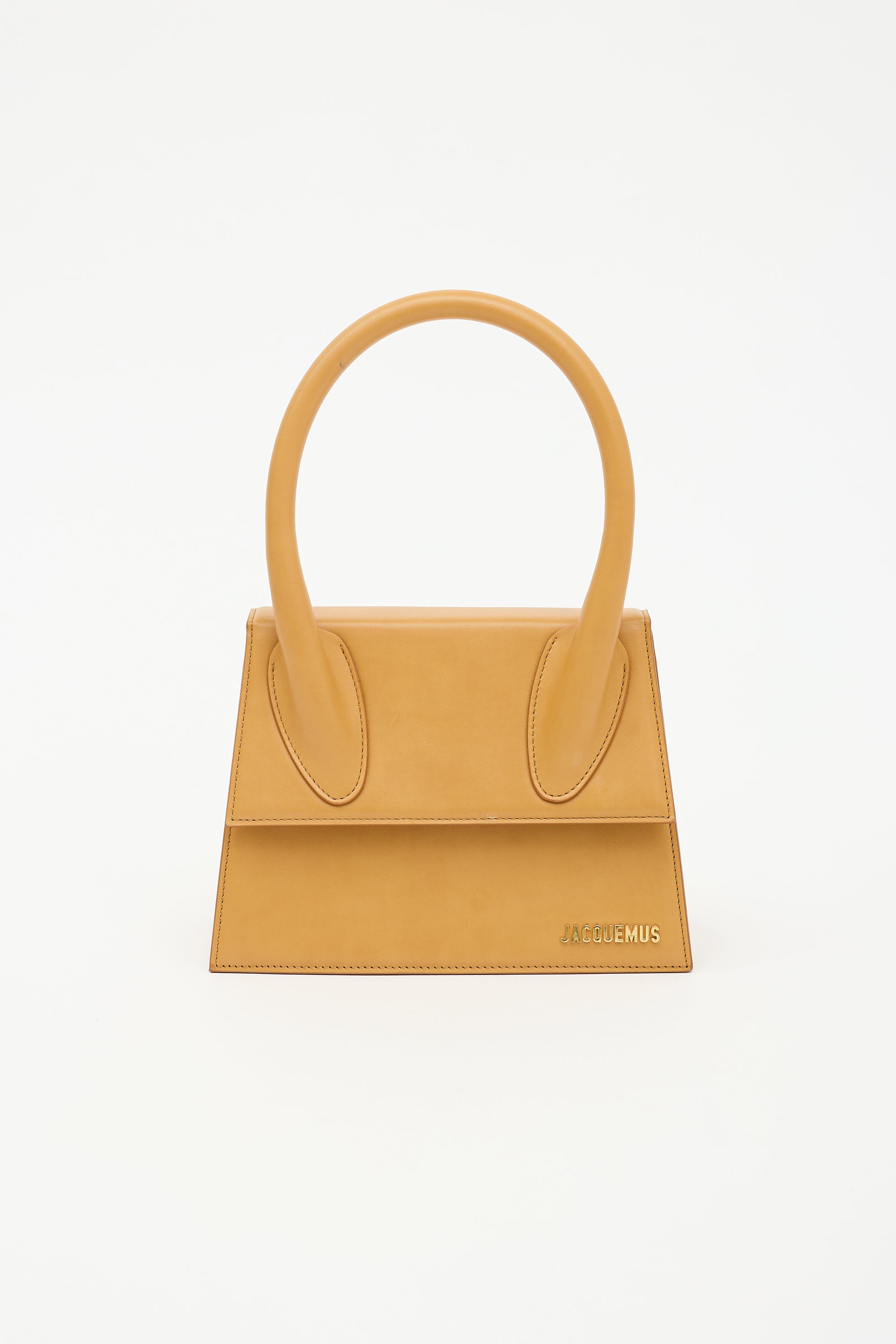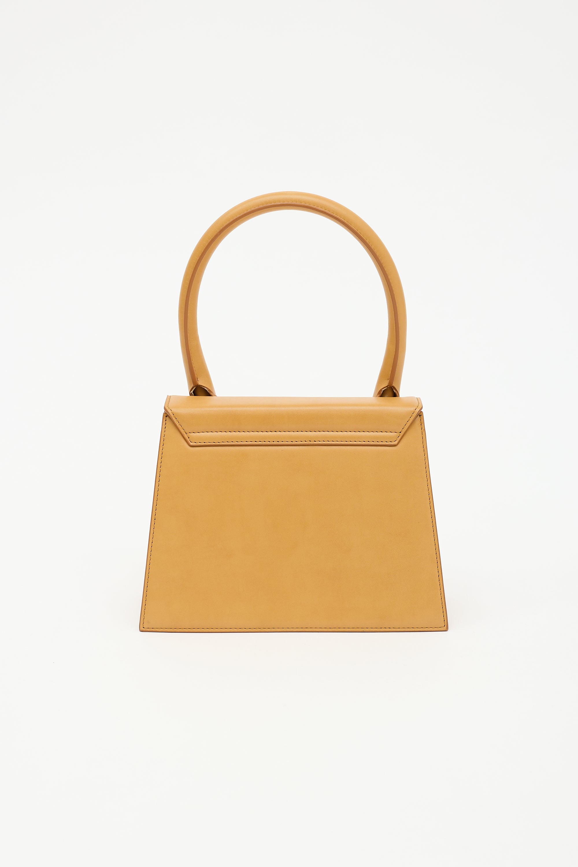 Pre-owned Jacquemus beige leather medium Le Chiquito bag featuring gold tone hardware, structured top handle, logo at front, detachable and adjustable shoulder strap, magnetic button closure, and one main compartment with one slip pocket. Includes original dust bag.