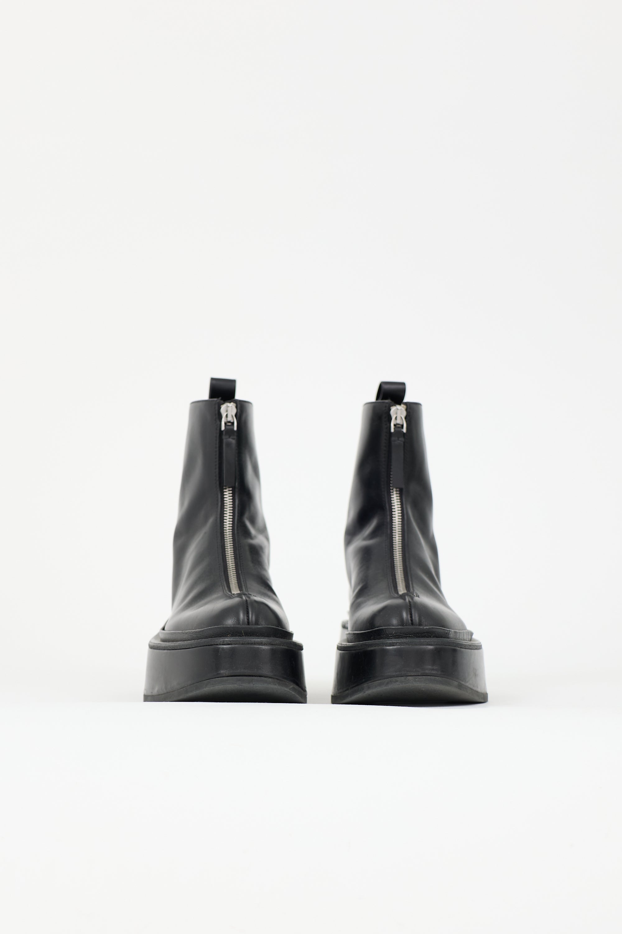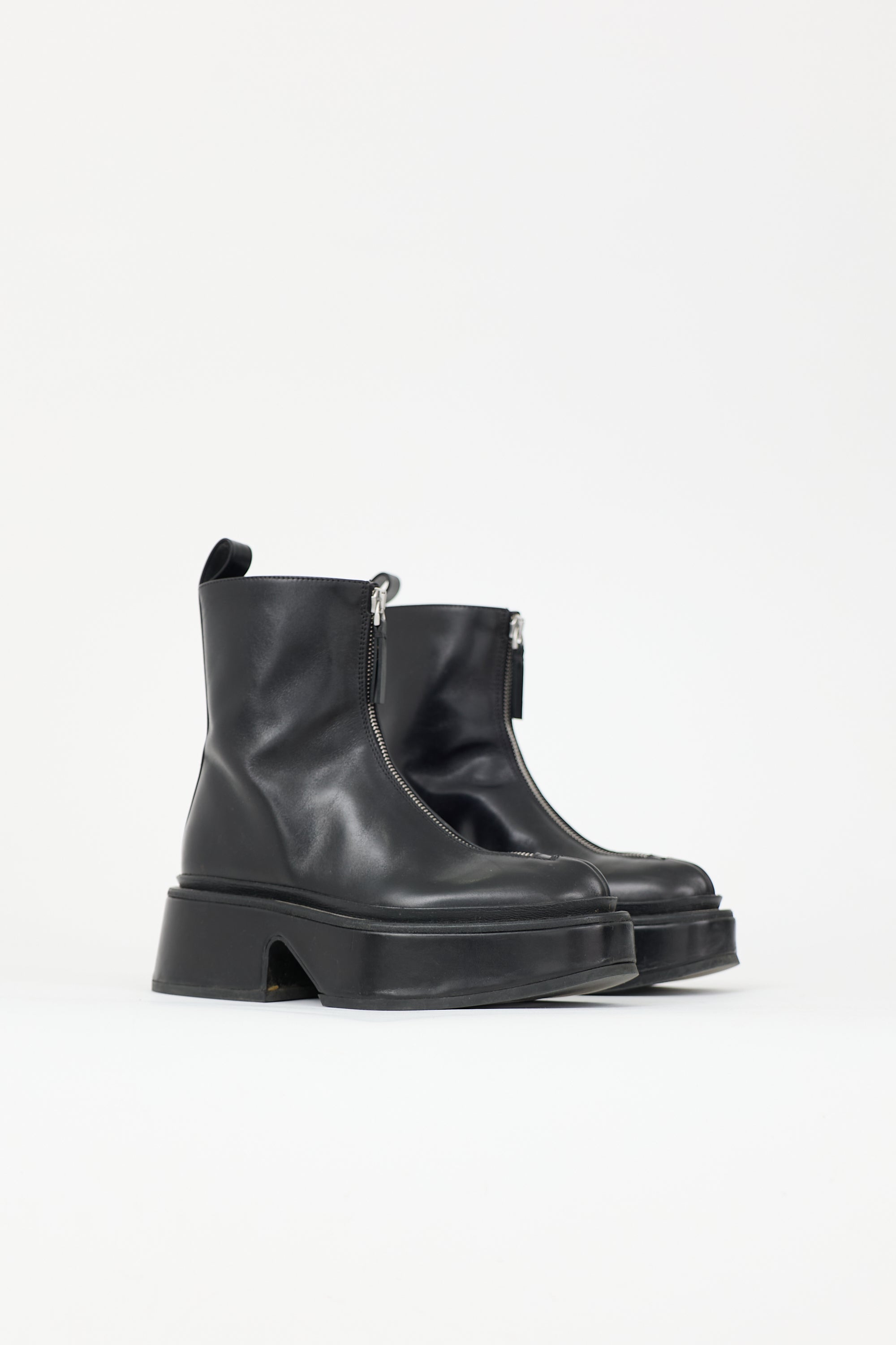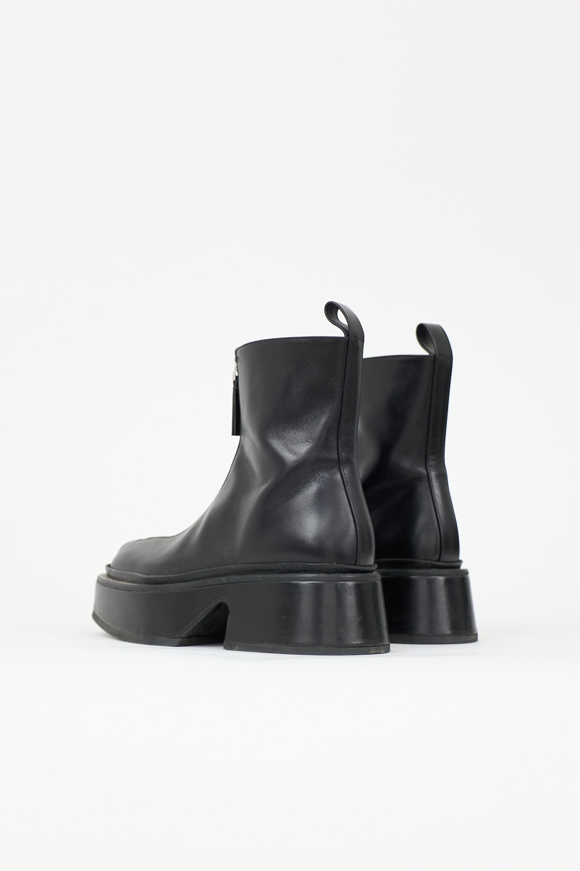 Pre-owned Jil Sander black leather boots featuring rounded toe, zip closure at front, and platform sole. Includes original dust bag.