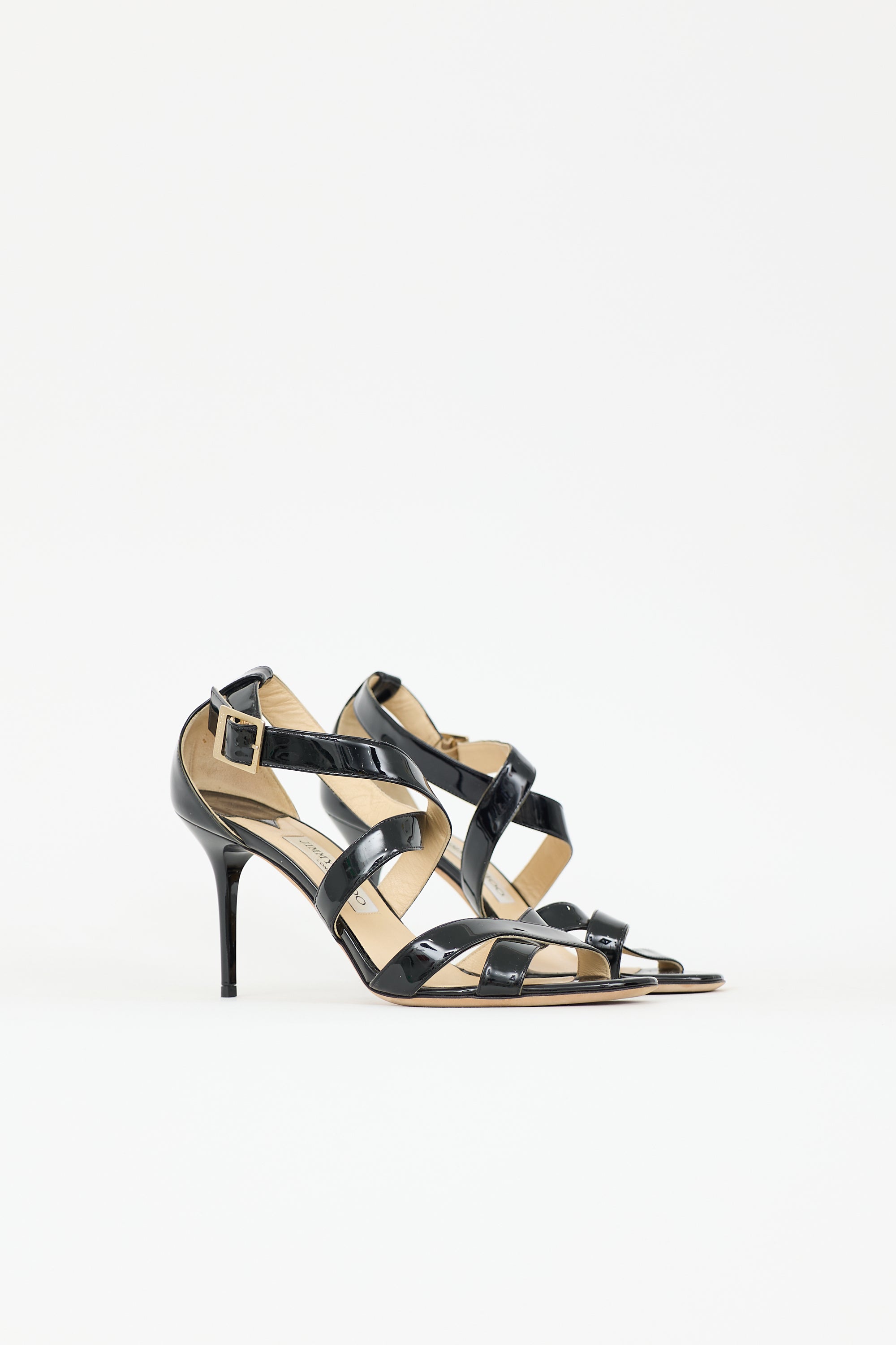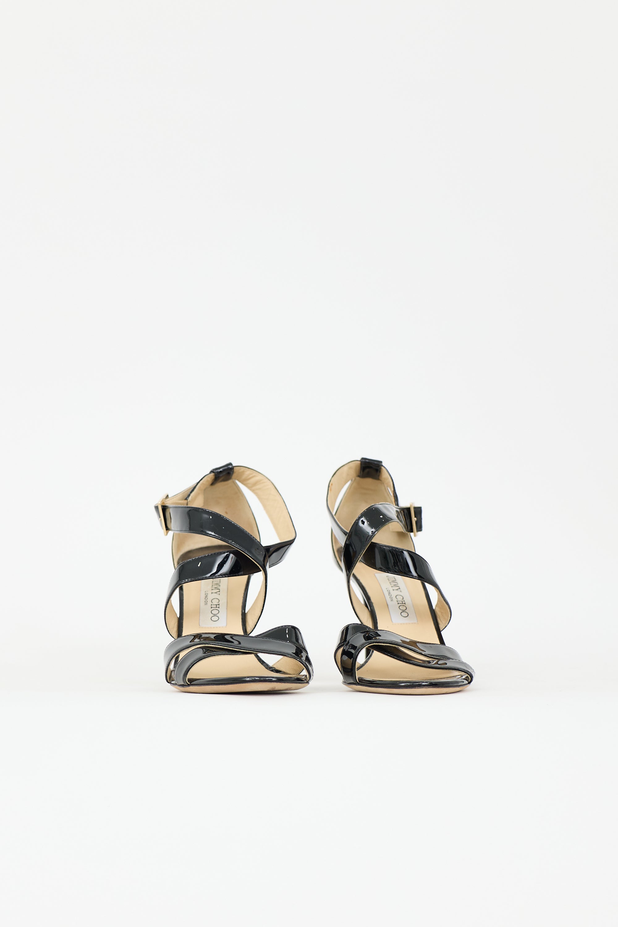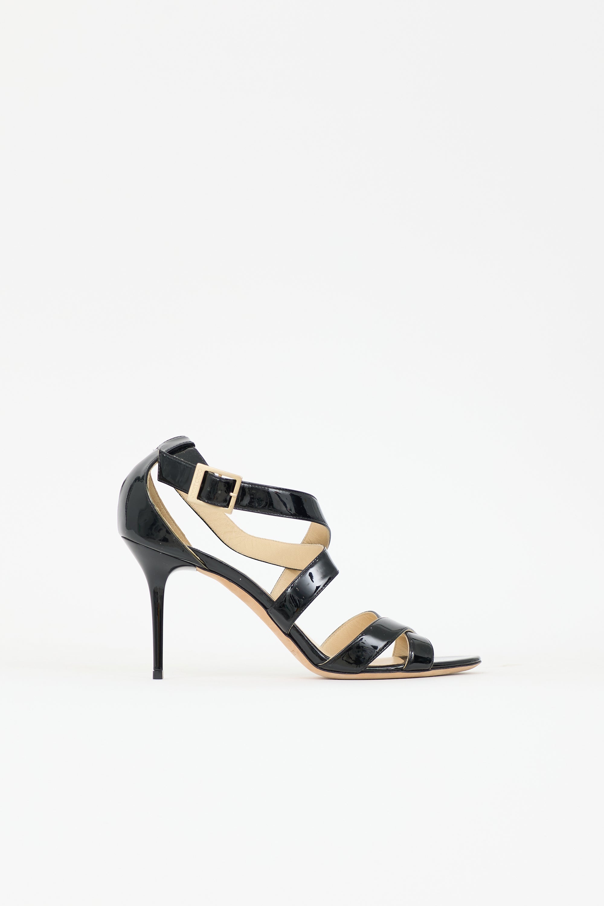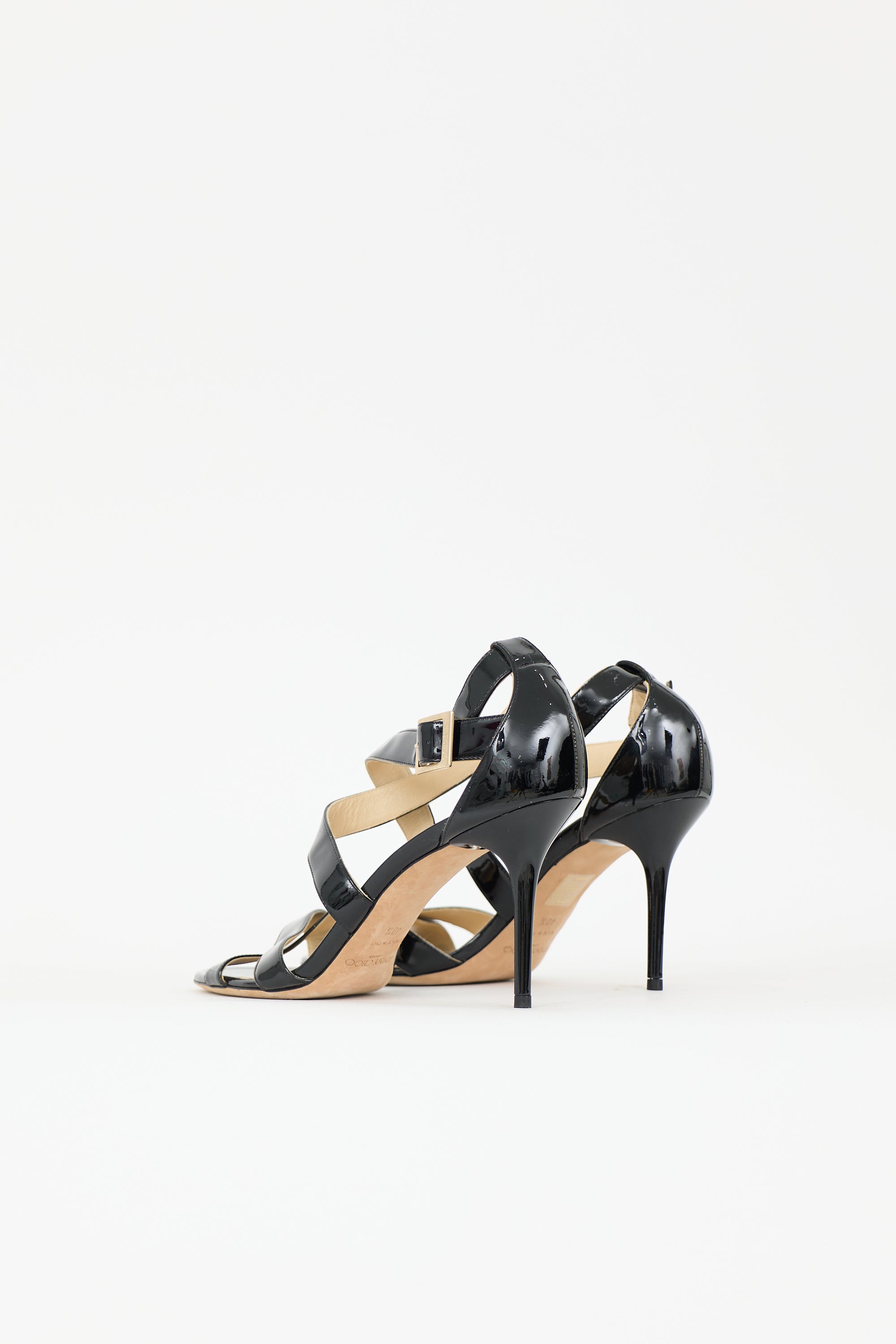 Pre-owned Jimmy Choo black Lottie heels featuring open rounded toe, strappy upper, adjustable ankle strap, and stiletto heel.