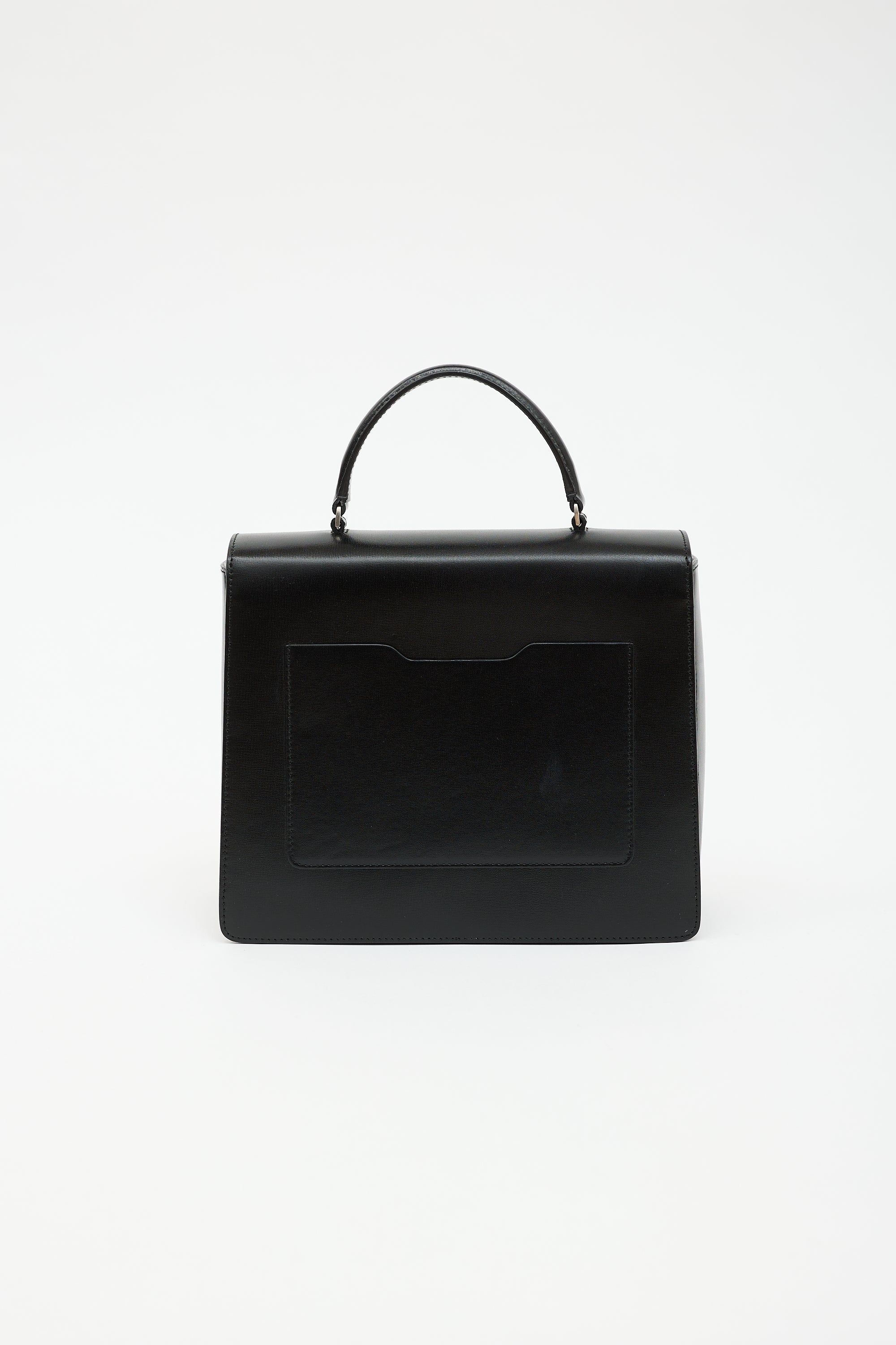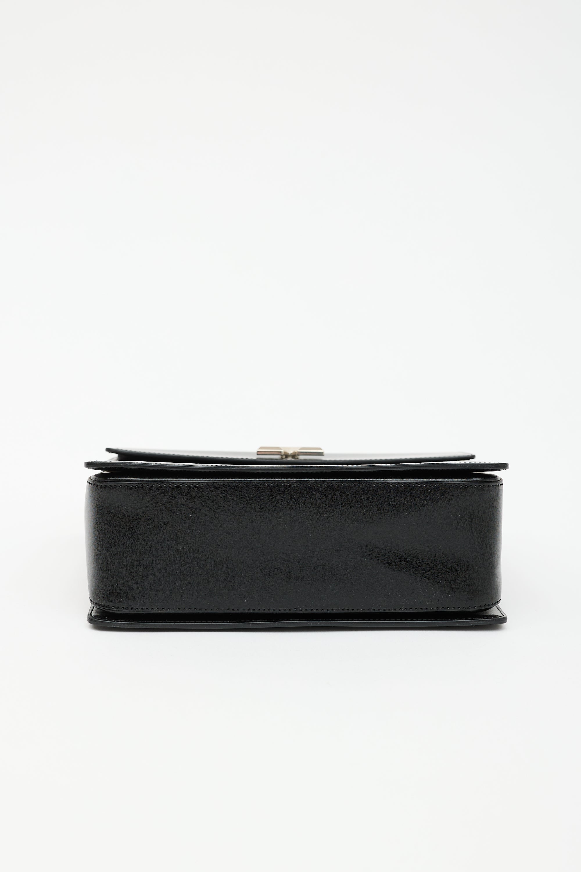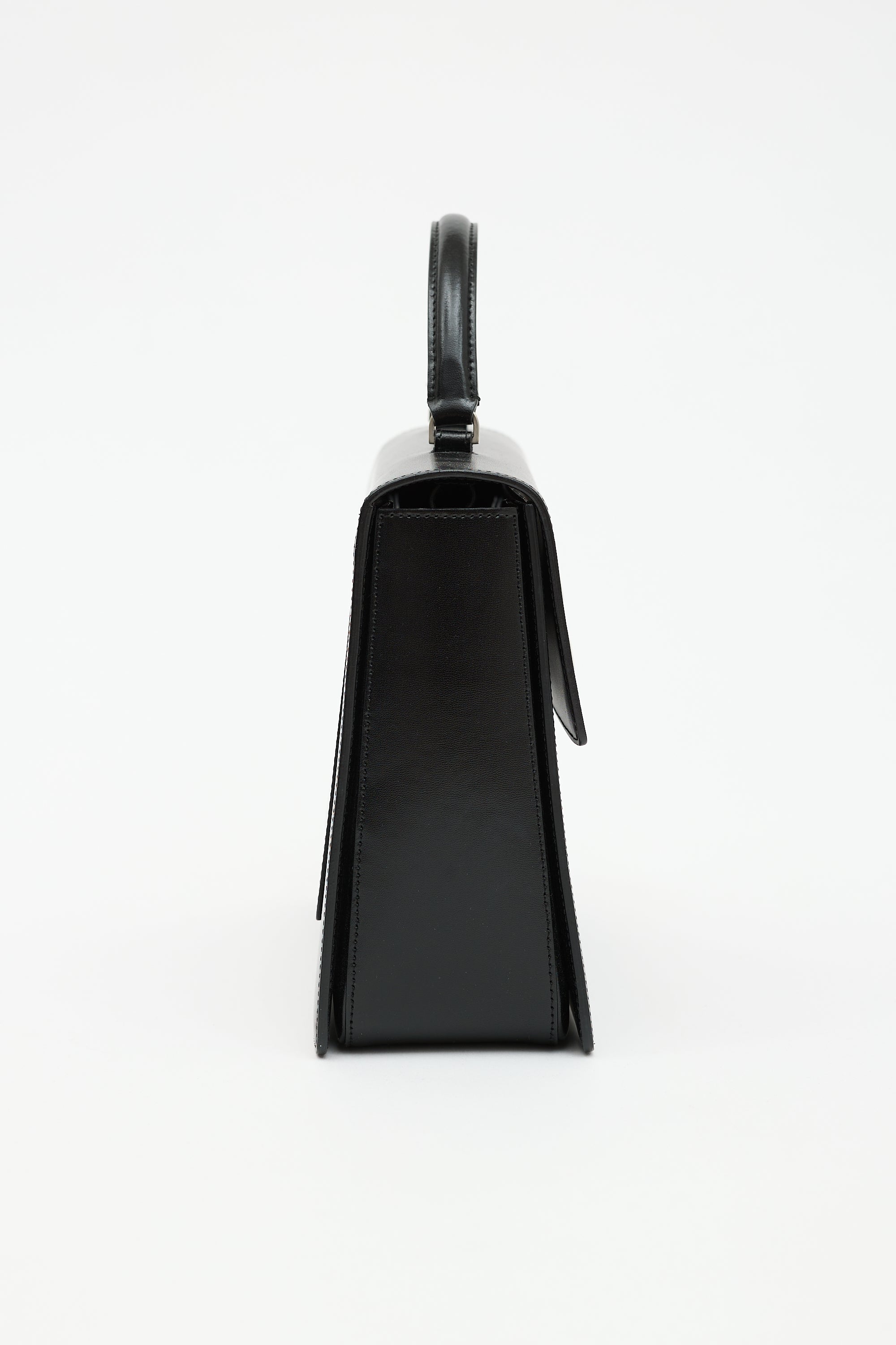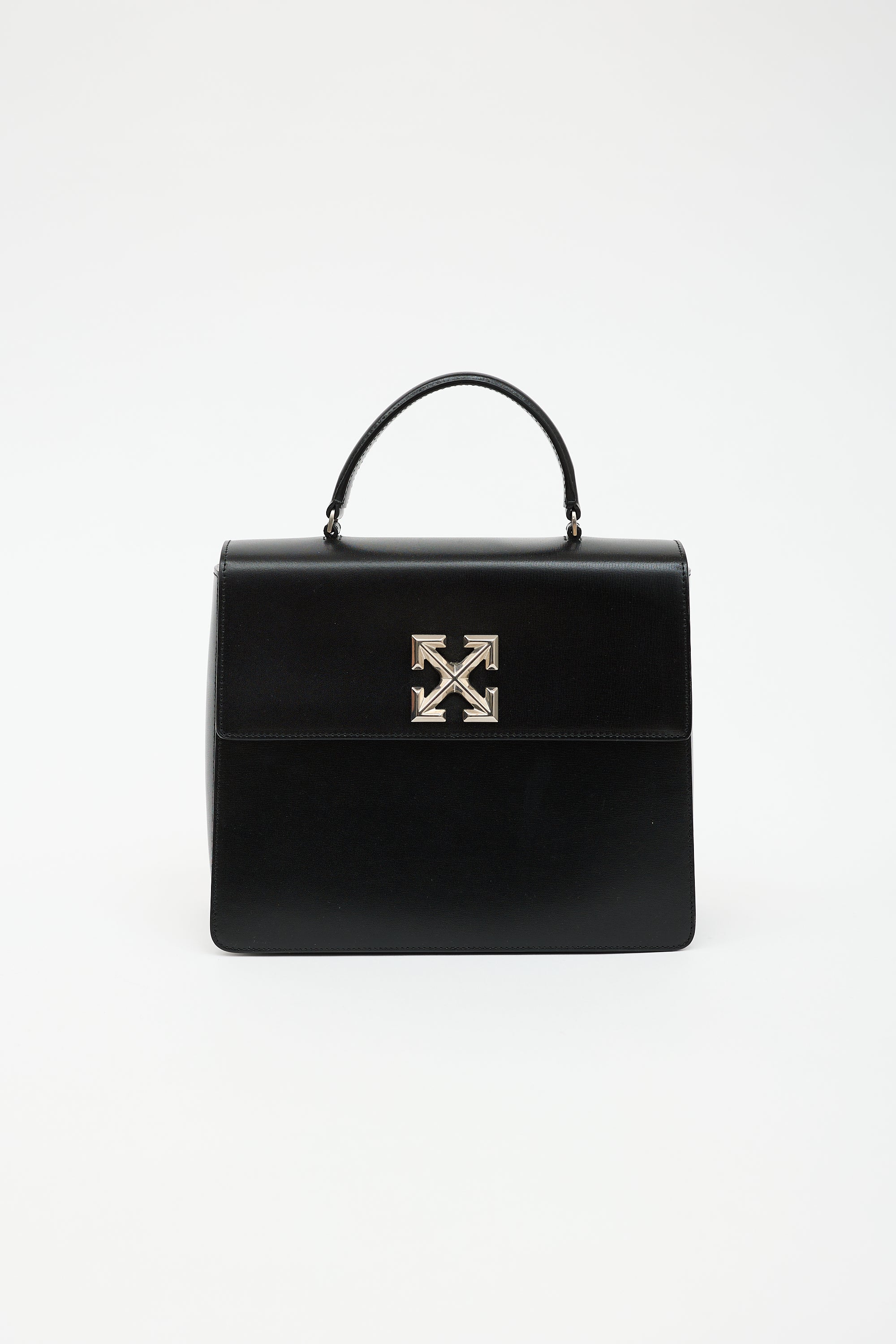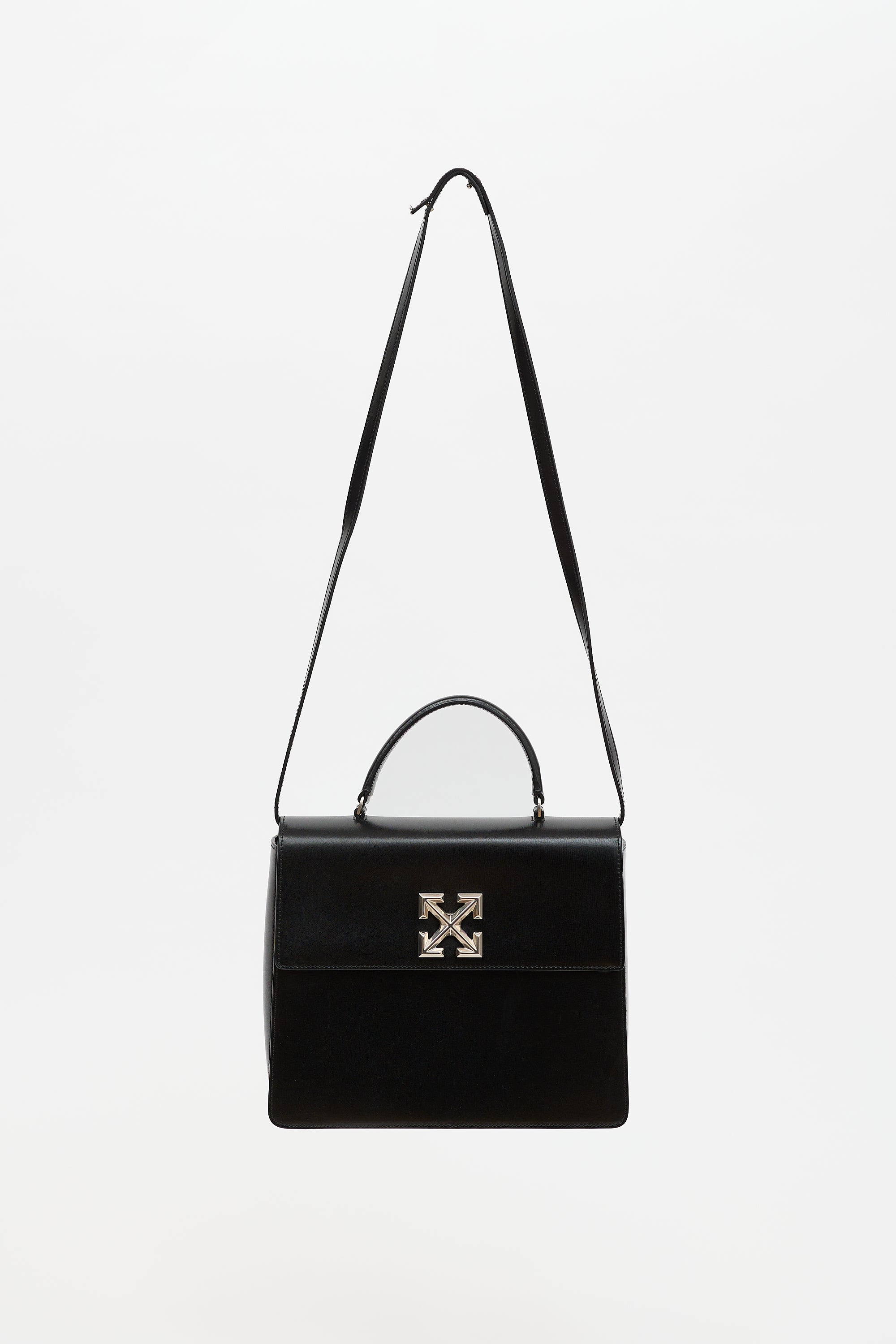 Pre-owned Off-White black leather Jitney 2.8 bag featuring single top handle, signature arrow logo at front, detachable fixed crossbody strap, burgundy leather lining, three main compartment, and four slip pockets inside. Include original dust bag.