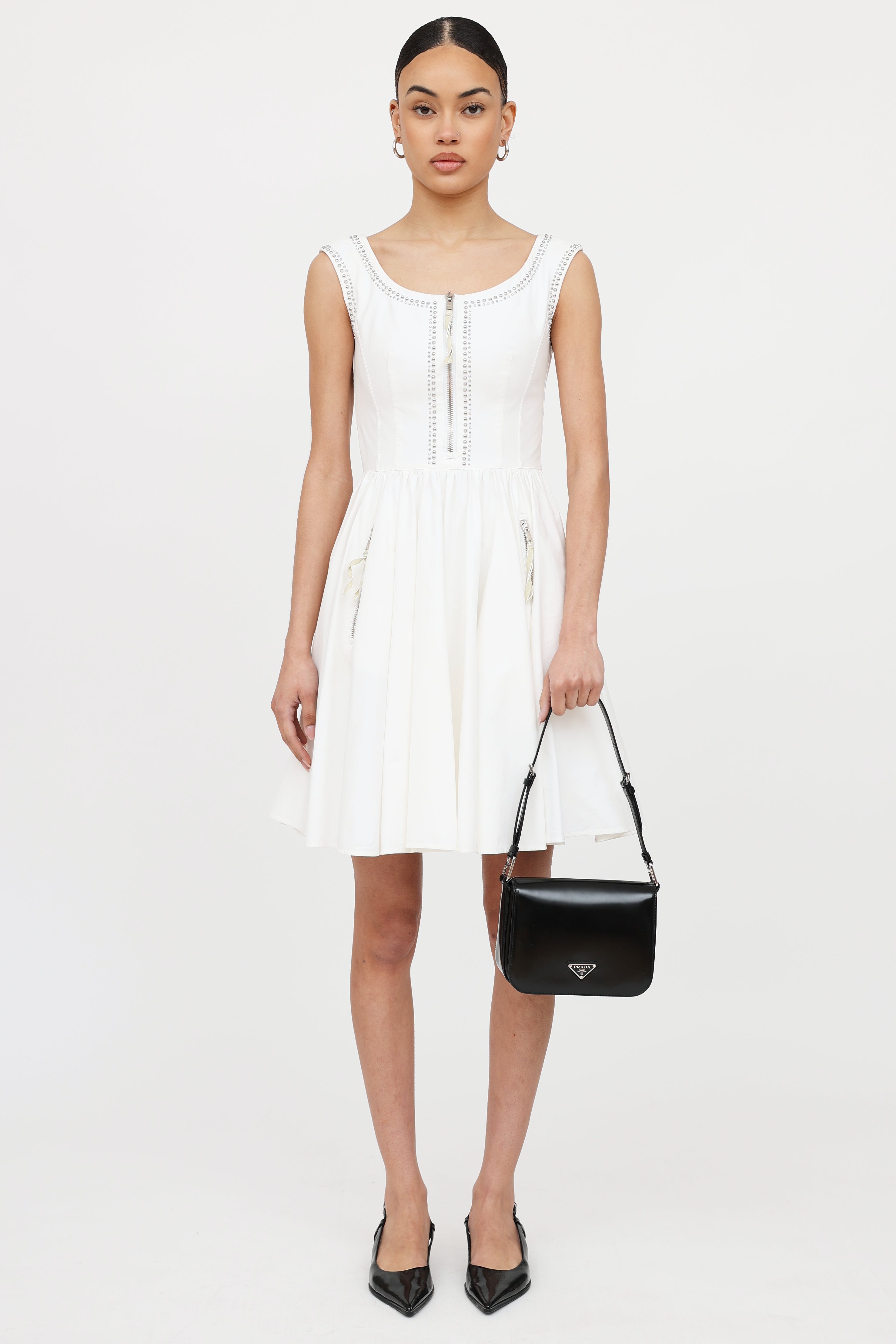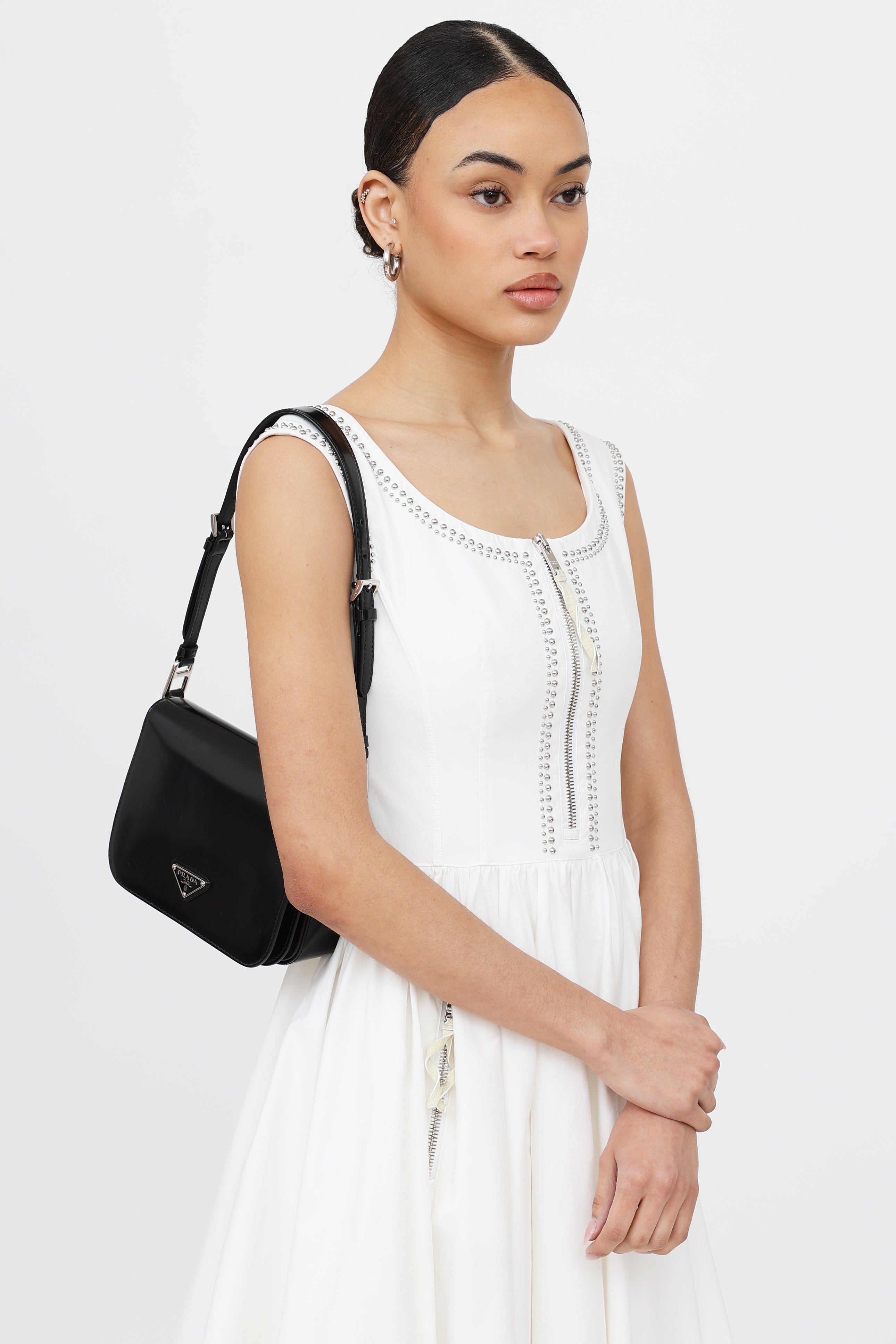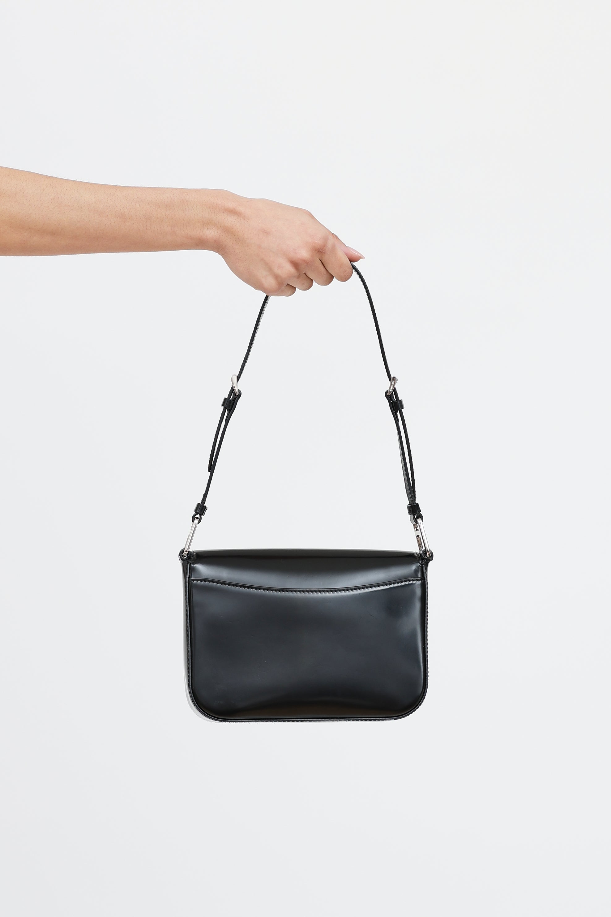Pre-owned Prada black Spazzolato flap bag featuring adjustable flat shoulder strap, silver tone hardware, detachable strap extender, slip pocket at back face, top flap with signature logo at front, magnetic snap closure, one main compartment, slip pocket at front face, and one interior pocket.