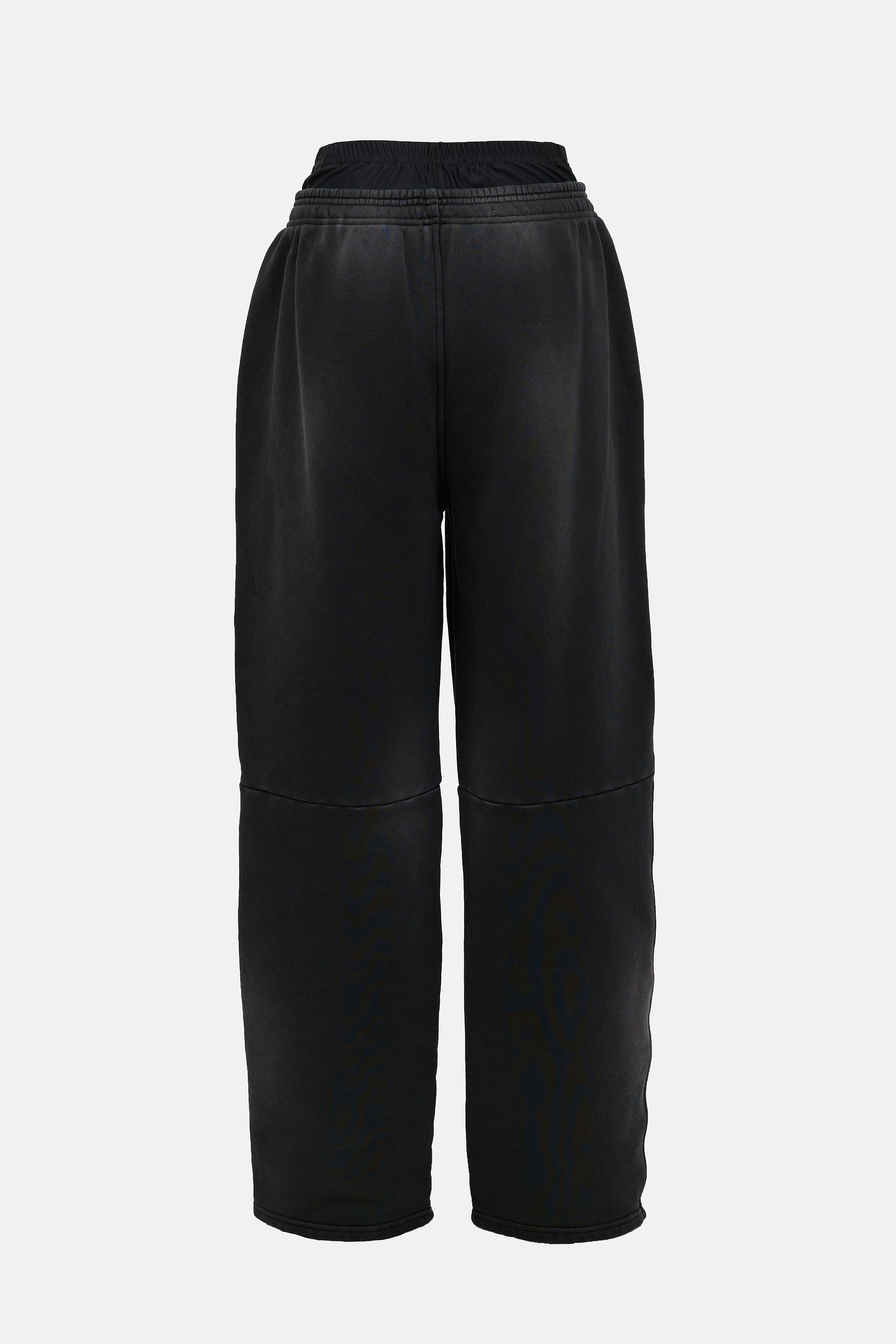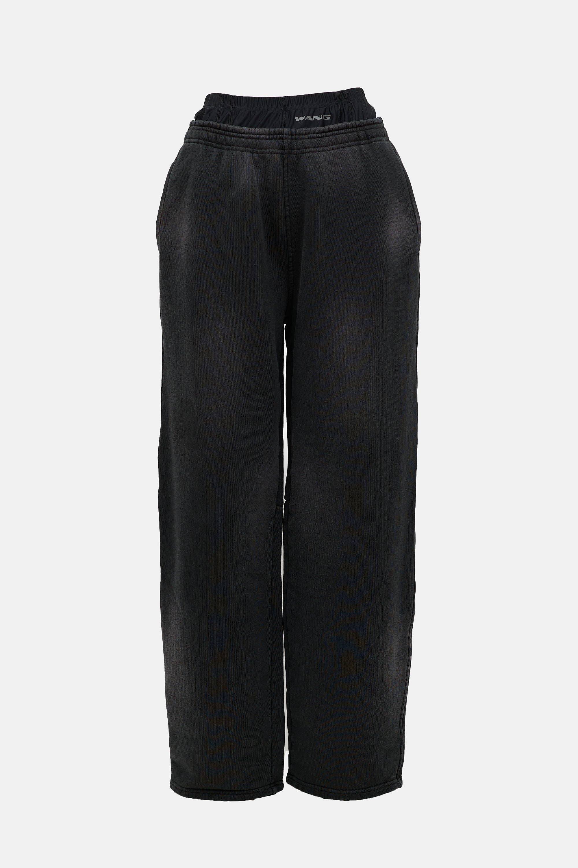 Pre-owned Alexander Wang black sweatpants featuring a high rise, layered waist, grey textured logo at front waistband, two pocket styling, and wide leg.