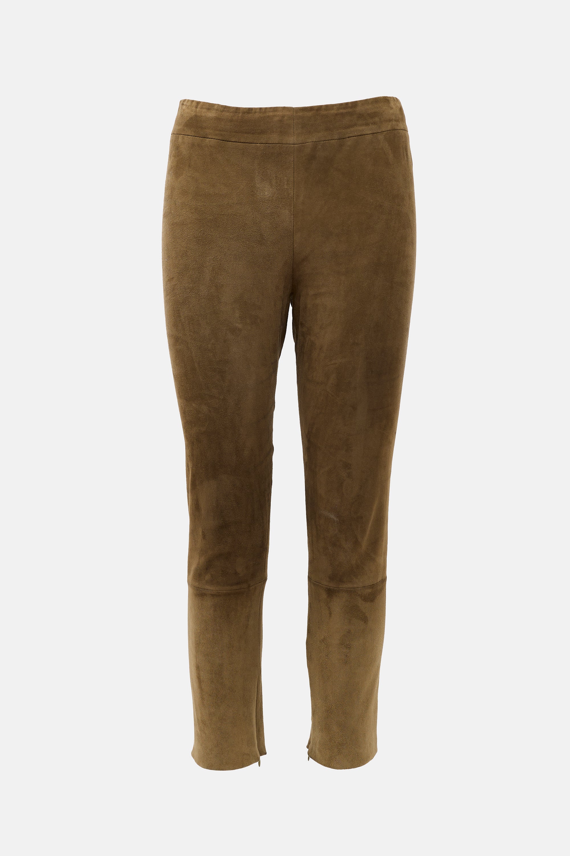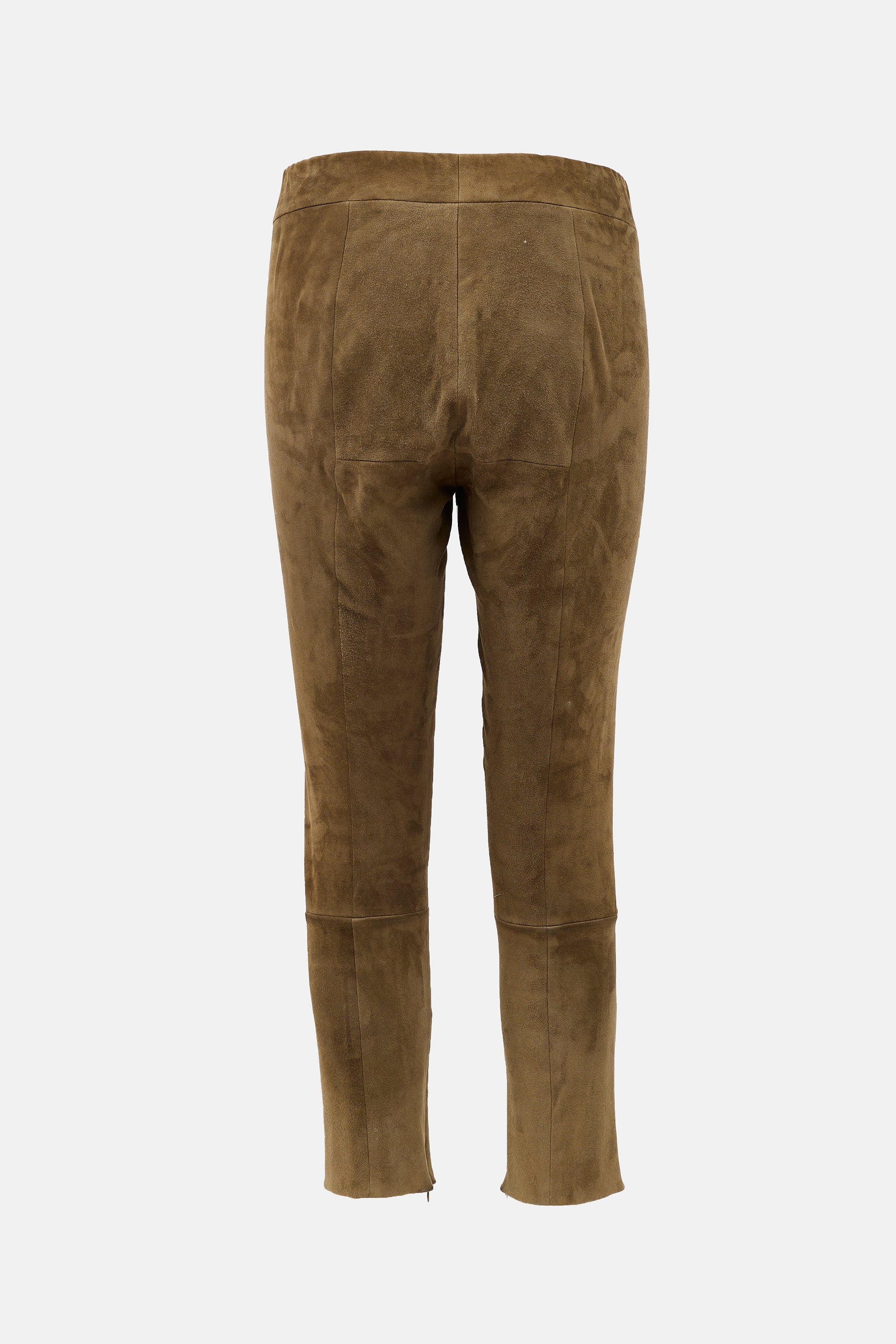 Pre-owned The Row brown suede Mino pants featuring an elasticized waist, paneled design, slim leg, and zipped cuffs.