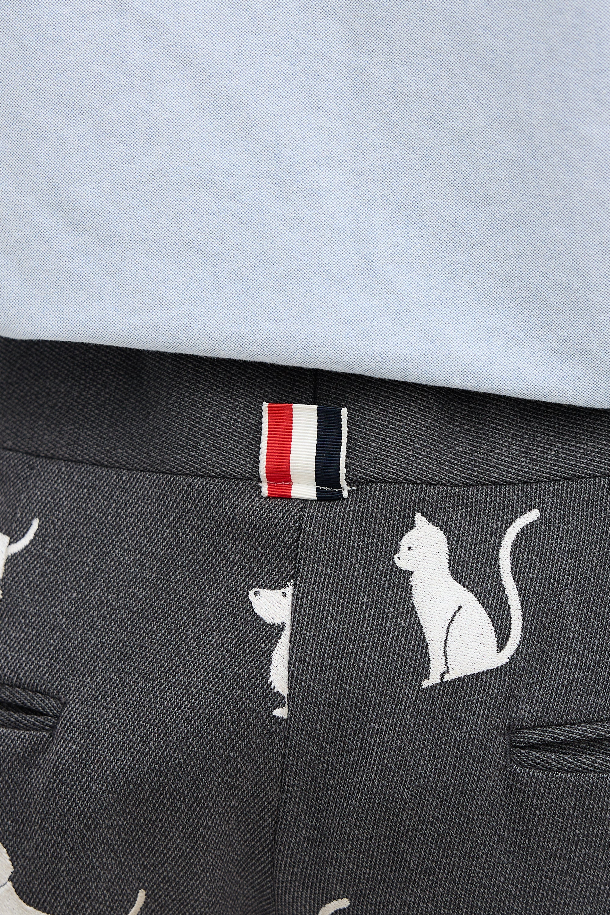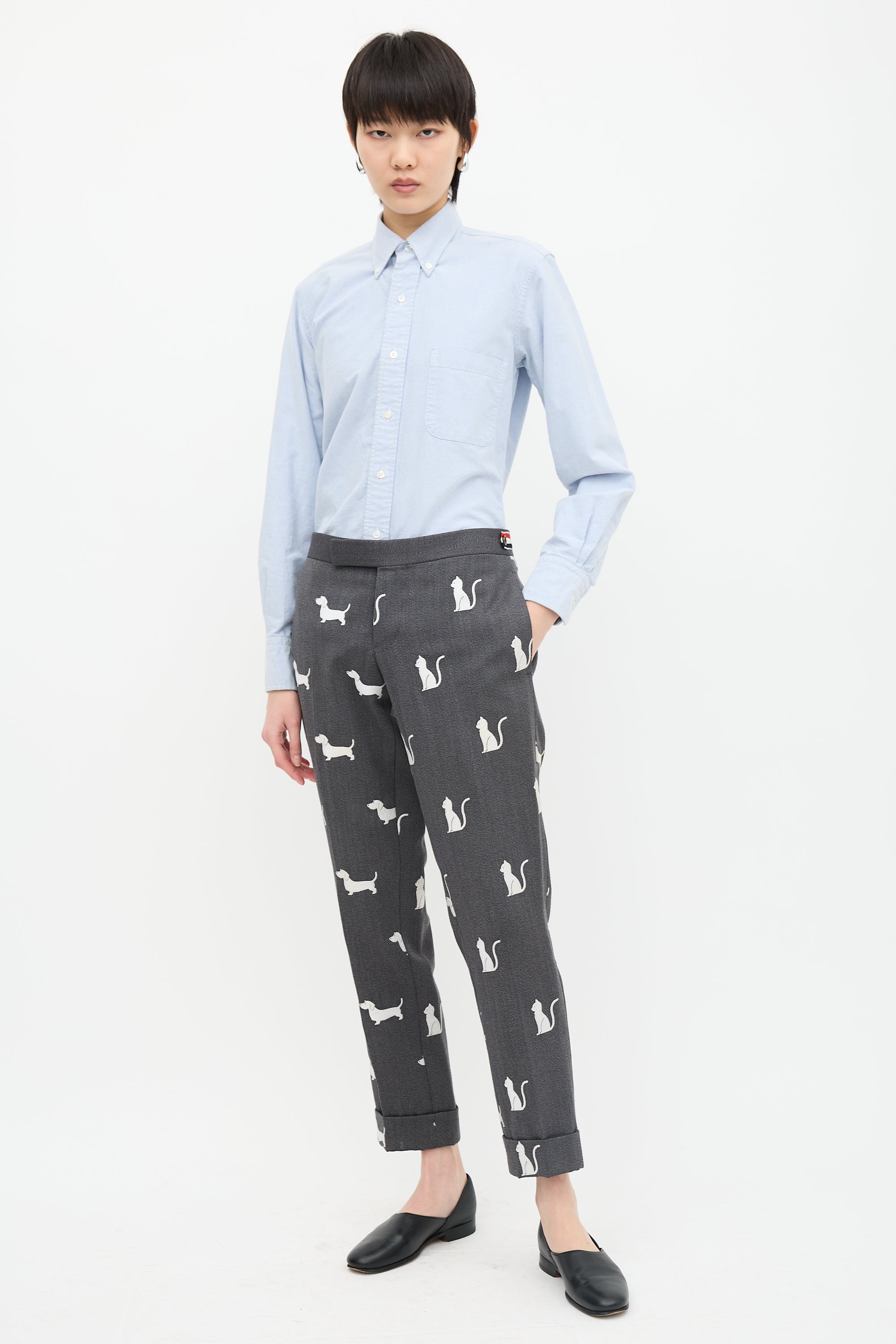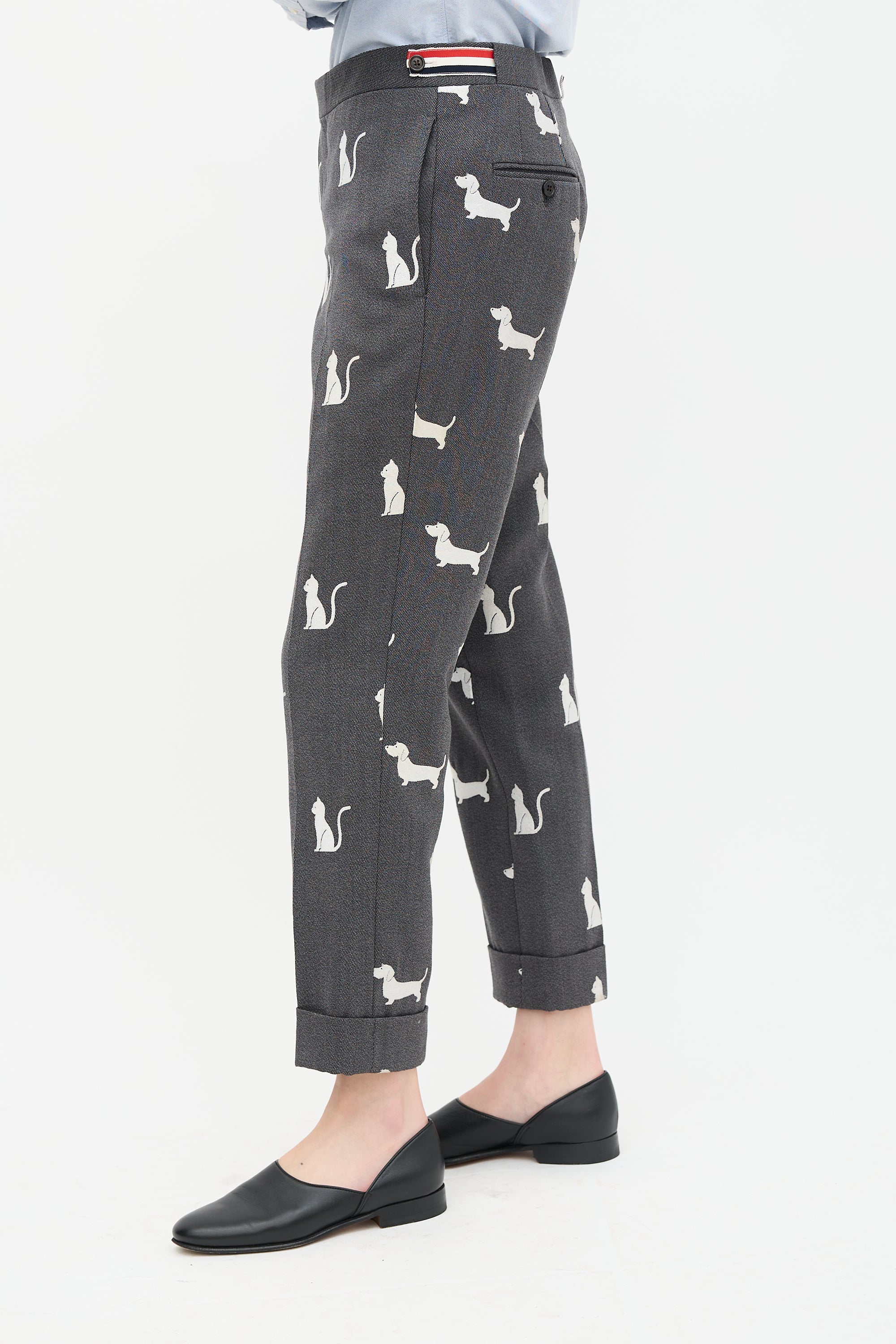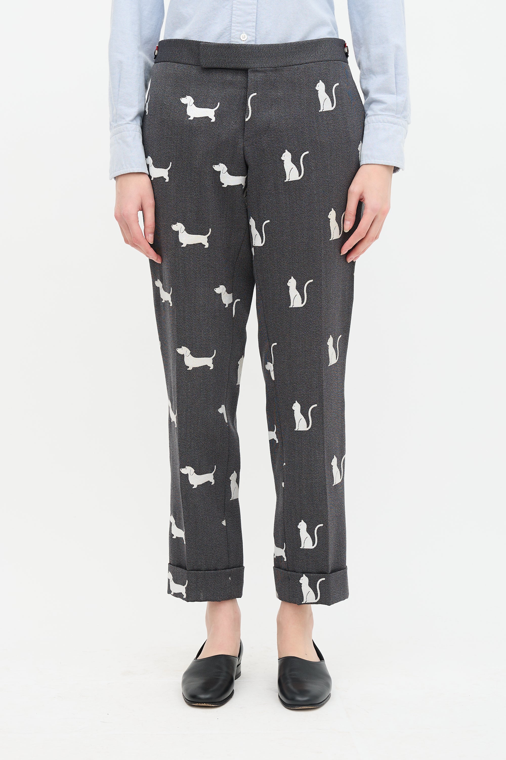 Pre-owned Thom Browne grey wool trousers featuring cat and dog embroidery throughout, button fly, four pocket styling, adjustable button waist with RWB grosgrain strap, straight leg with pressed seams,rolled cuffs, and signature RWD grosgrain tag at back waist.