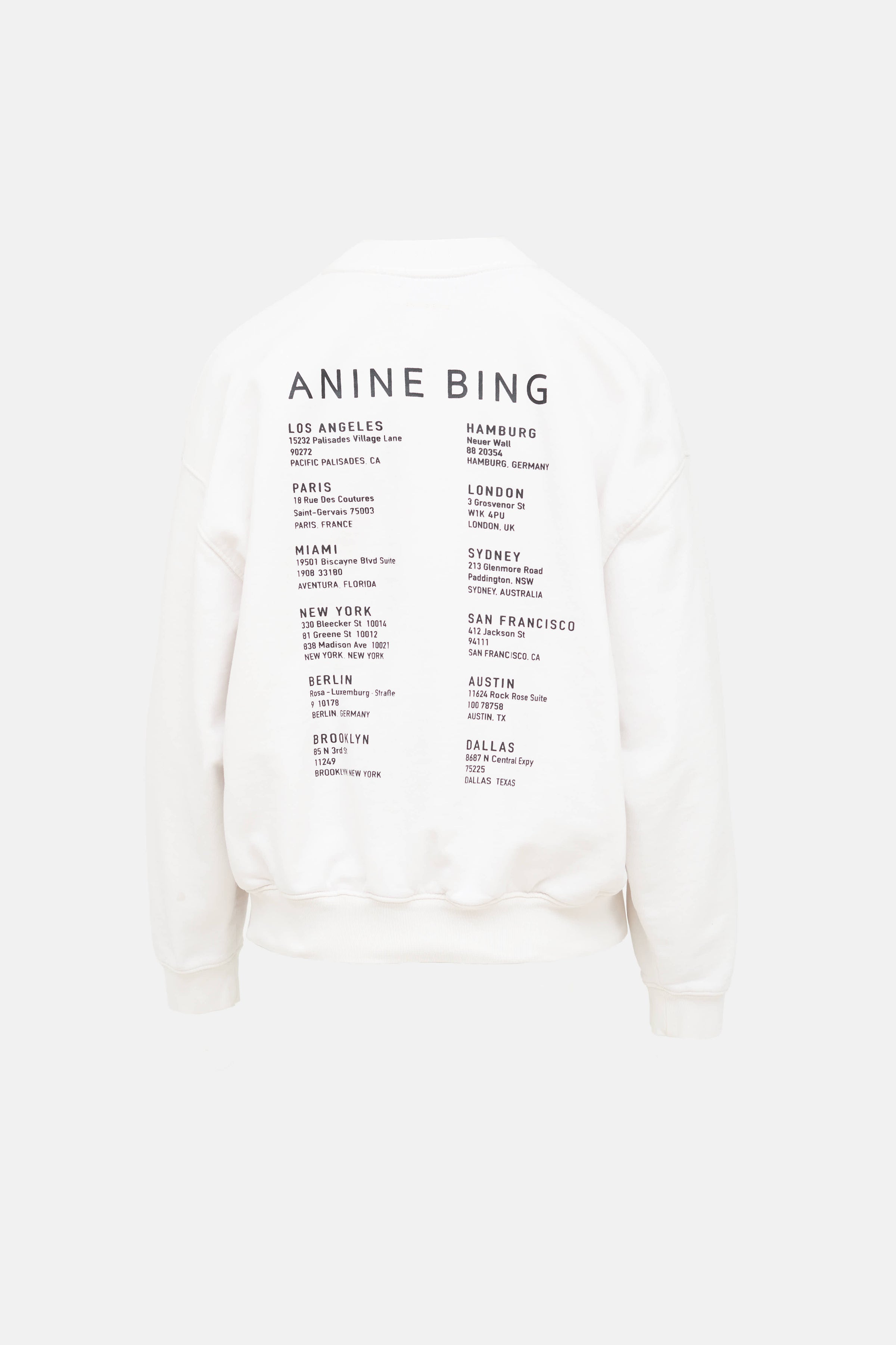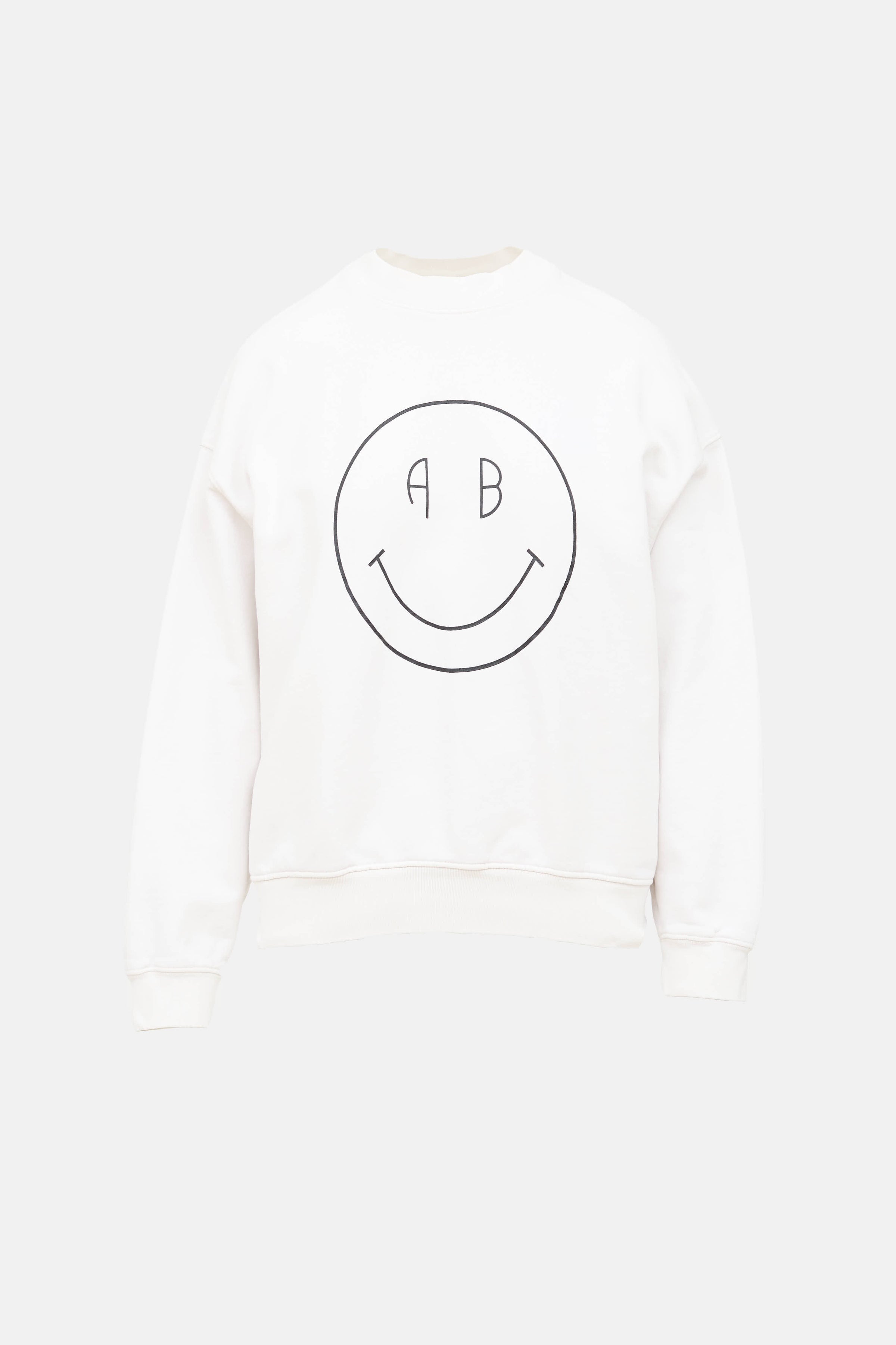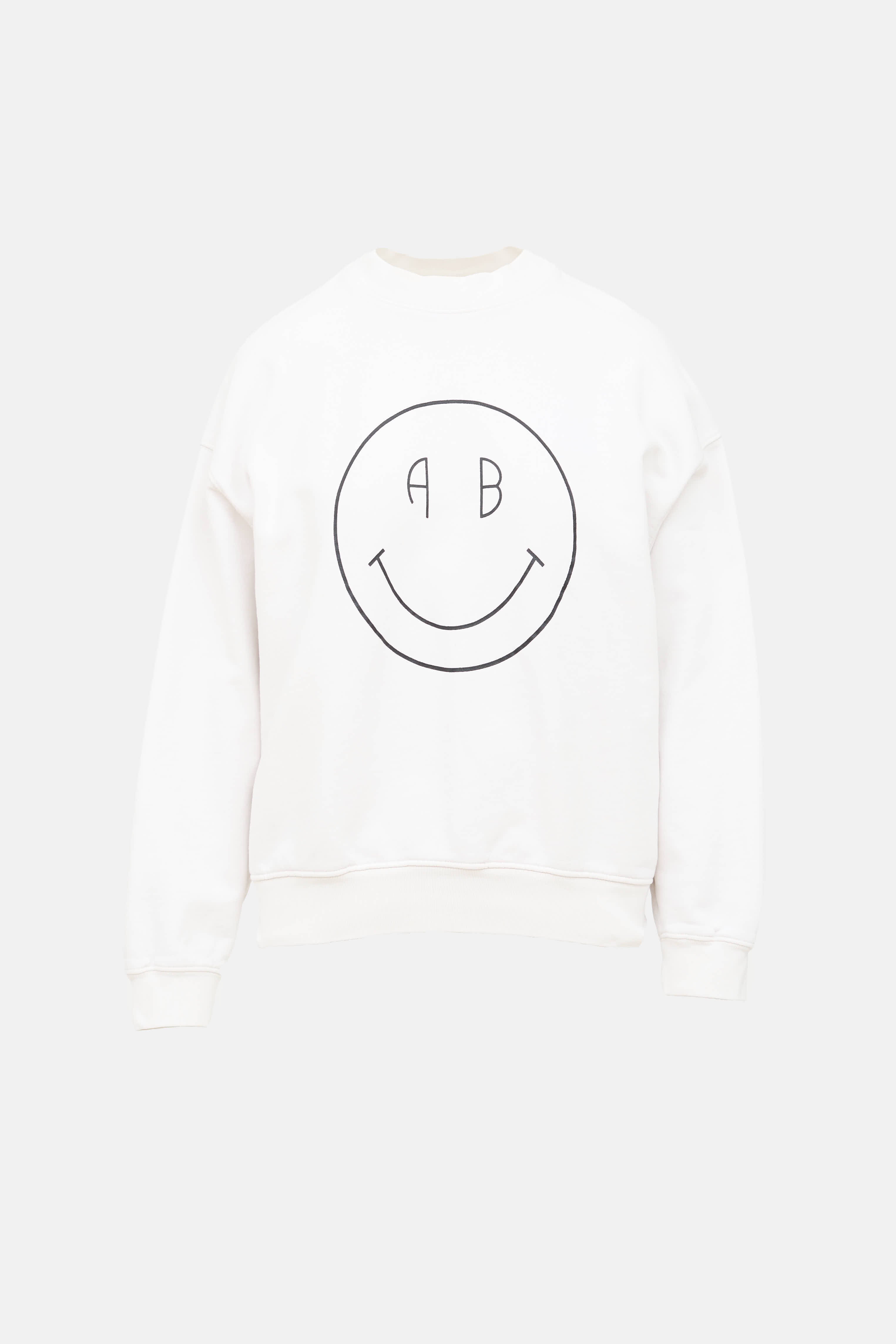 Pre-owned Anine Bing white sweatshirt featuring a black smiley face logo at front, store location graphic at back, crew neckline, long sleeves, debossed logo at back, and ribbed hem.