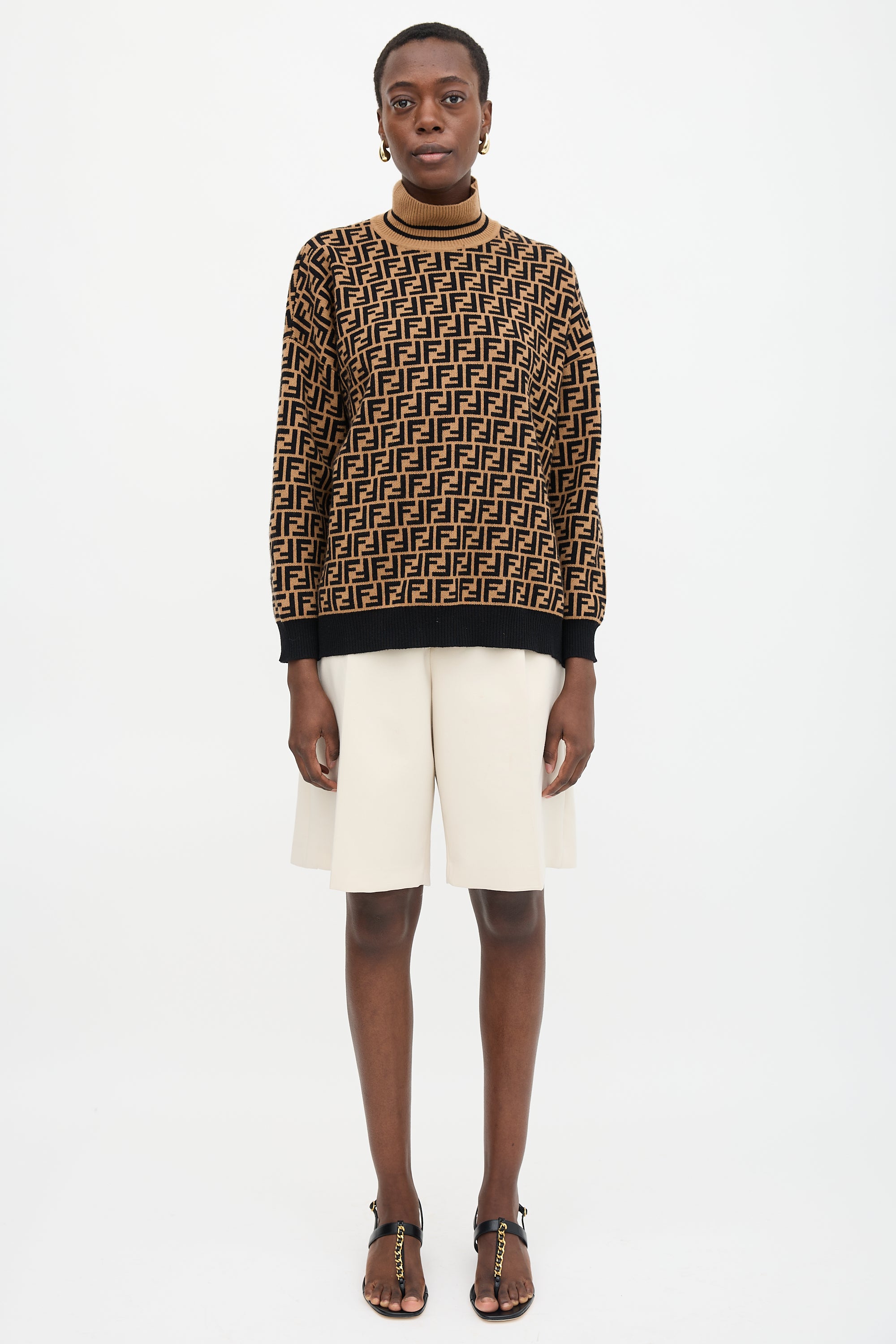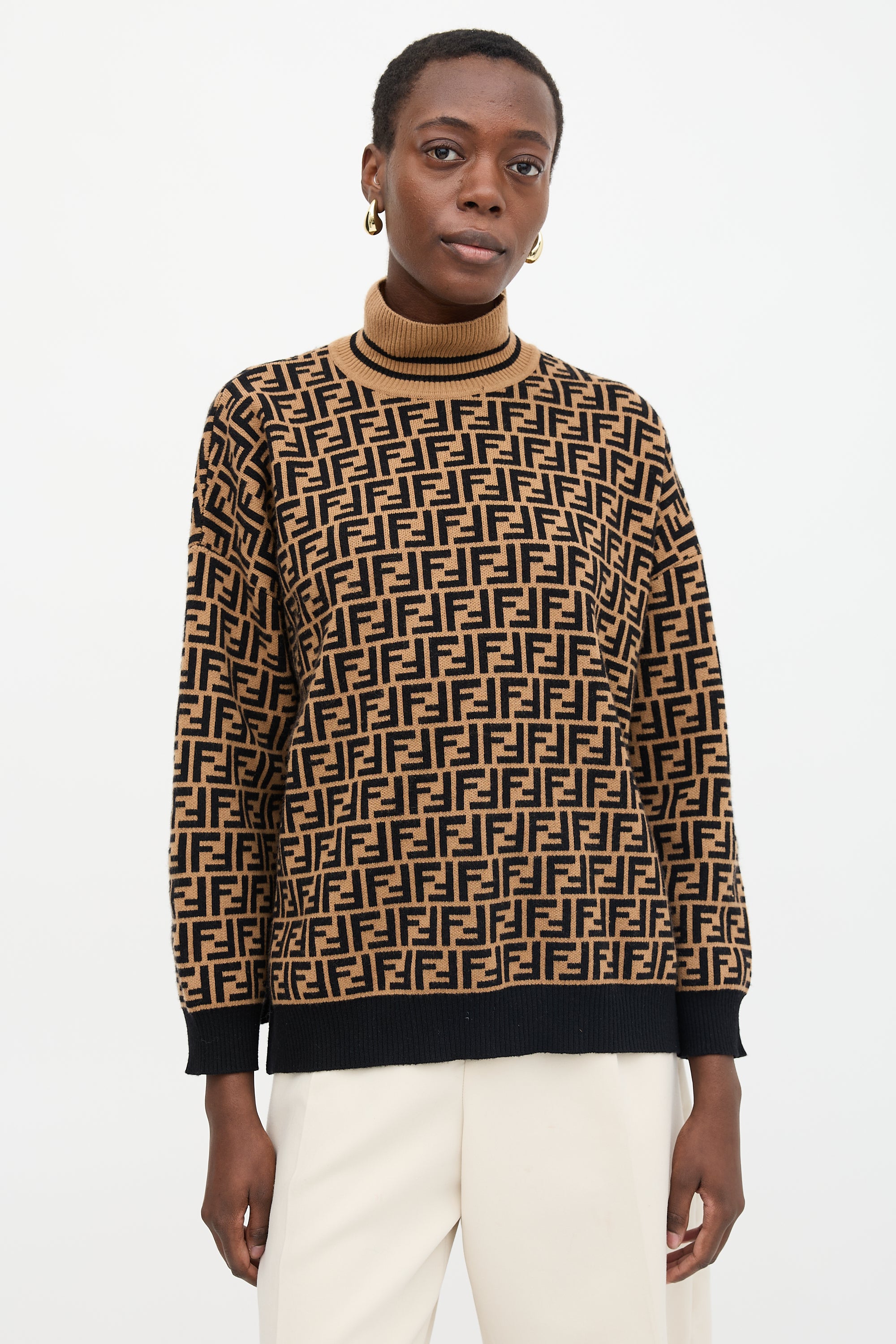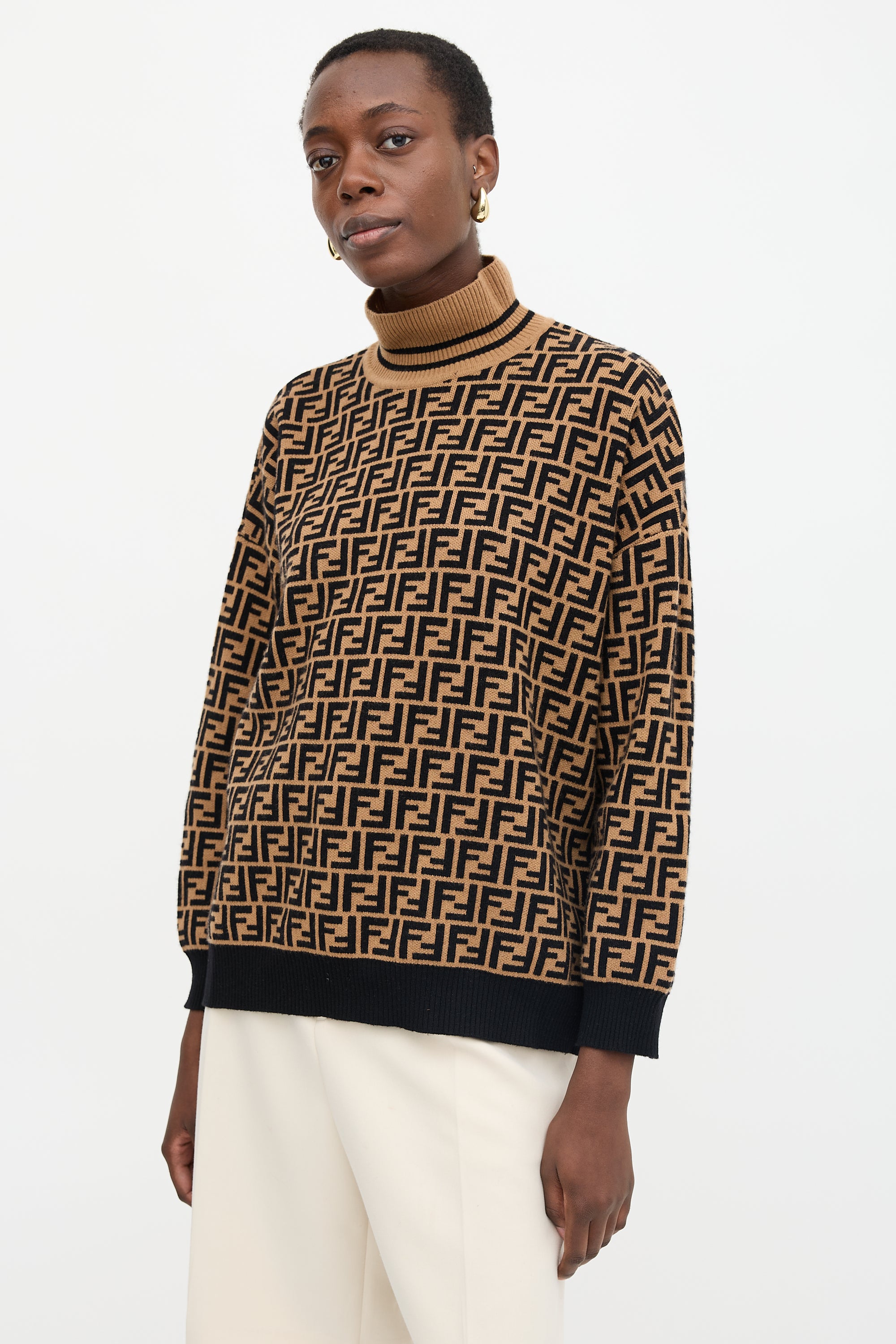 Pre-owned Fendi brown and black sweater featuring FF Zucca intarsia, turtle neck, side vents, and ribbed collar, hem, and cuffs.