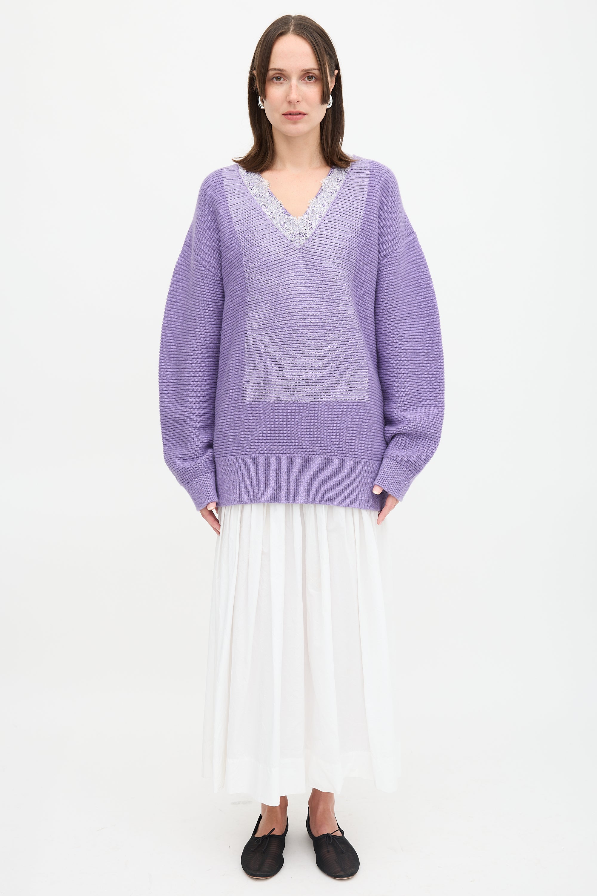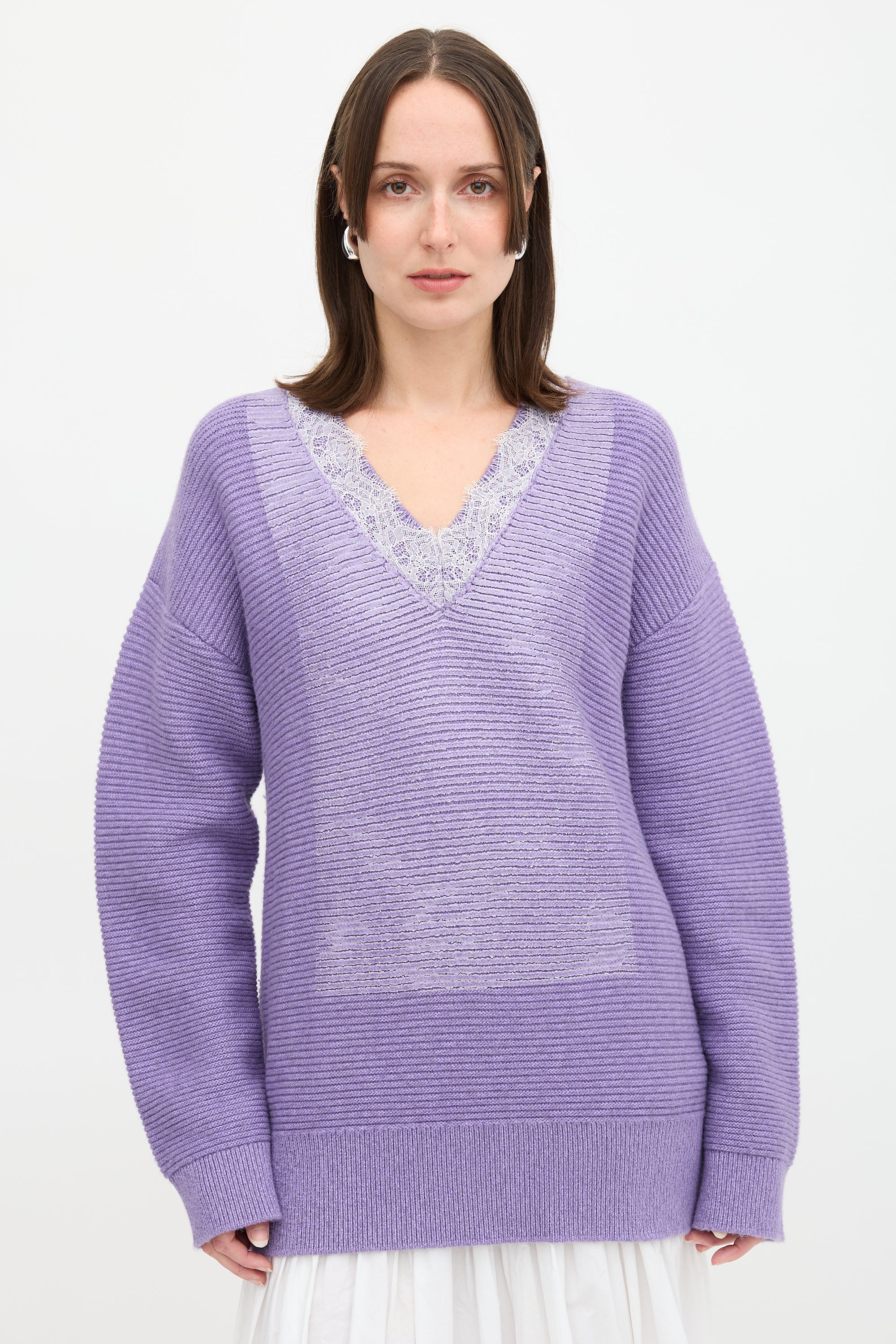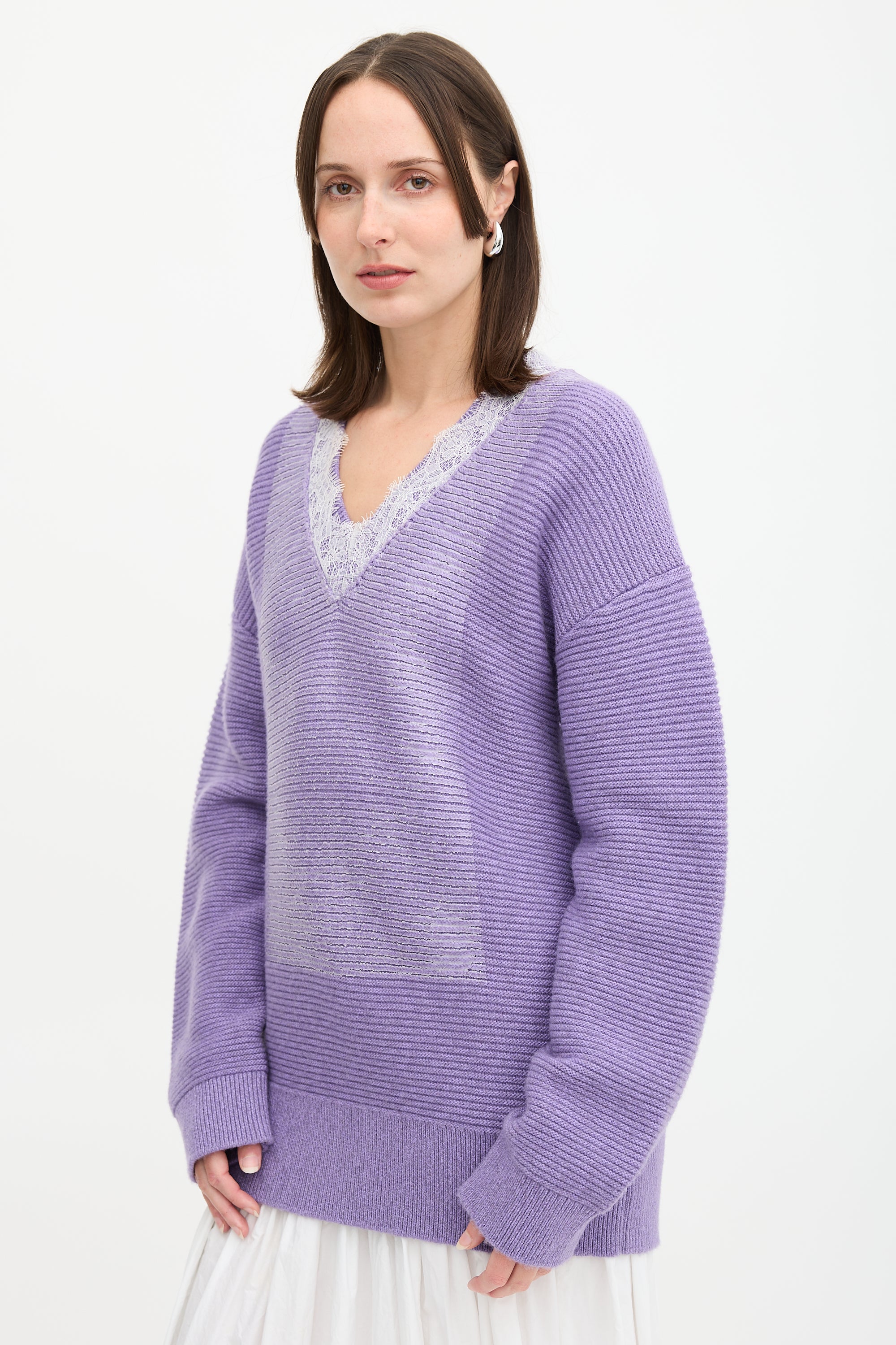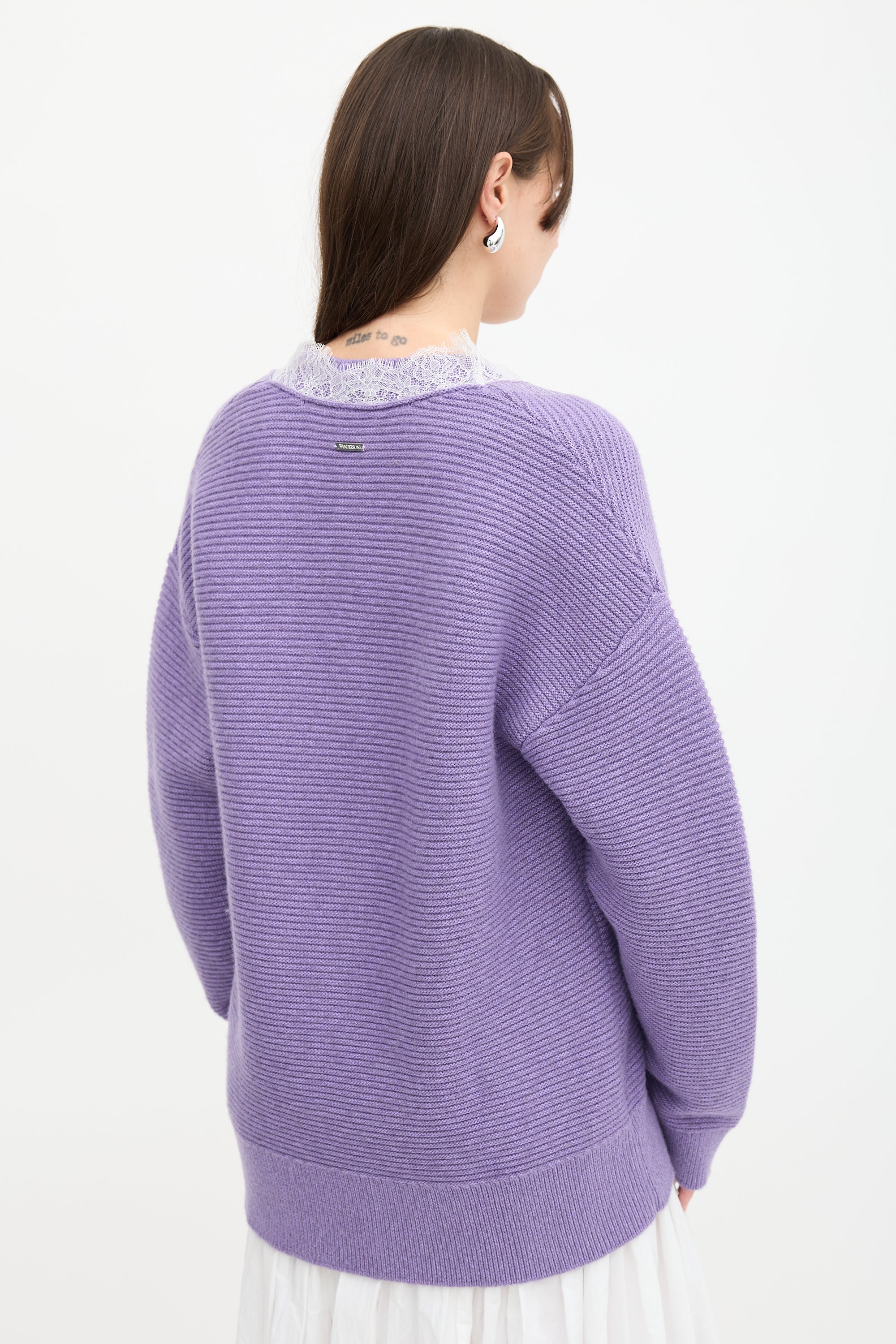 Pre-owned JW Anderson purple wool blend sweater featuring V-neckline with white lace trim, logo plaque at upper back, coated detail at front, and ribbed hem and cuffs.