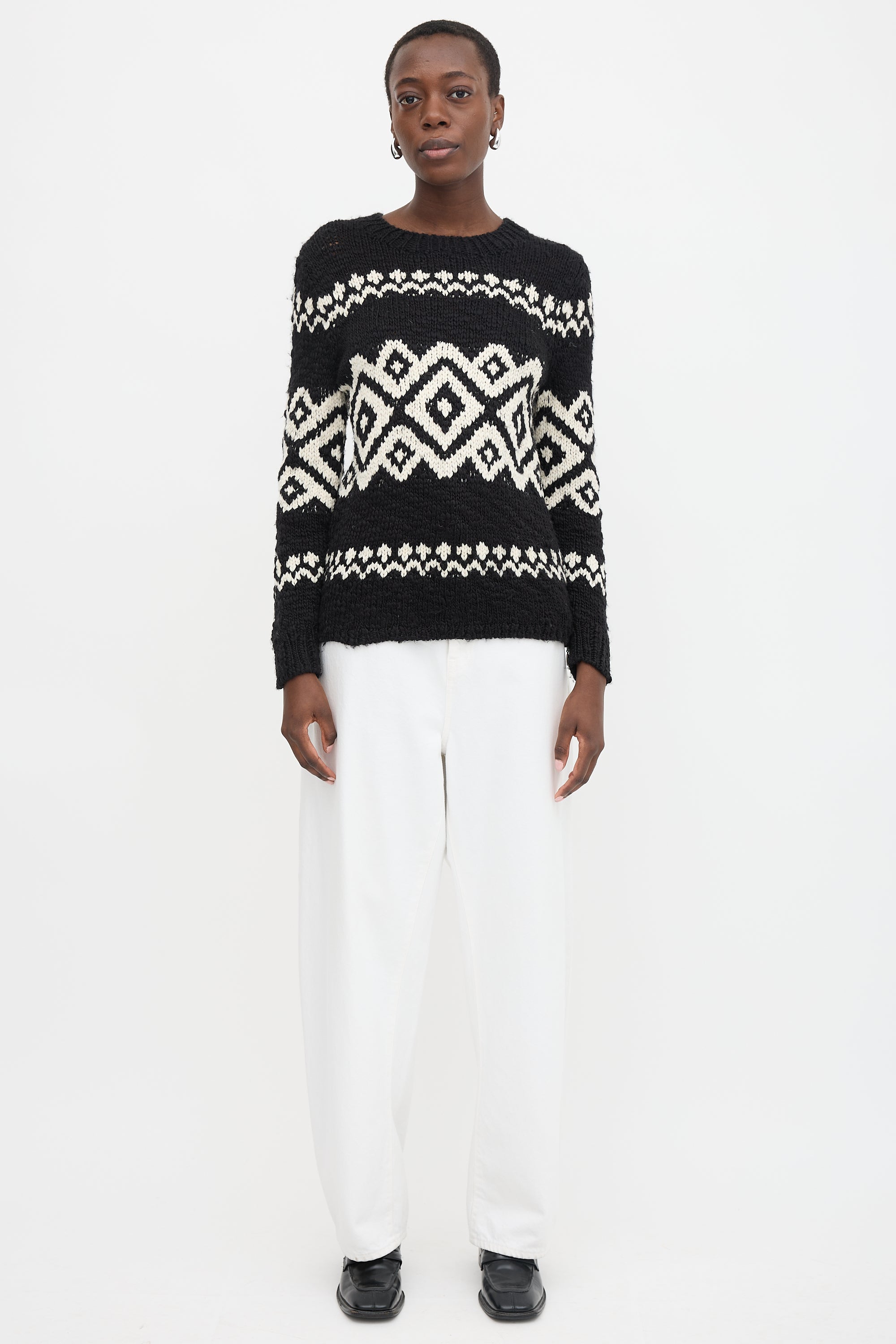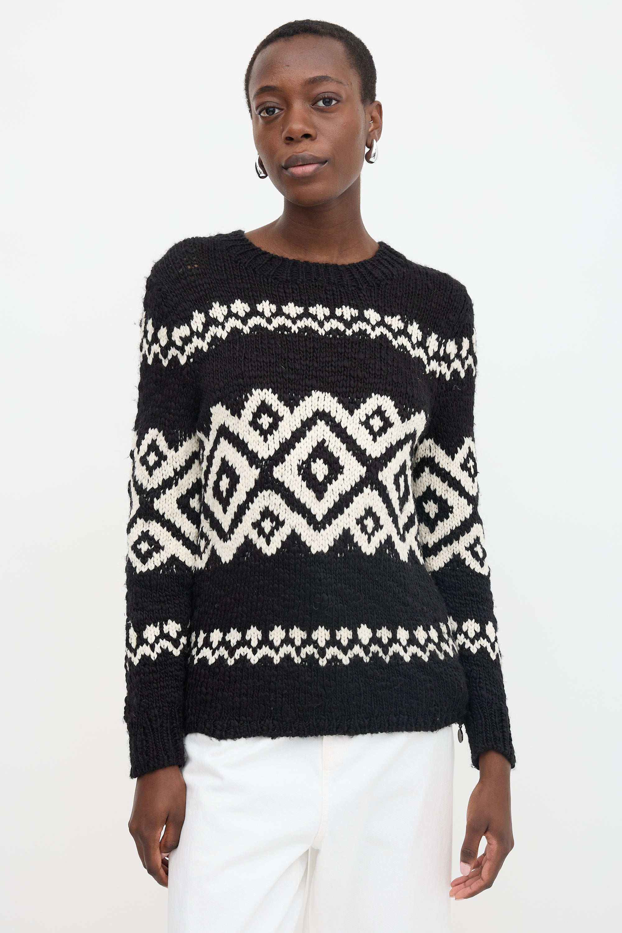 Pre-owned Moncler black and white wool sweater featuring a crew neckline, fair isle intarsia, felted logo patch at shoulder, nylon zippered gussets at sides, and a ribbed hem and cuffs.