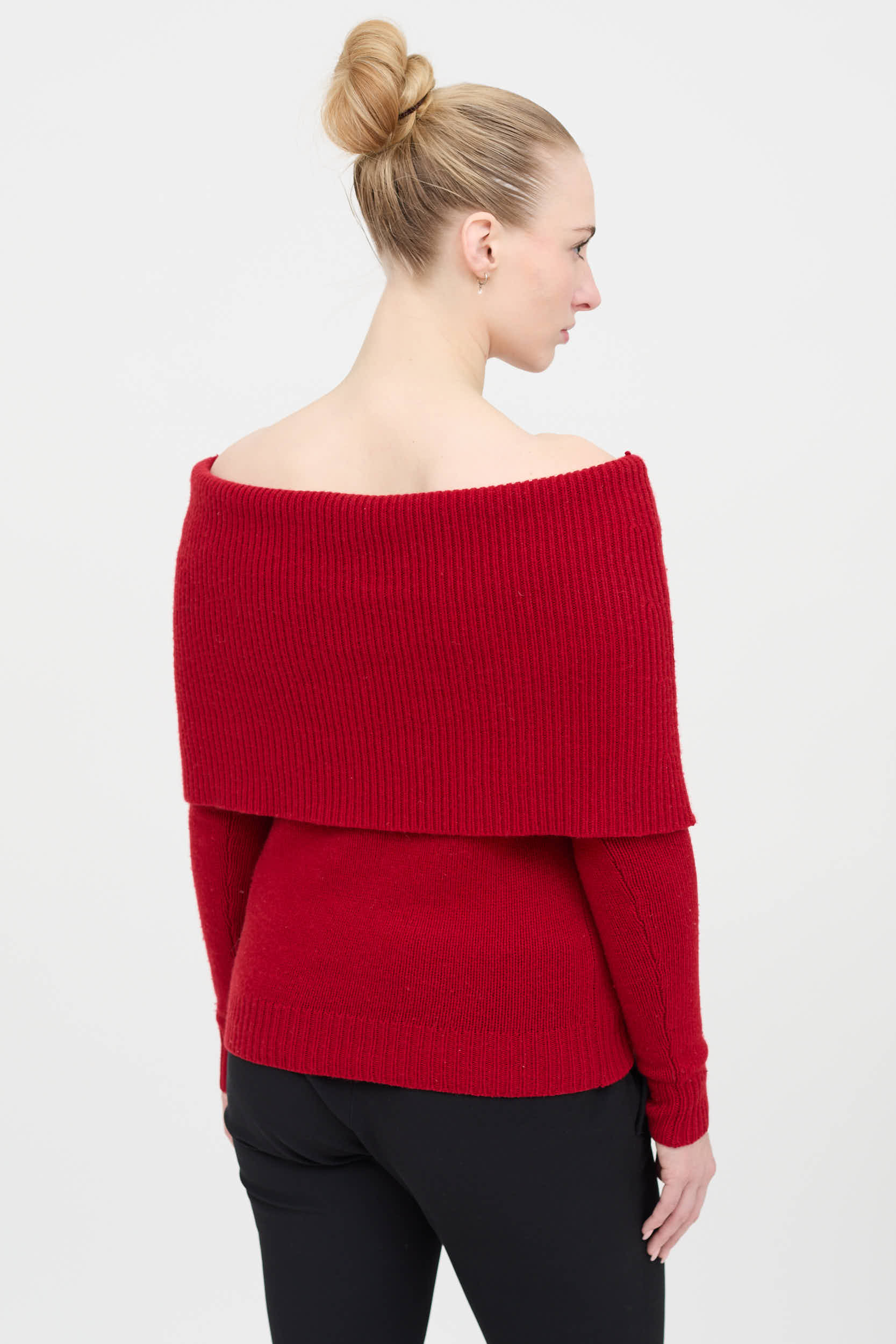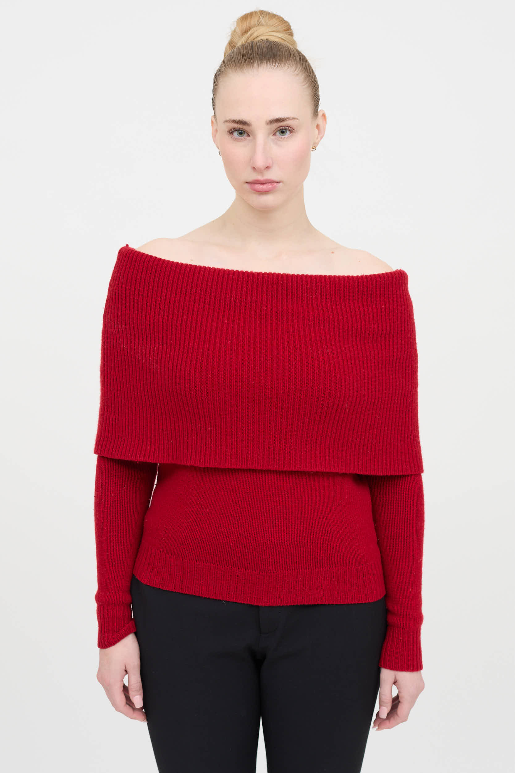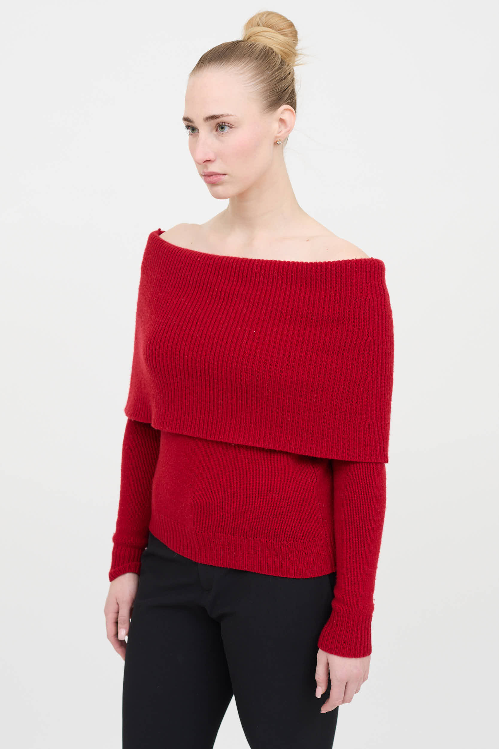Pre-owned Ralph Lauren red long sleeve cashmere sweater featuring off shoulder neckline, folded topline, and ribbed trims.