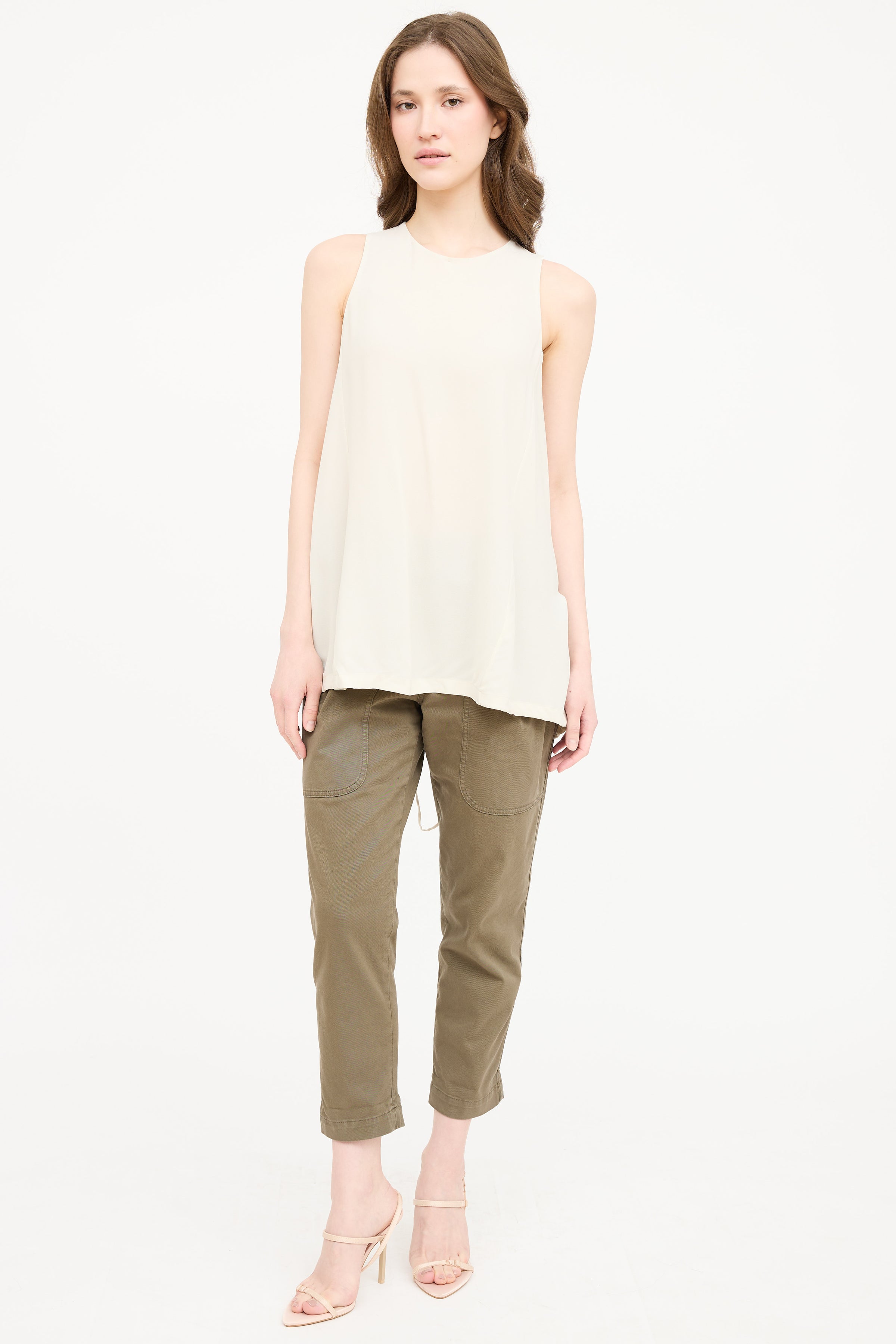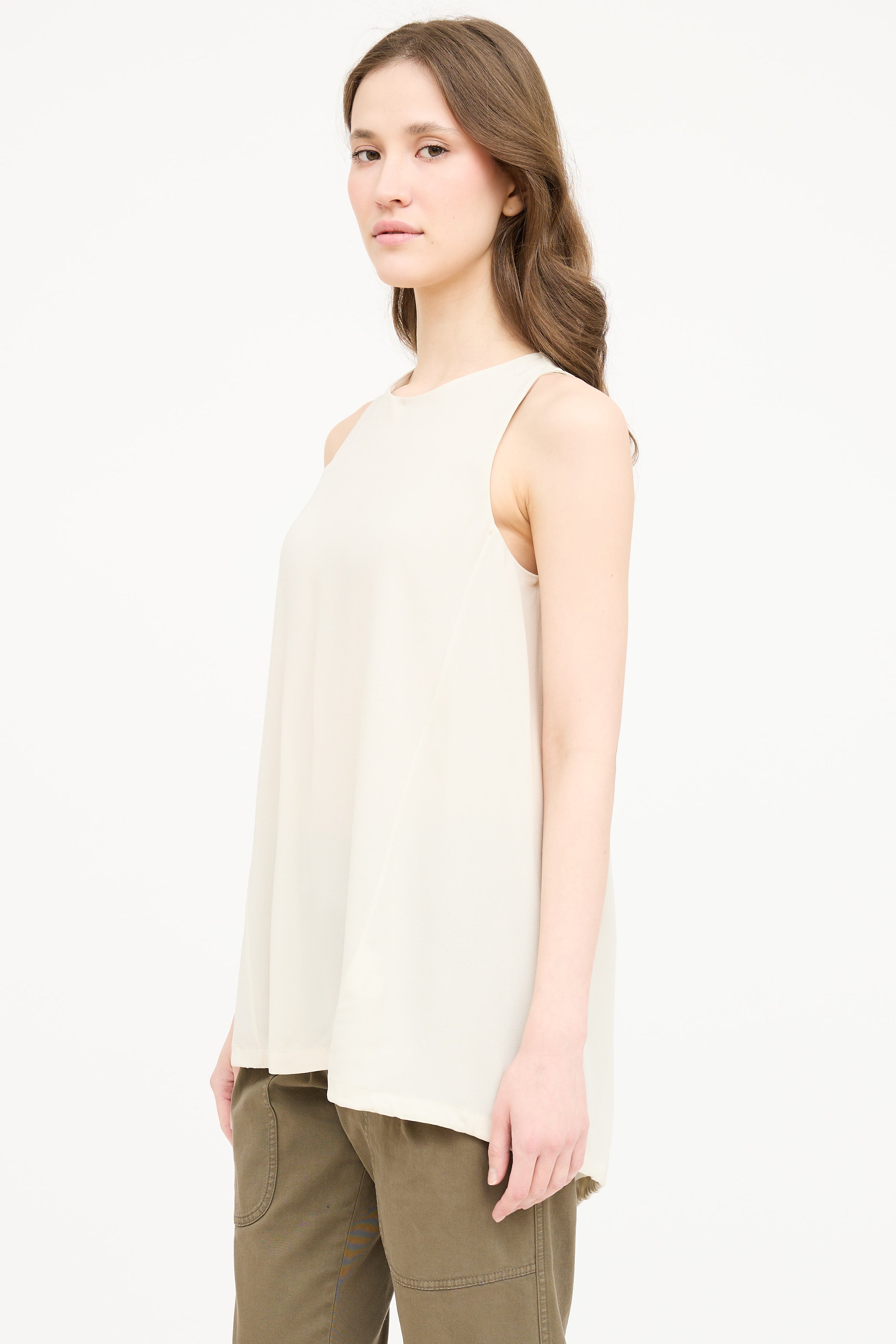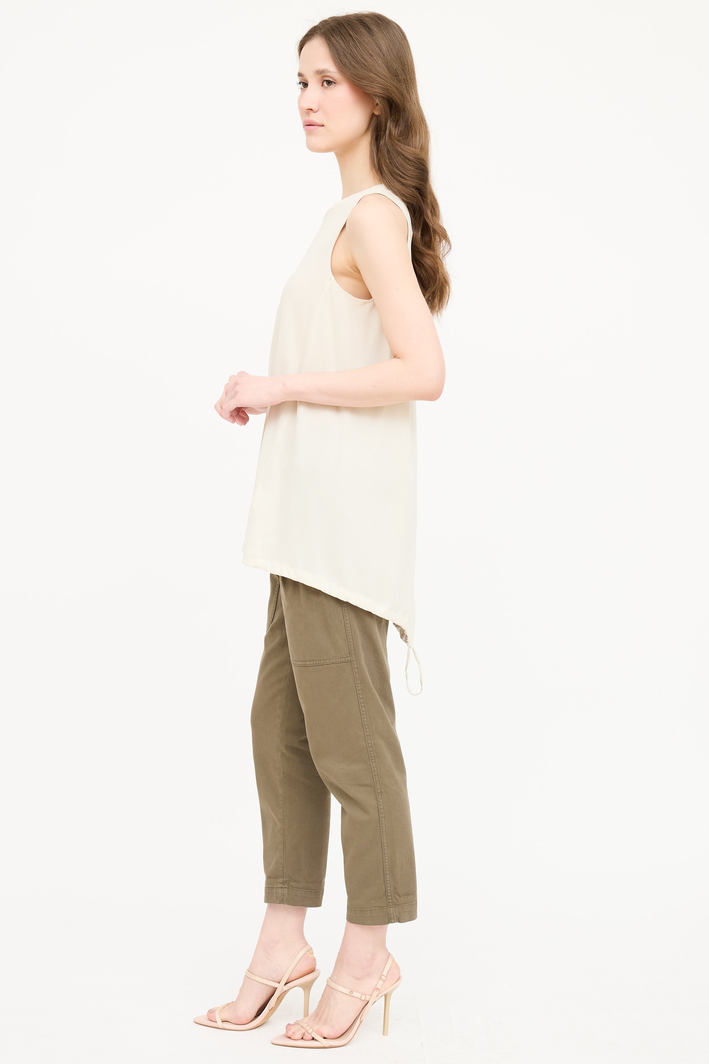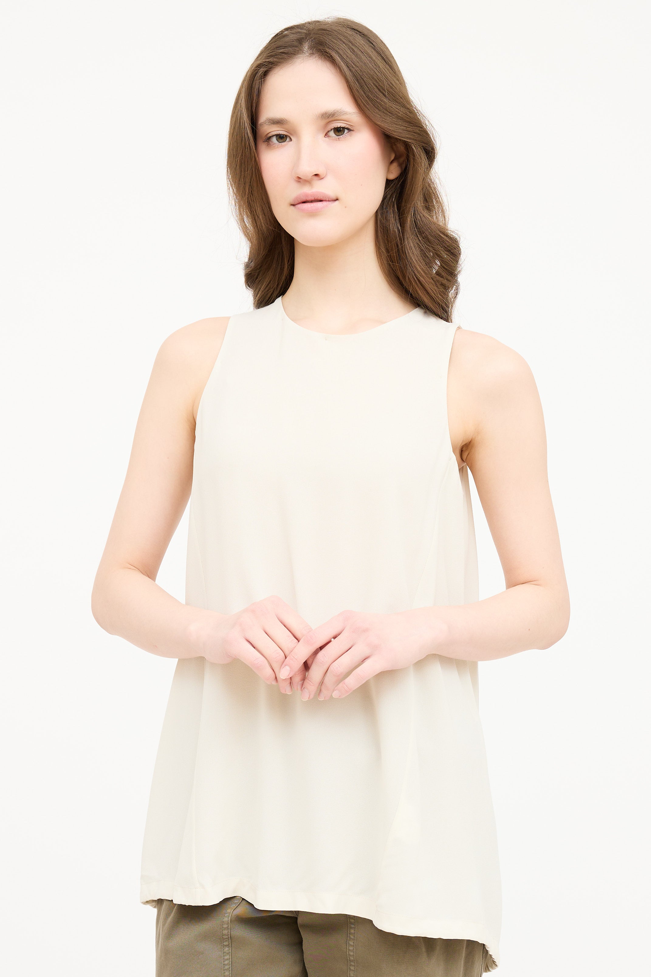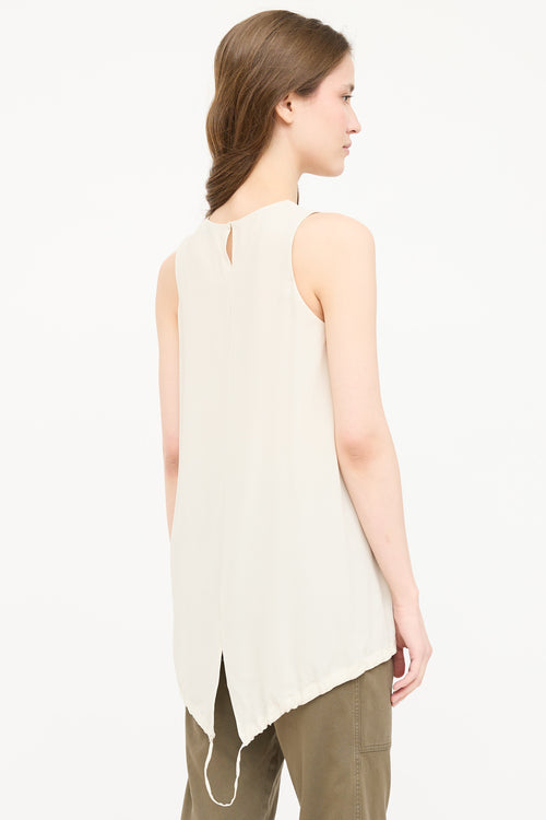 Pre-owned Brunello Cucinelli cream sleeveless top featuring round neckline, cinched drawstring at hem and buttoned keyhole closure at back.