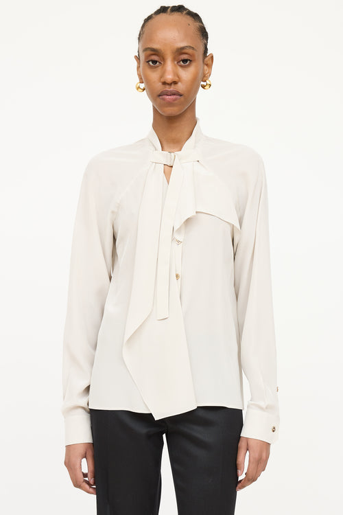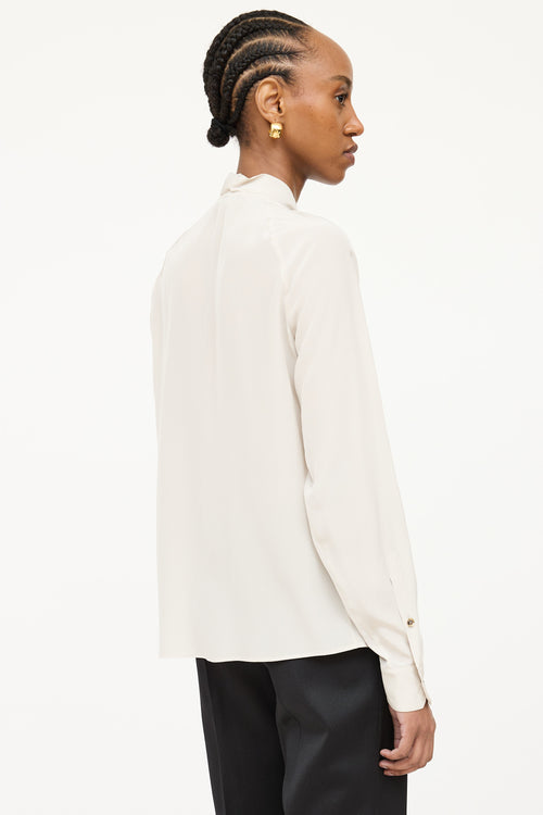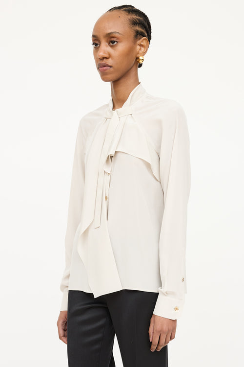 Pre-owned Gucci grey silk ruffled blouse featuring v-neck, draped ruffle at collar and front with d-ring, raglan sleeves, button up front, and buttoned cuffs.