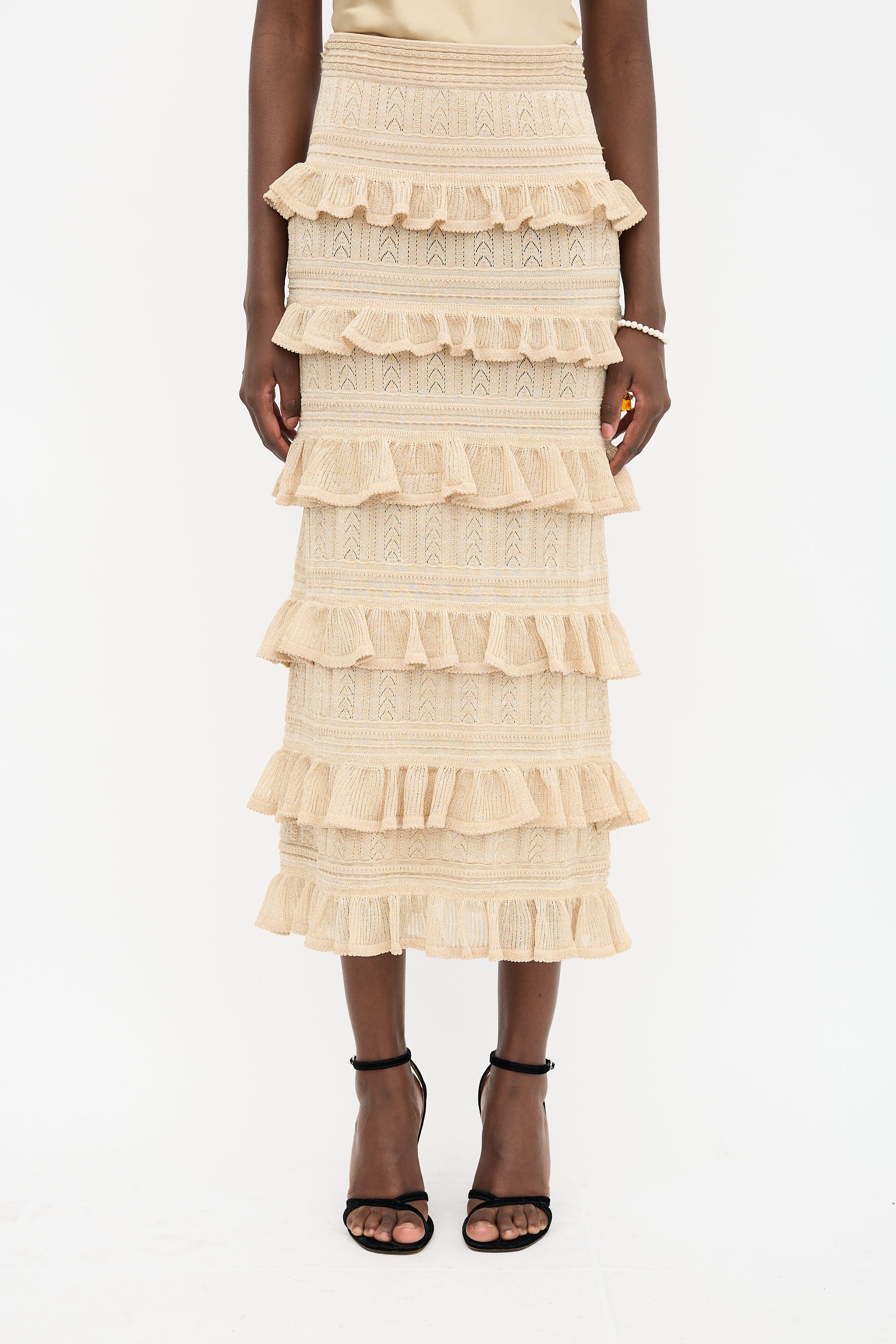 Pre-owned Zimmermann beige and metallic gold Matchmaker skirt featuring a pointelle knit design, elasticized waistband, and ruffle tiers. Unlined.