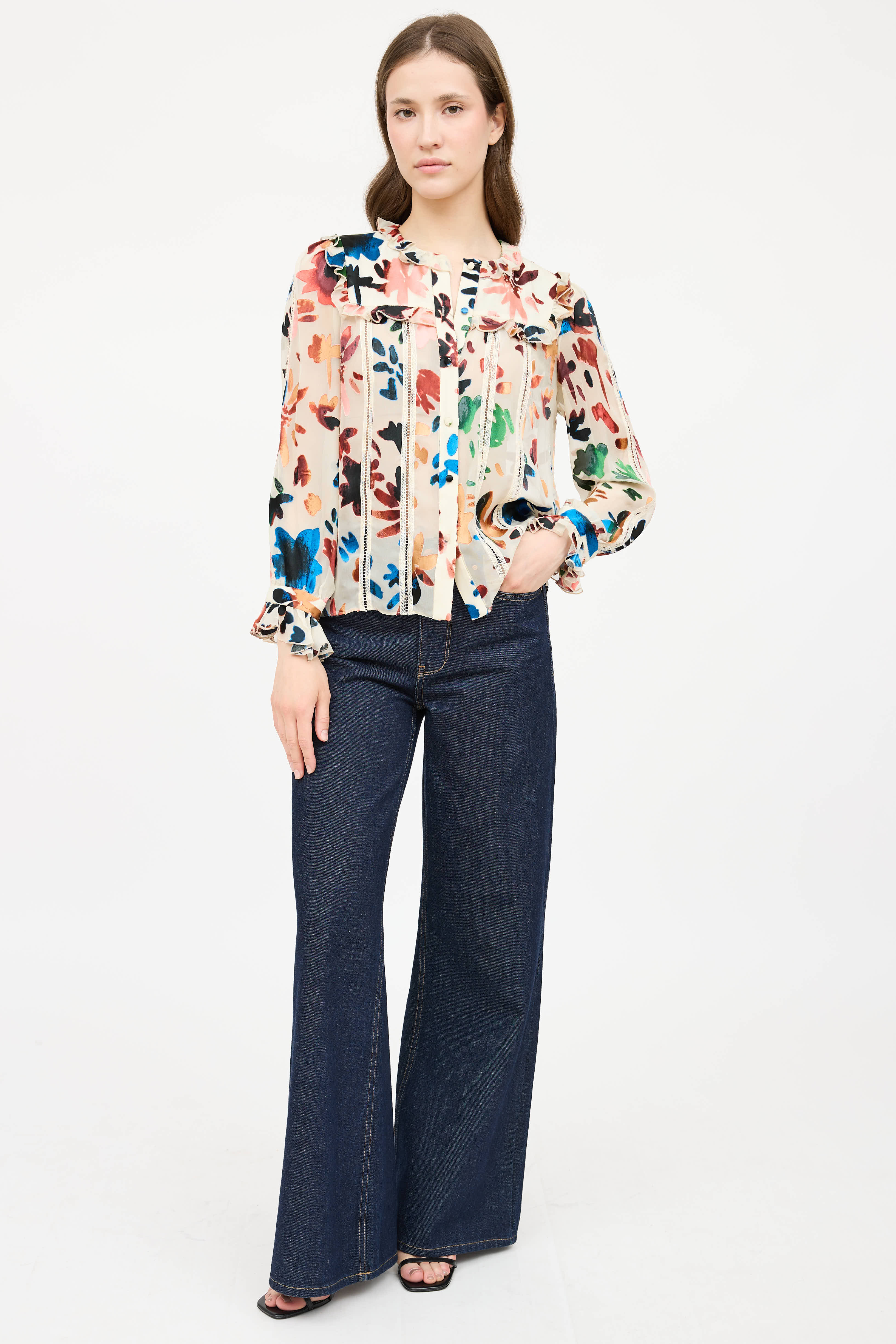 Pre-owned Alice + Olivia cream and multicolor long sleeve blouse featuring round neckline with ruffle trim, bib collar, button front, embroidered detail throughout, button sleeves with ruffle cuffs, and textured pattern.