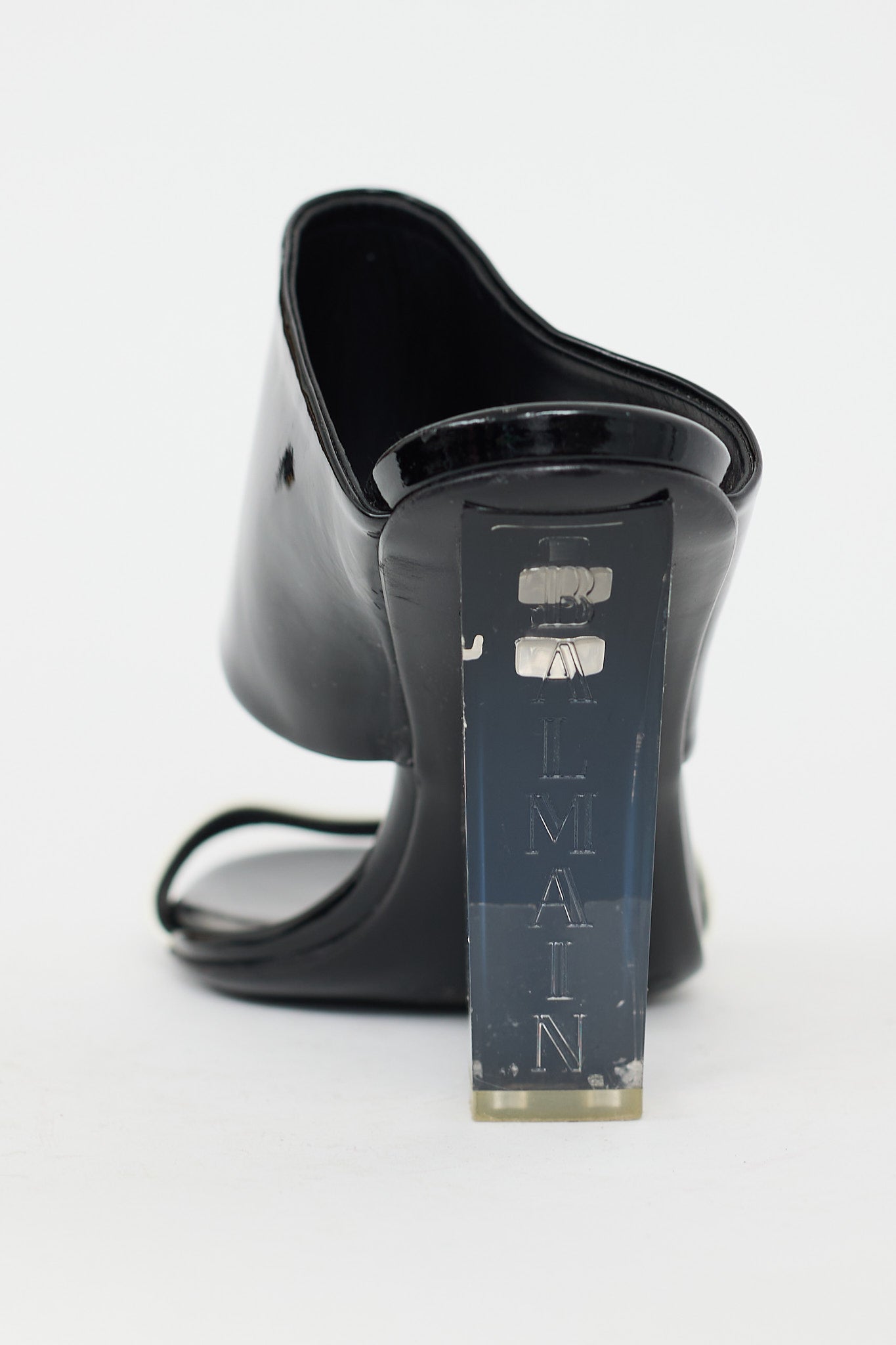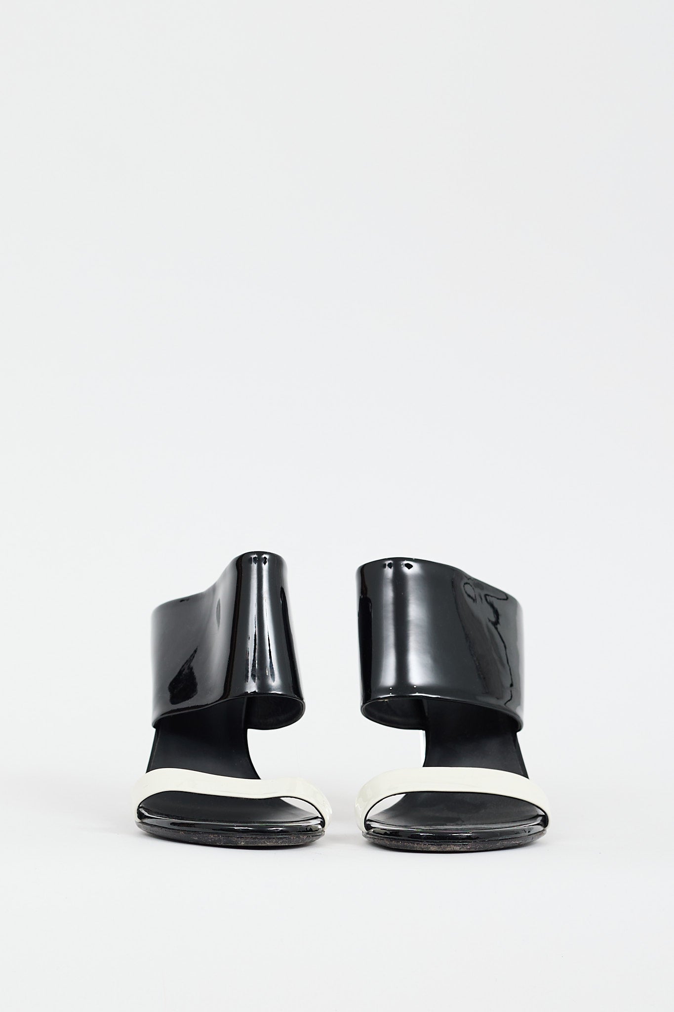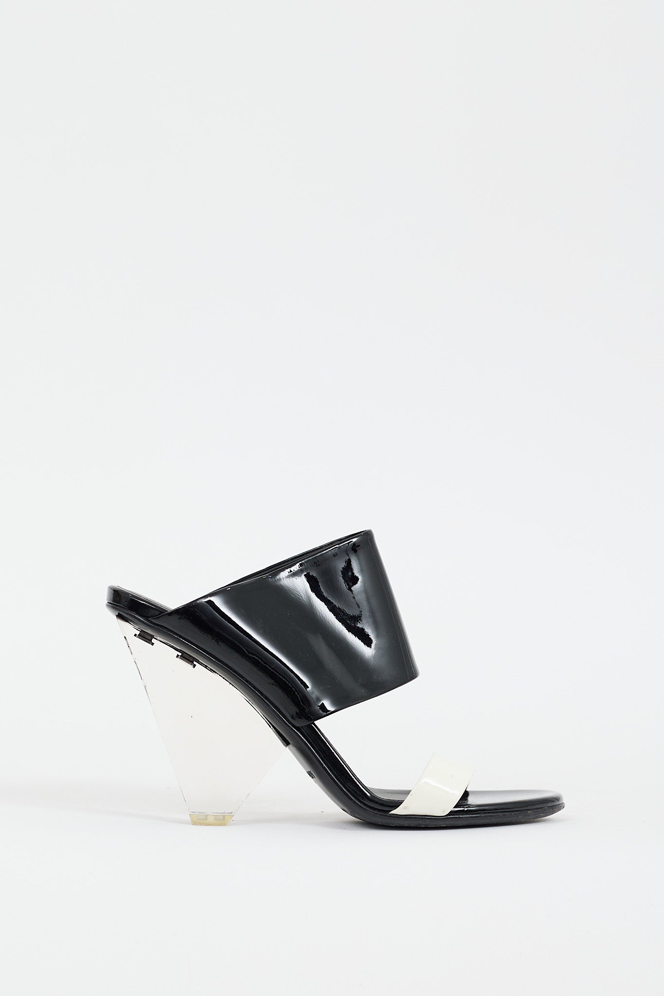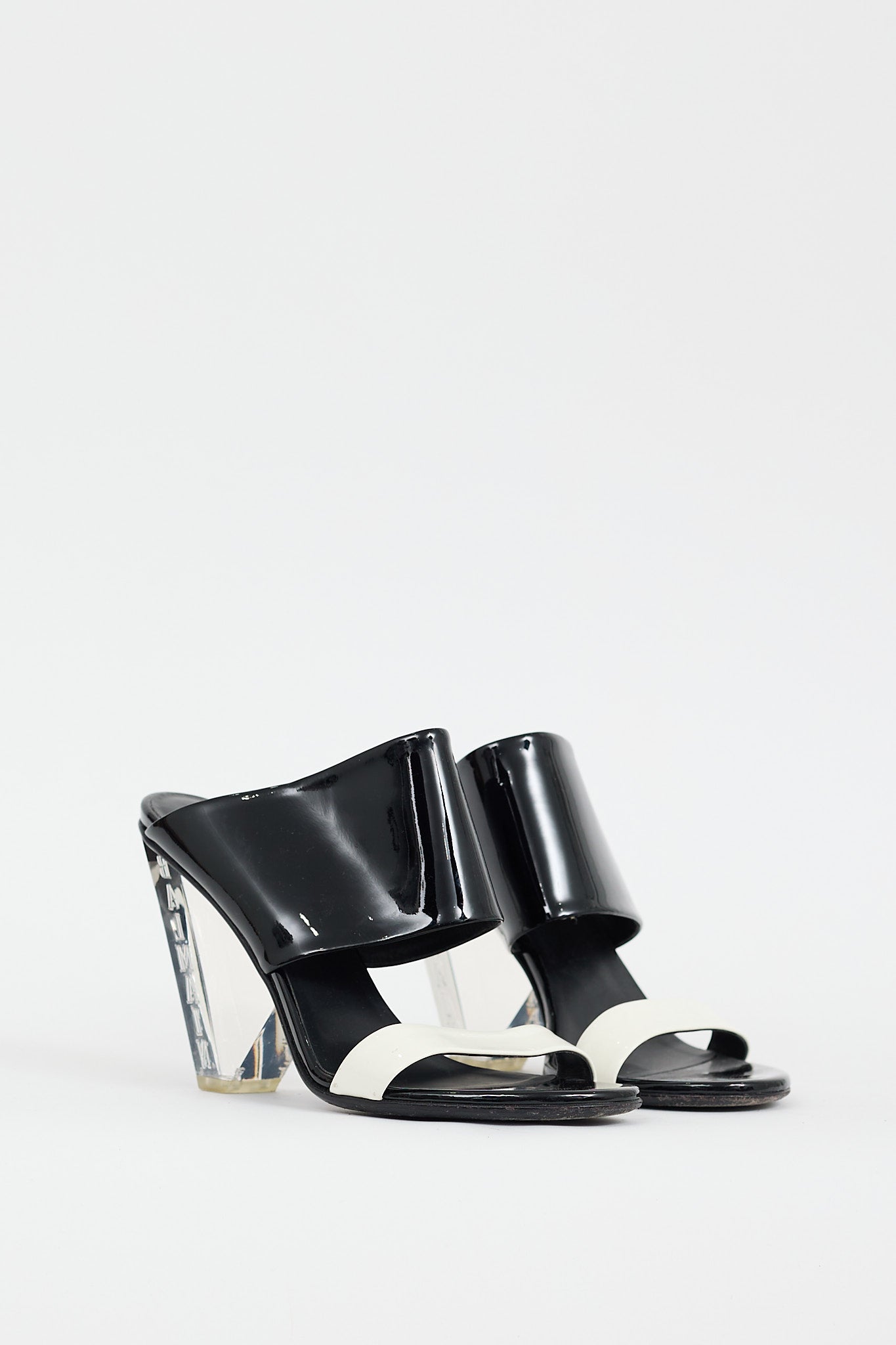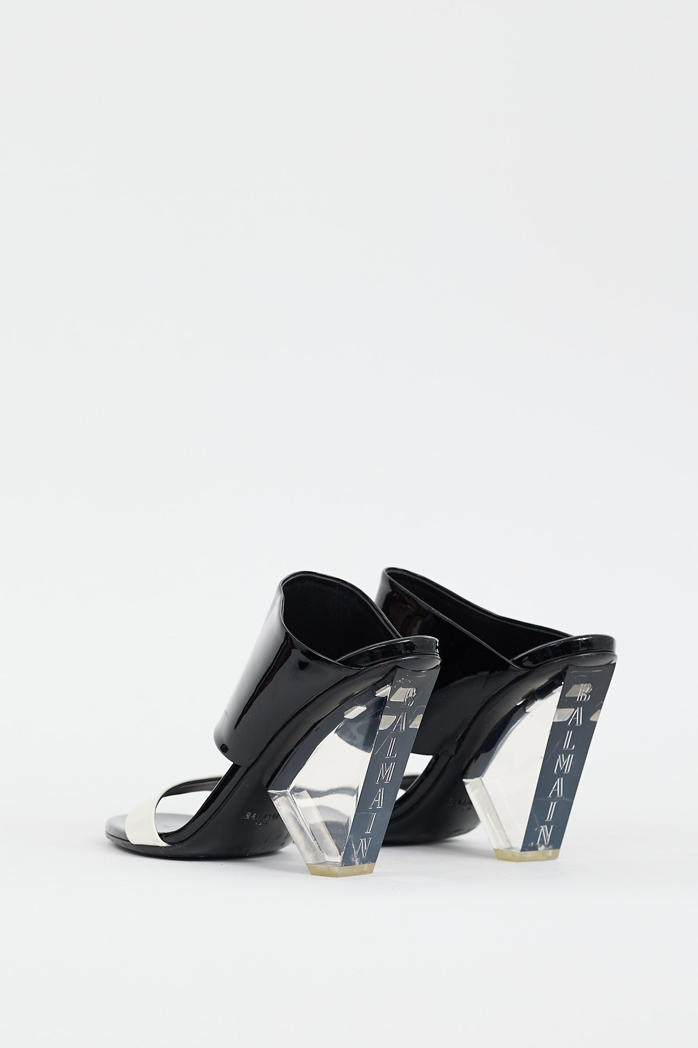 Pre-owned Balmain black and white Lory heels featuring an open rounded toe, patent leather upper, strap across vamp, wide strap across instep, and angular perspex heel with engraved logo.